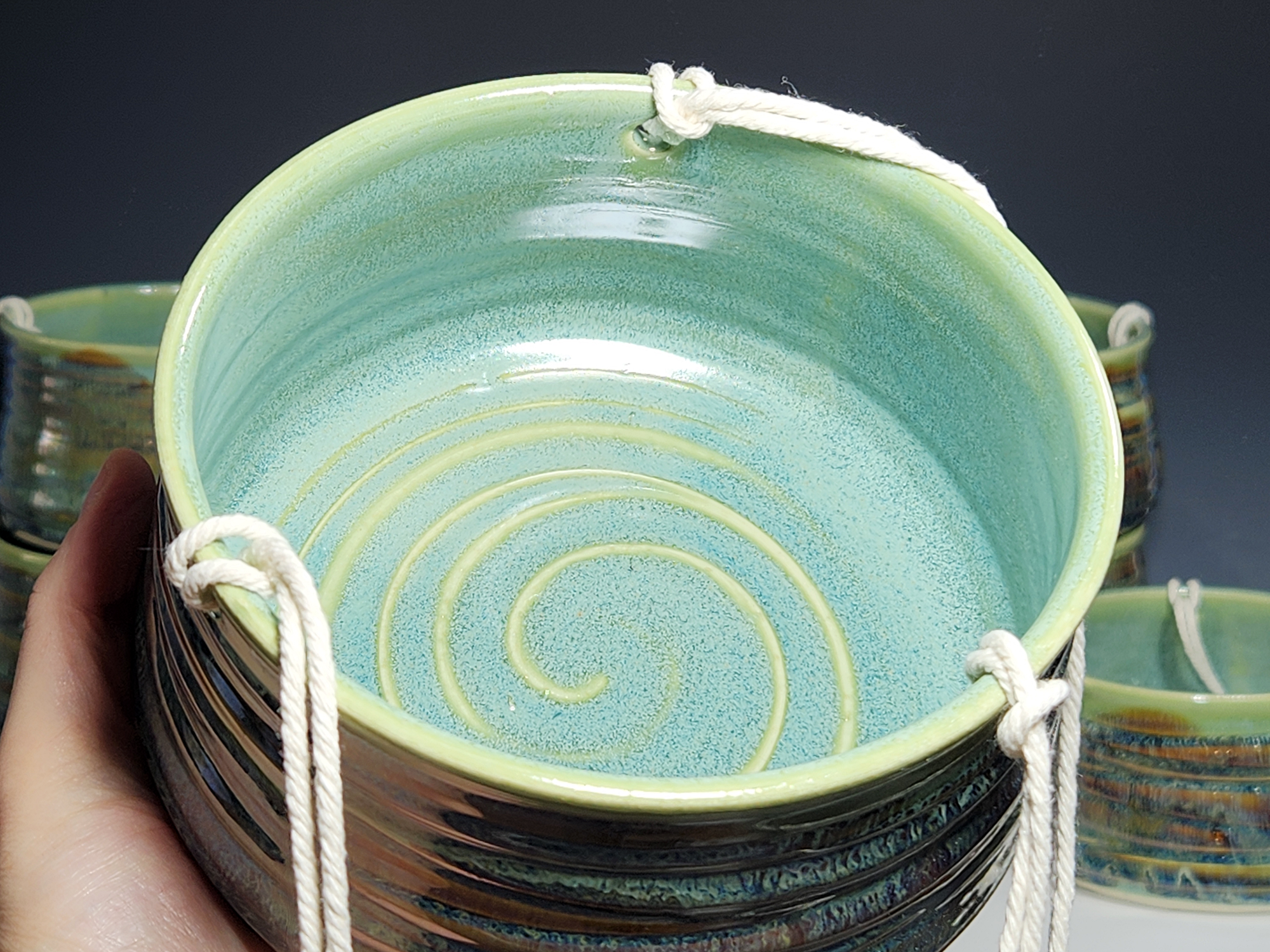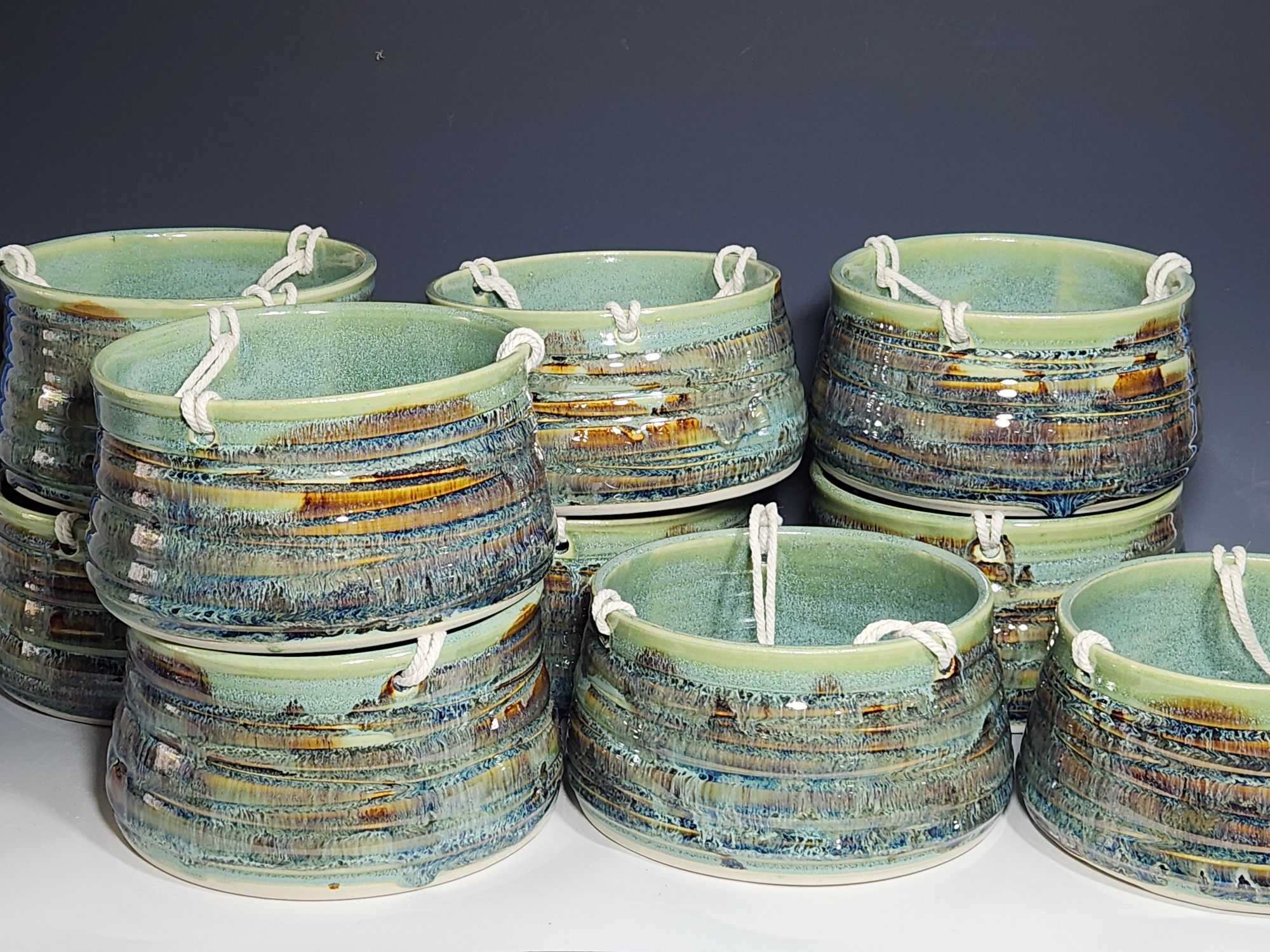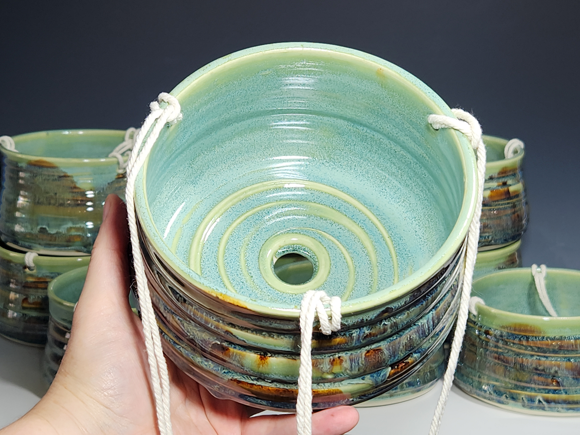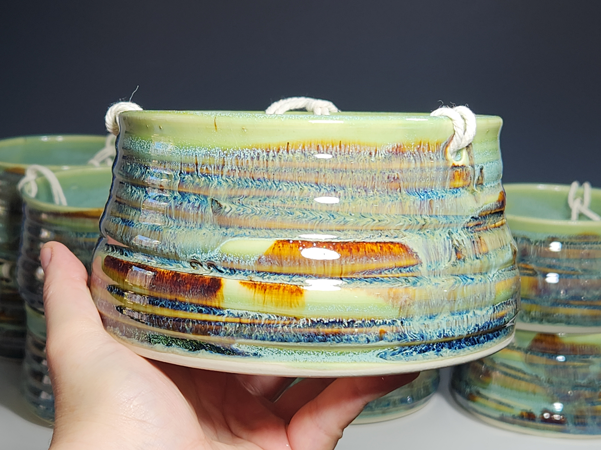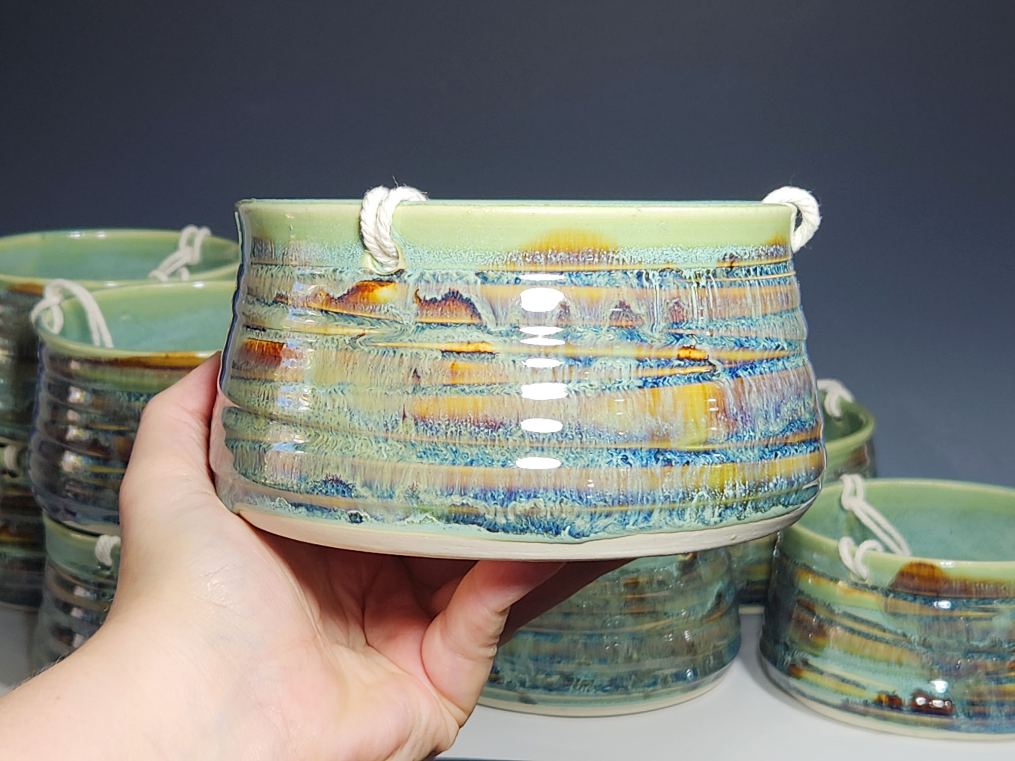 All dressed up in my glaze combination, “Sea Foam,” this medium-sized hand-thrown ceramic hanging planter holds your plant for safekeeping. Gorgeous, complex glaze of green over iron glows and highlights the texture of the well-made form. Outdoor hanging planters include a drainage hole. Indoor hanging planters have no drainage. Each planter has a secure hanging rope with a simple knot at the top. They make a great birthday, wedding, or housewarming gift.