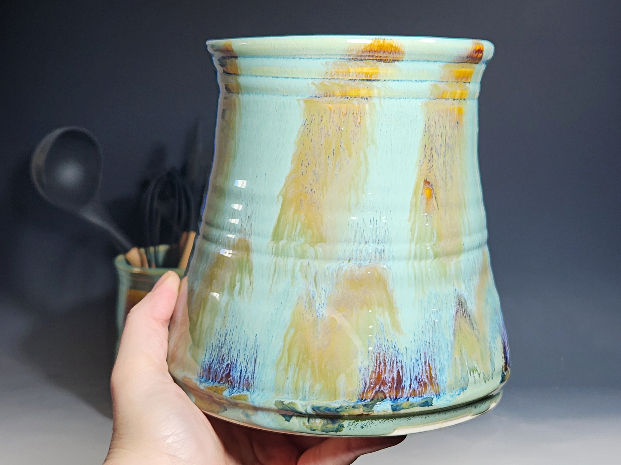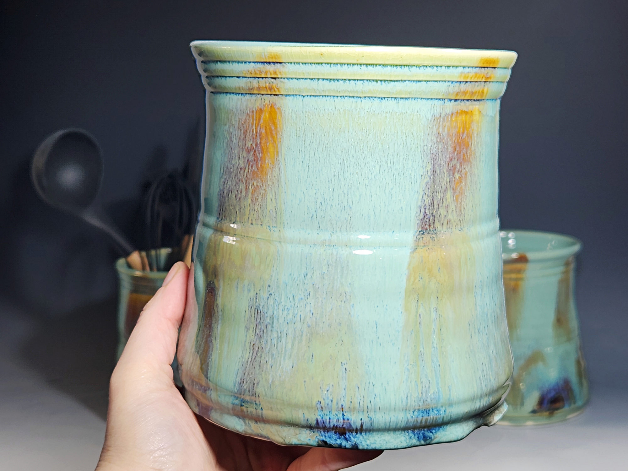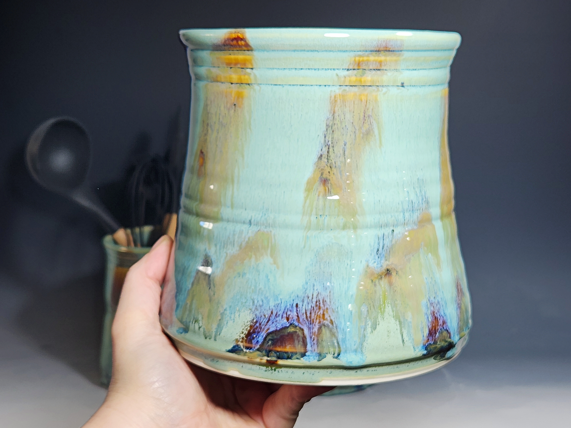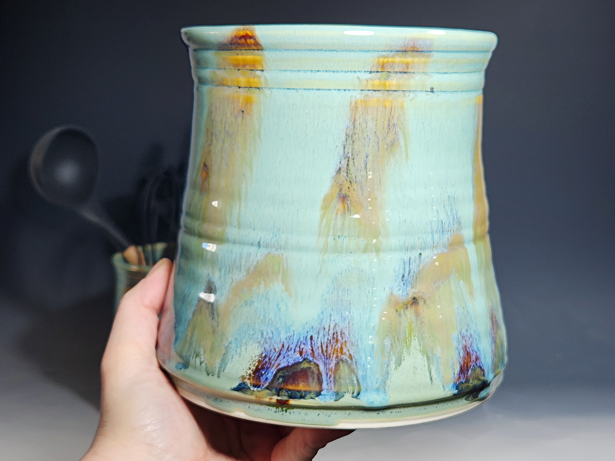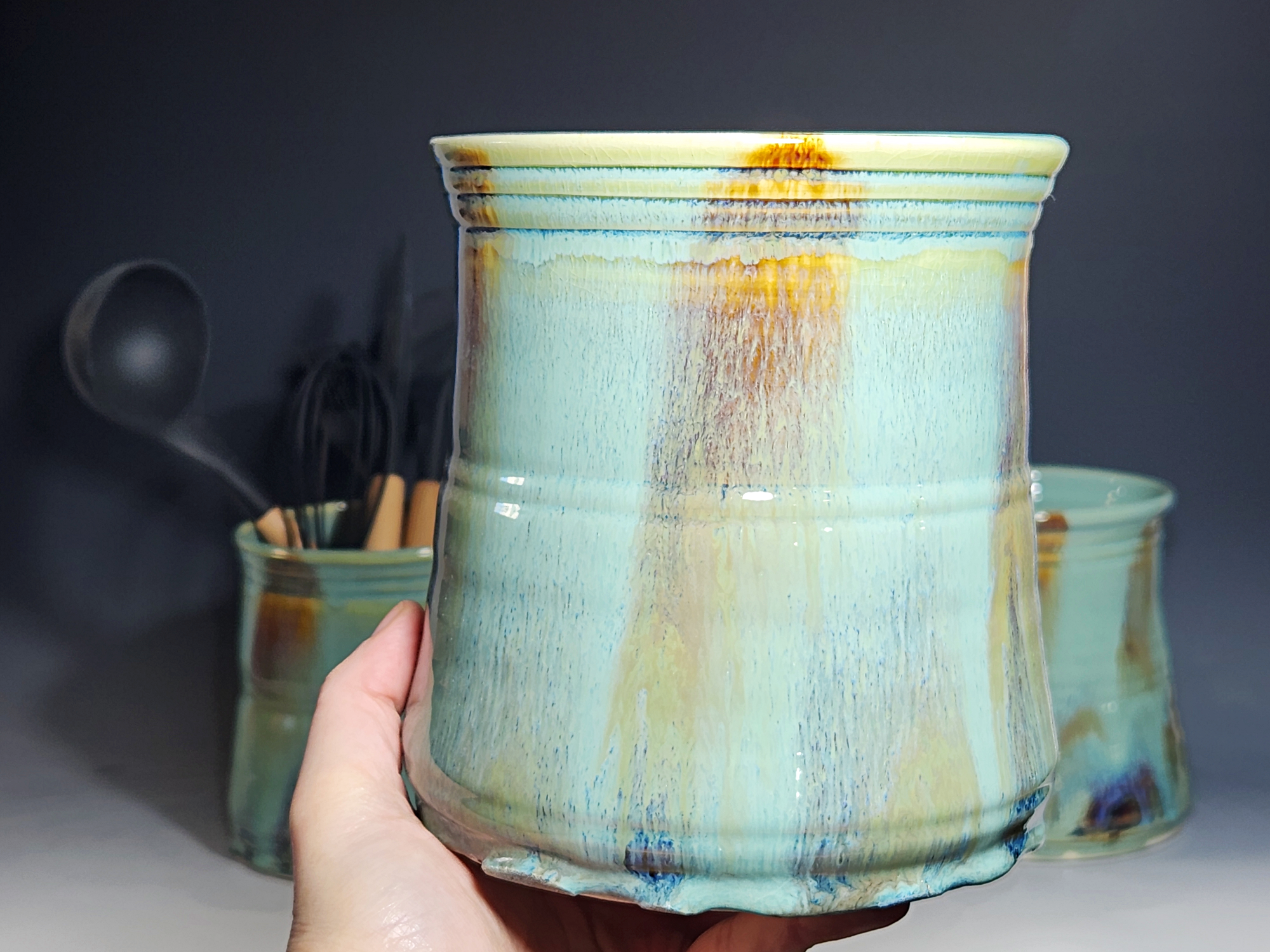 This piece is what I call a “beautiful second,” flawed, but still functional, beautiful, and safe. This wheel-thrown ceramic utensil holder is all dressed up in my most popular glaze combination, “Caribbean.” Lots of texture and movement in this glaze combo, and the unusual color combination seems to glow from within. Sturdy base that won’t tip over. Plenty of room for lots of utensils! Beautiful on a kitchen counter or in an art room for your creative tools!