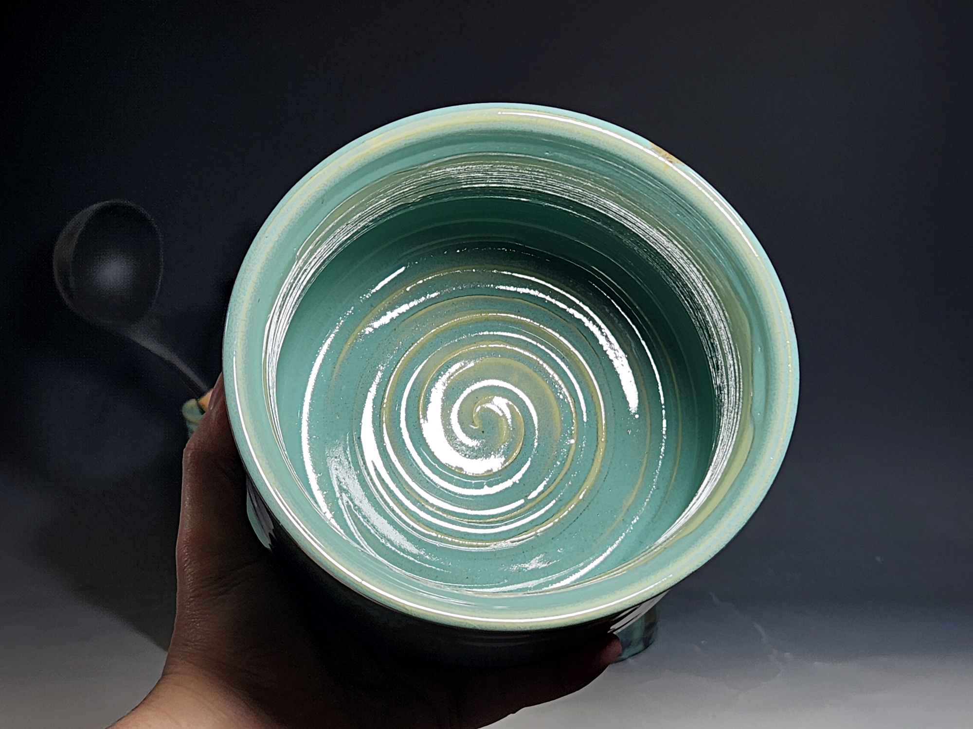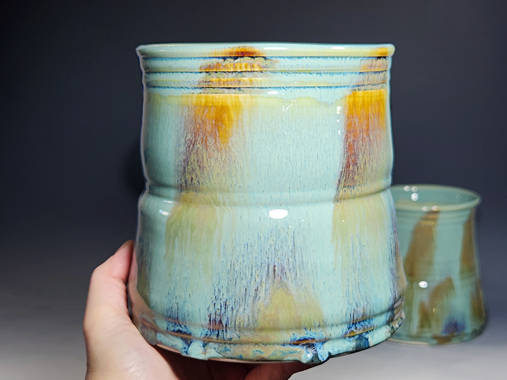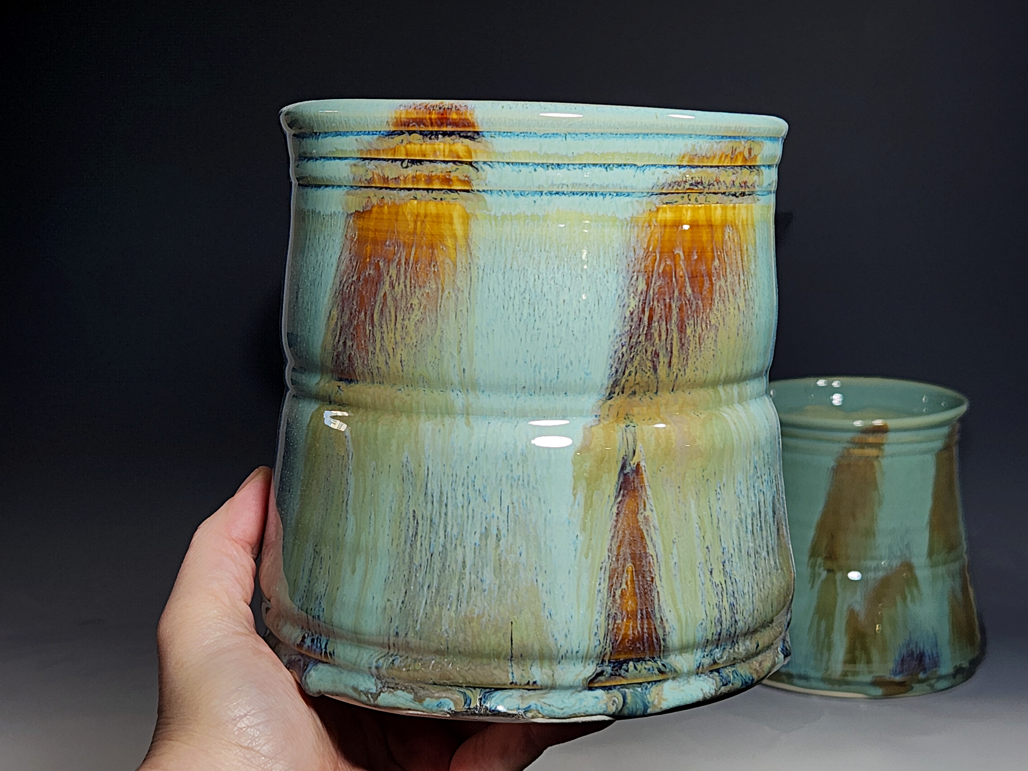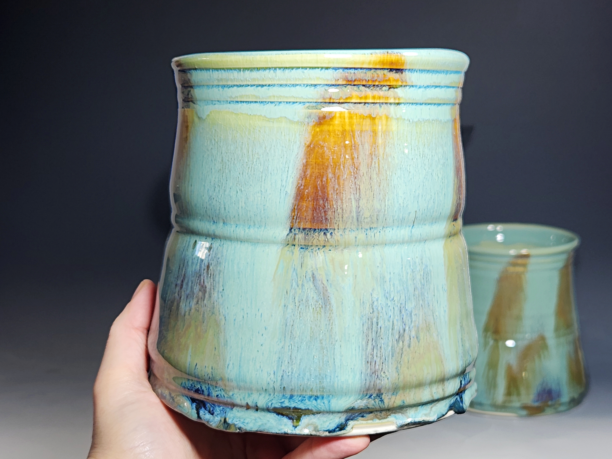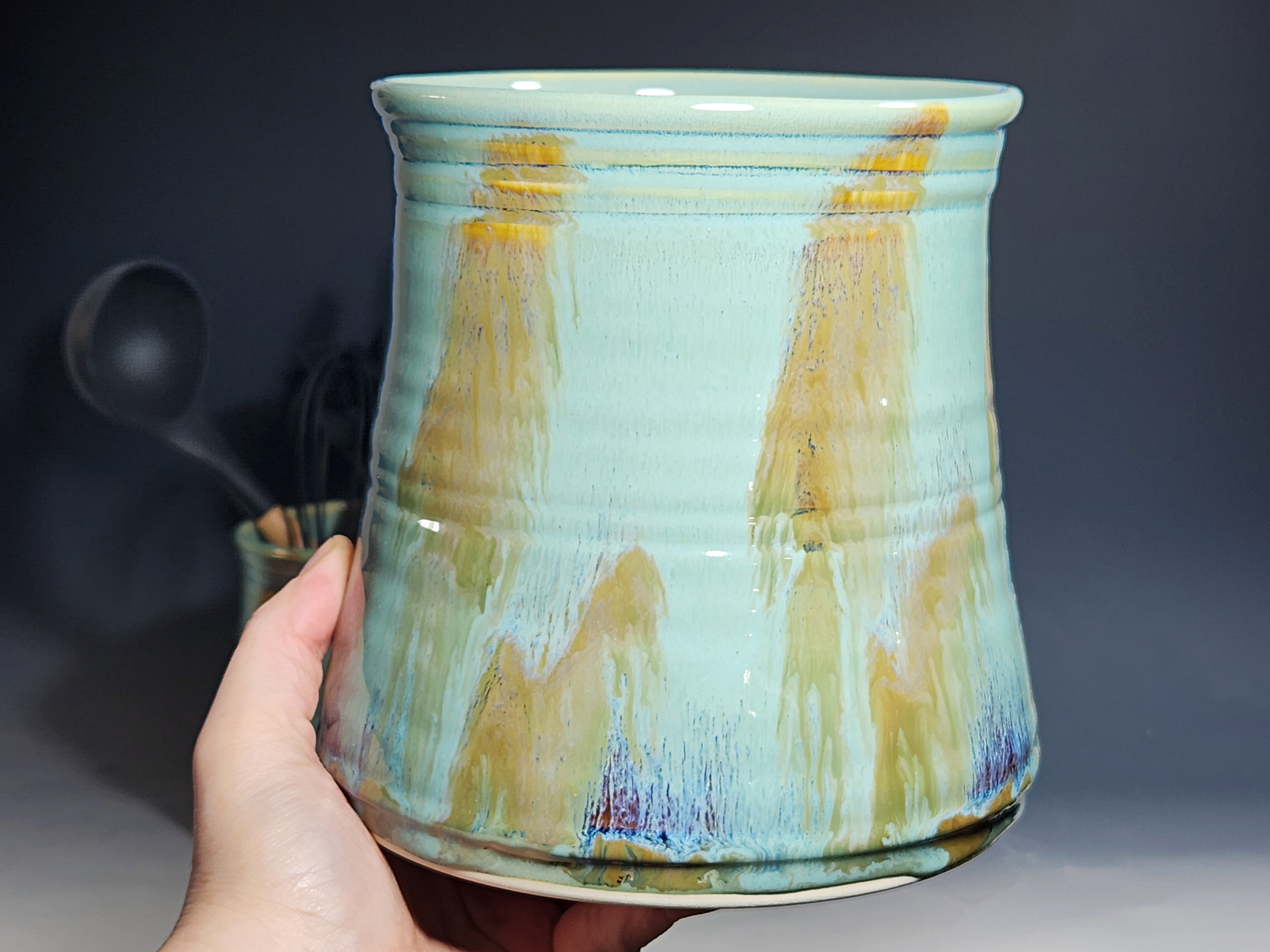 This piece is what I call a “beautiful second,” flawed, but still functional, beautiful, and safe. This wheel-thrown ceramic utensil holder is all dressed up in my most popular glaze combination, “Caribbean.” Lots of texture and movement in this glaze combo, and the unusual color combination seems to glow from within. Sturdy base that won’t tip over. Plenty of room for lots of utensils! Beautiful on a kitchen counter or in an art room for your creative tools!