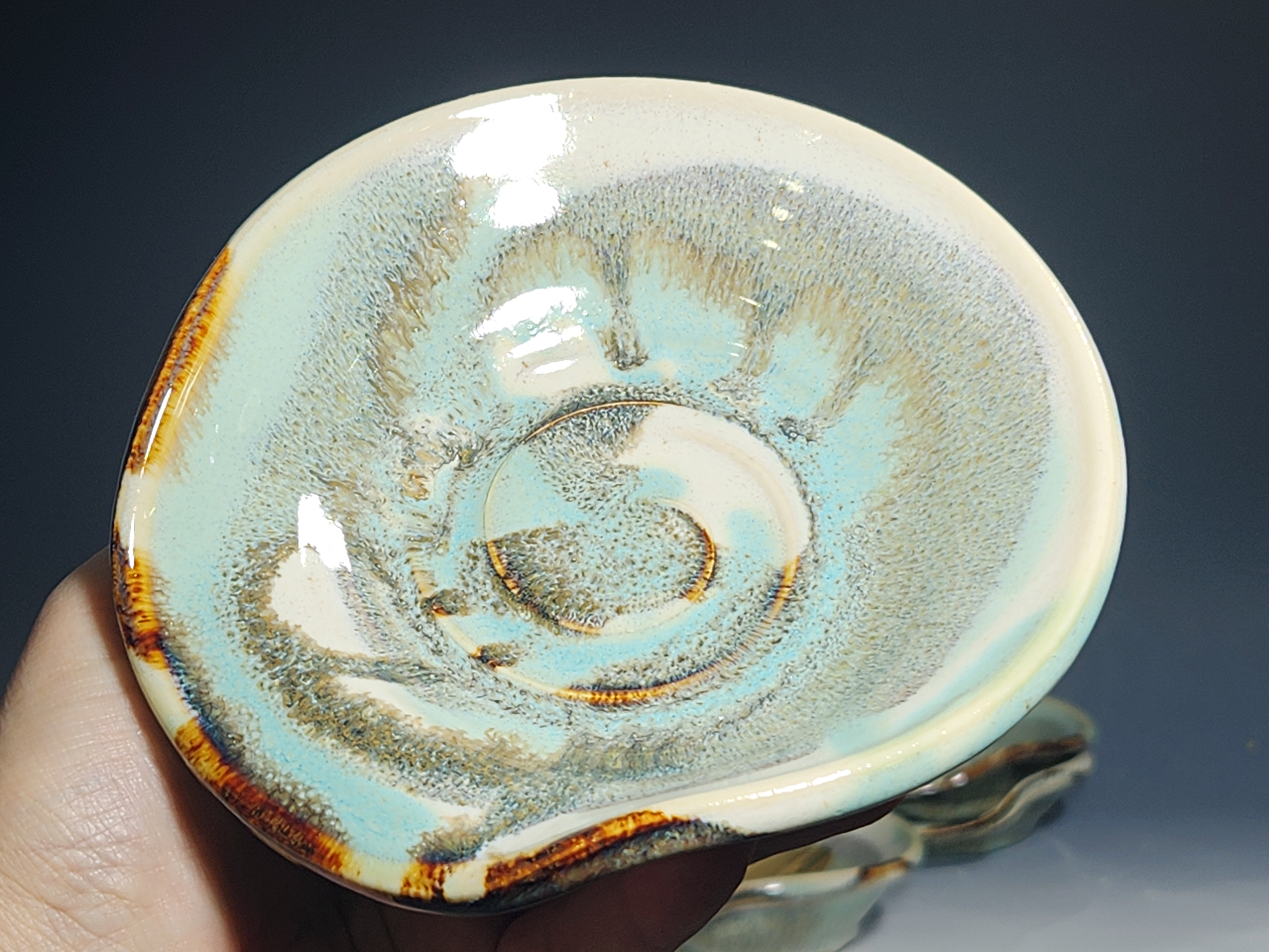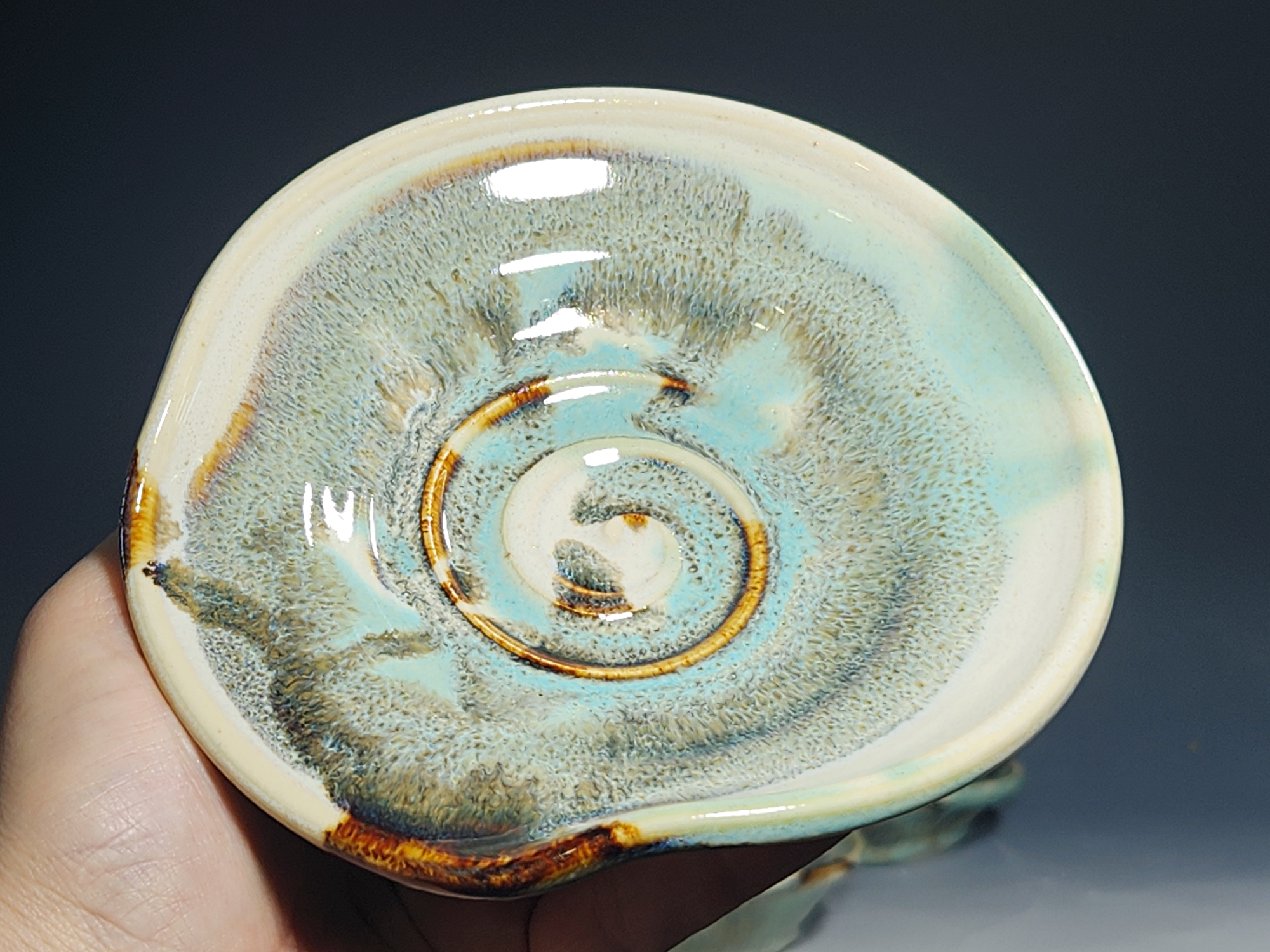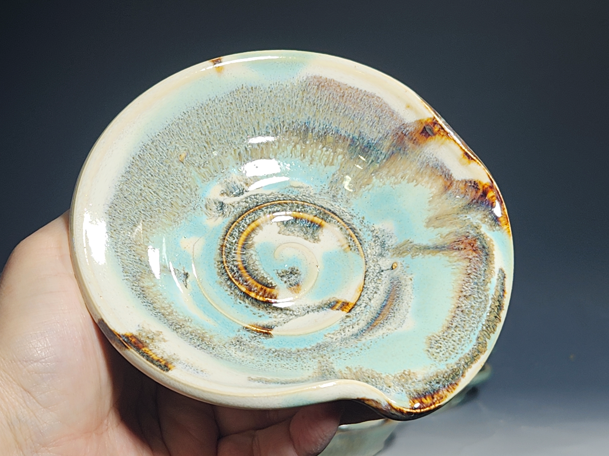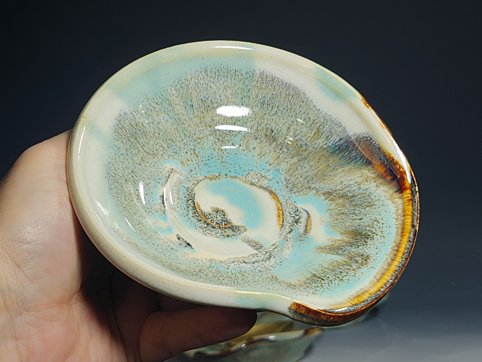 Brighten up your cooking! This hand-thrown pottery spoon or ladle rest is all dressed up in my new glaze combination, “Snowy Wood,” which consists of glazes I mix in-house. Great for use at the stove as a ladle rest or at the coffee pot. Makes a nice housewarming, bridesmaid, or birthday gift.