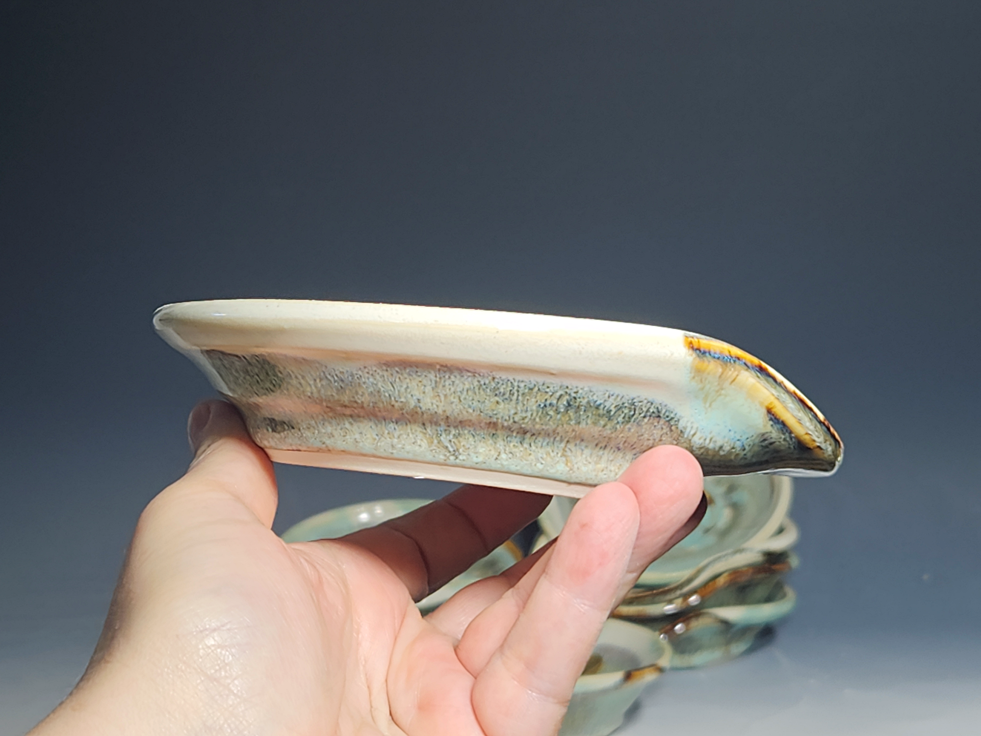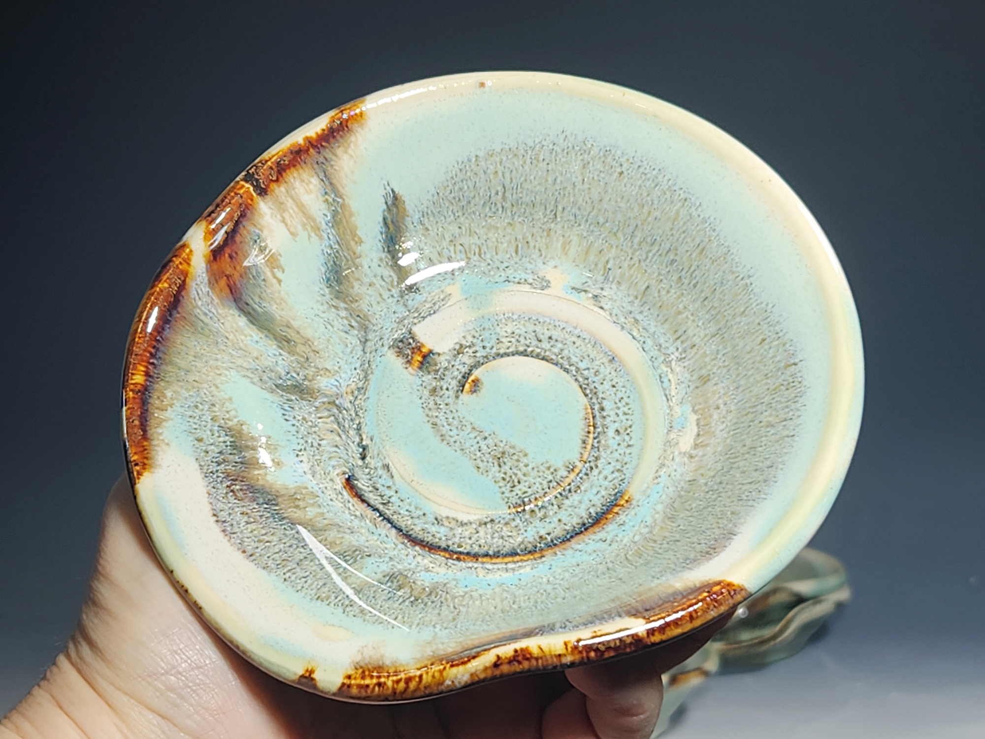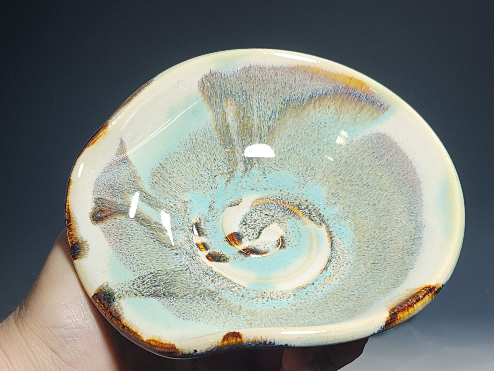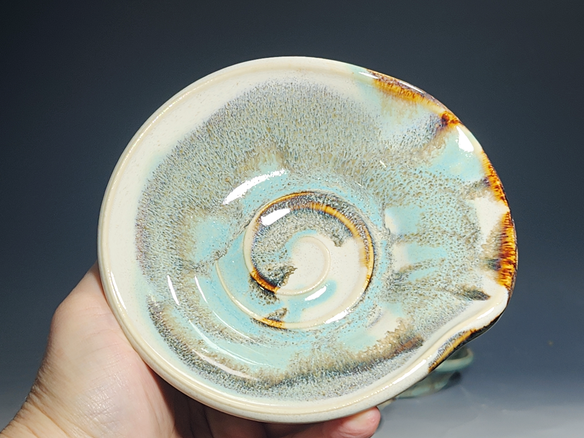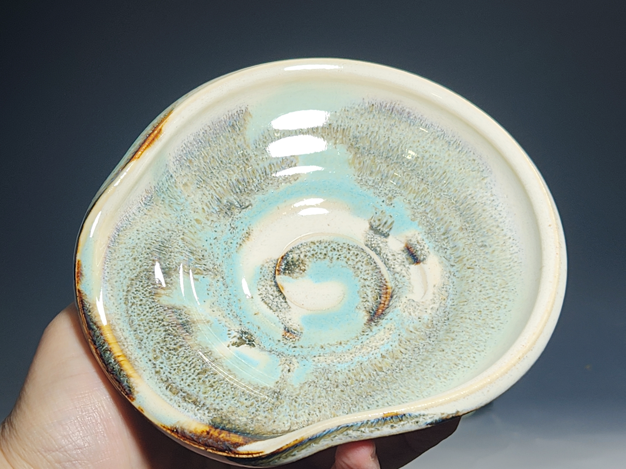 Brighten up your cooking! This hand-thrown pottery spoon or ladle rest is all dressed up in my new glaze combination, “Snowy Wood,” which consists of glazes I mix in-house. Great for use at the stove as a ladle rest or at the coffee pot. Makes a nice housewarming, bridesmaid, or birthday gift.