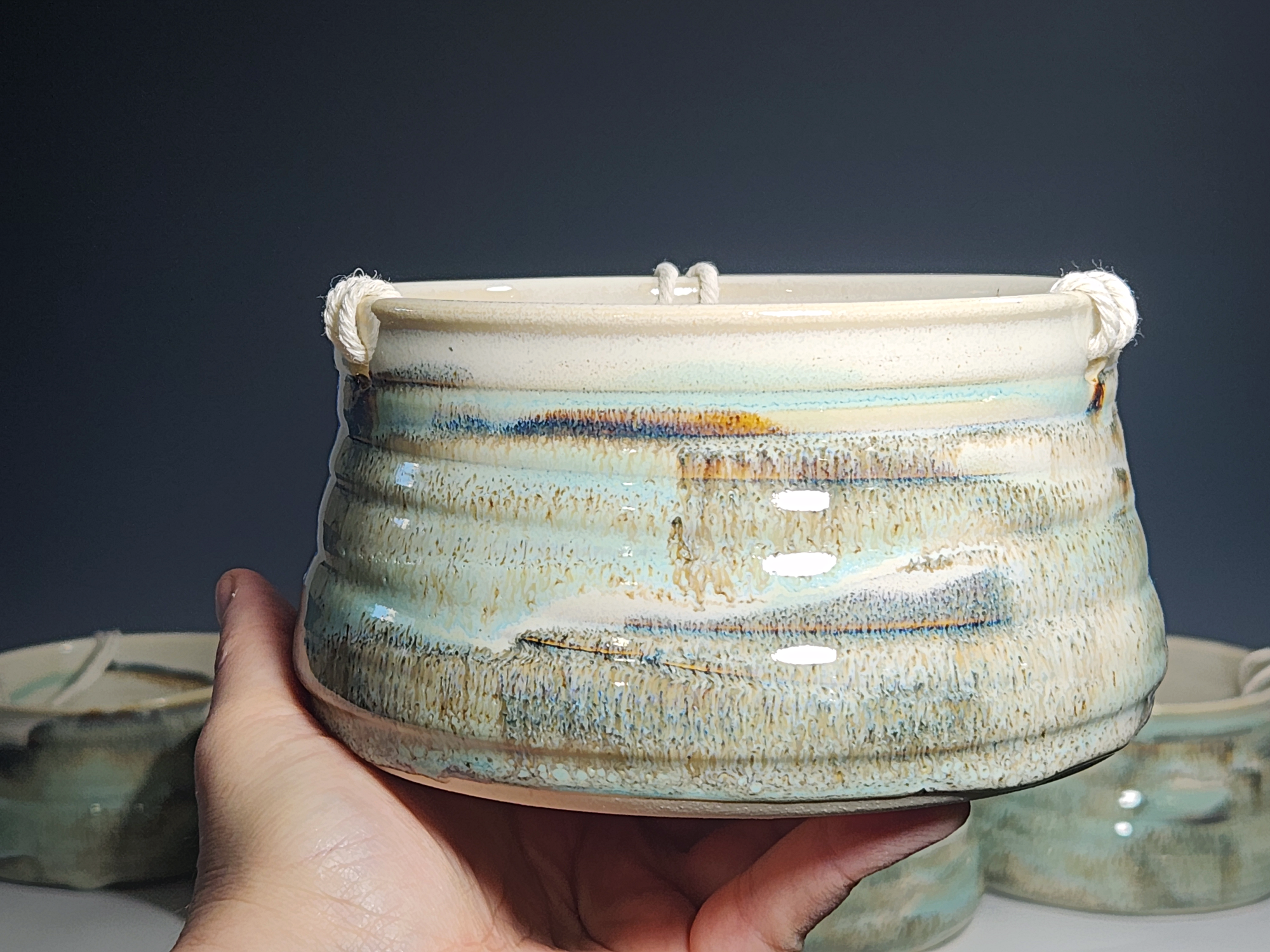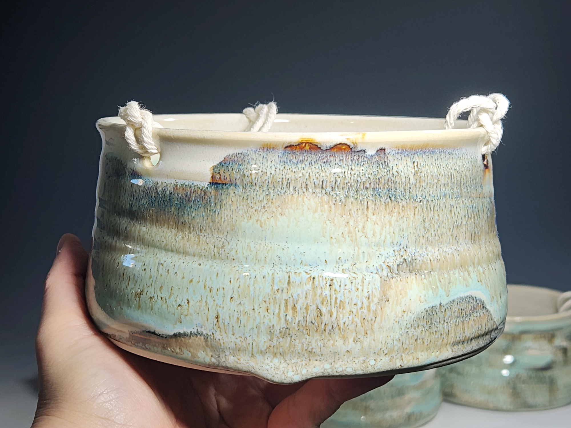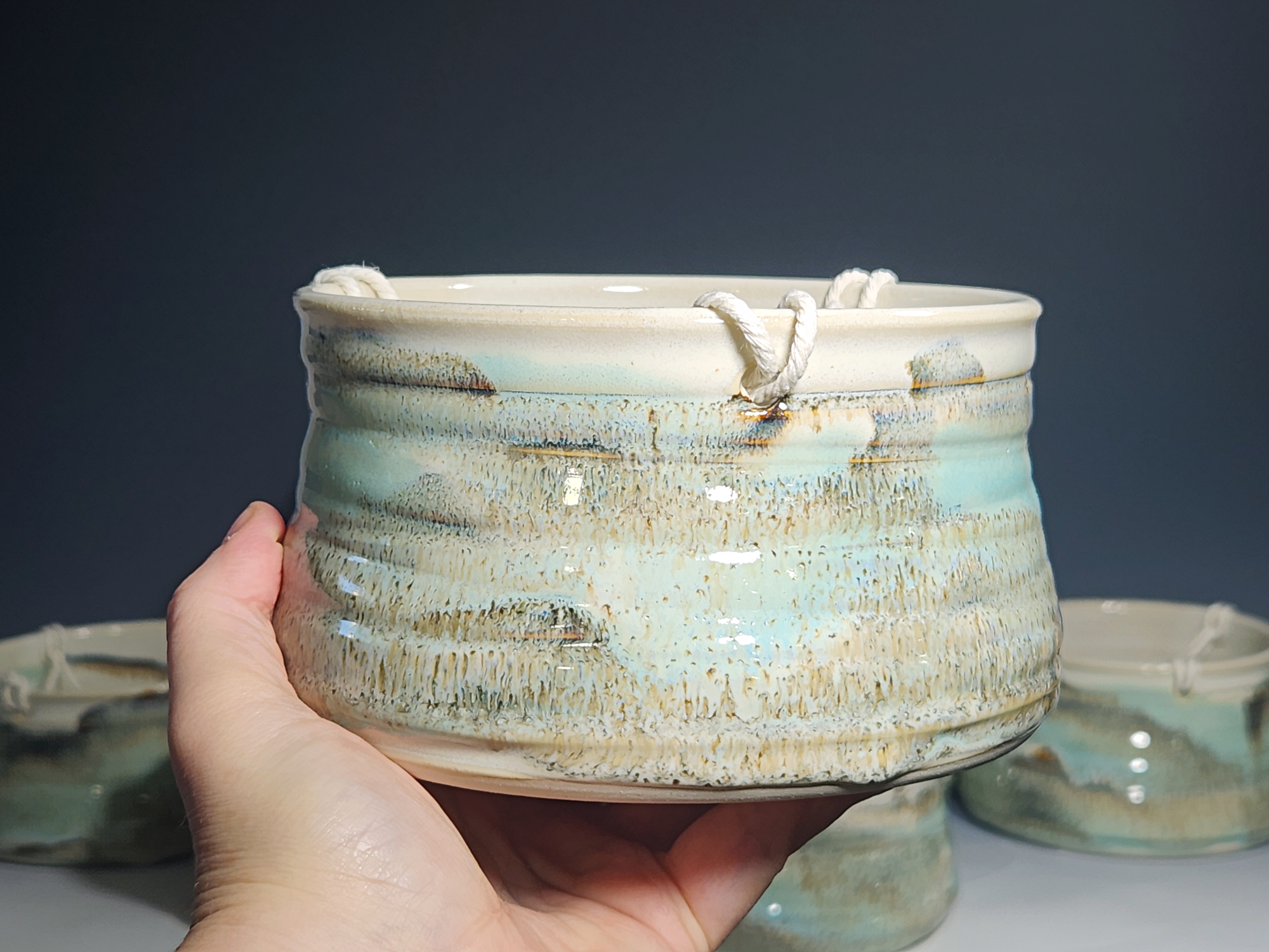 All dressed up in my new glaze combination, “Snowy Wood,” this medium-sized hanging planter holds your plant for safekeeping. Gorgeous, complex glaze glows and highlights the texture of the well-made form. Outdoor hanging planters include a drainage hole. Indoor hanging planters have no drainage. Each planter has a secure hanging rope with a simple knot at the top. They make a great birthday, wedding, or housewarming gift.