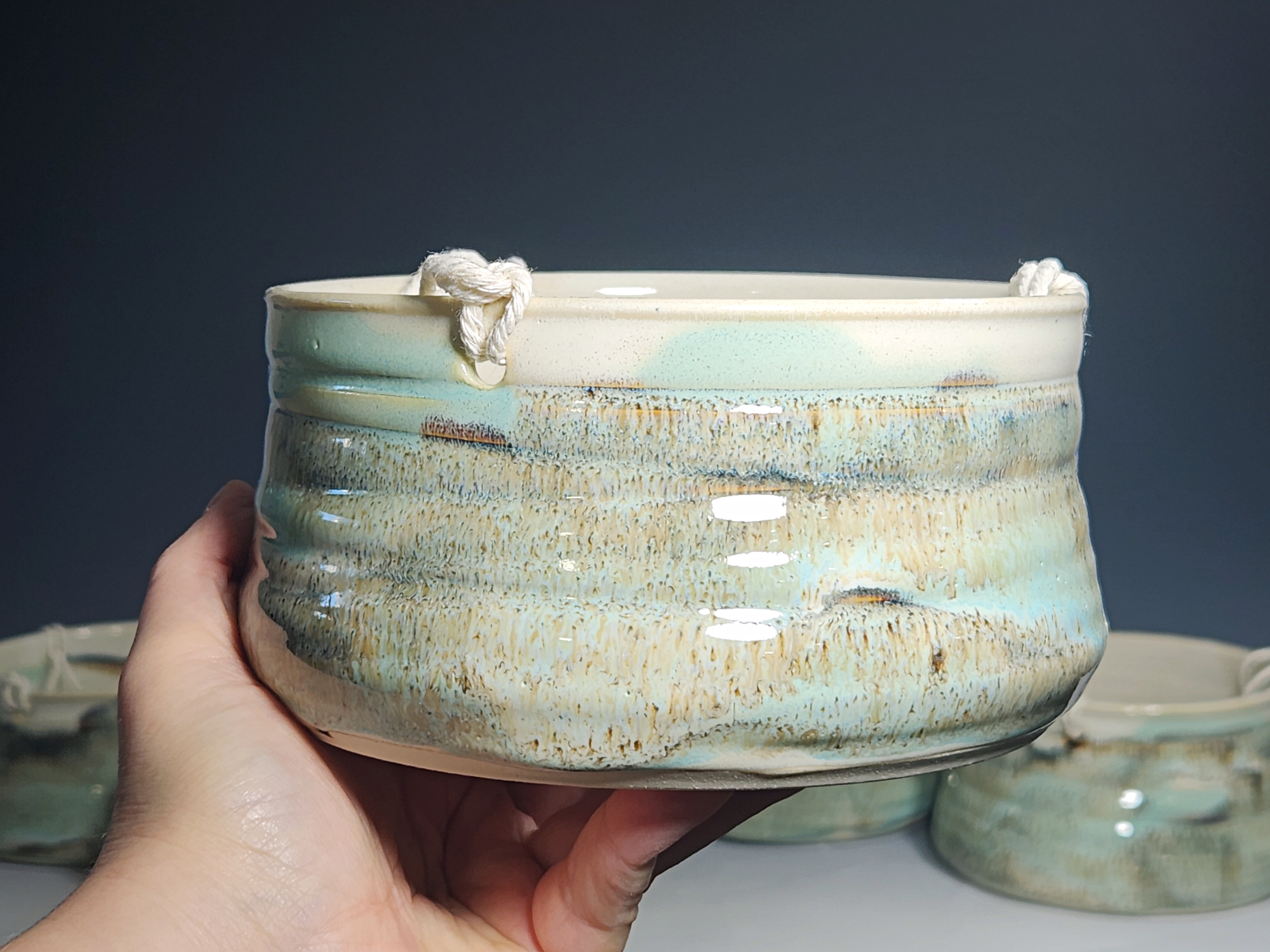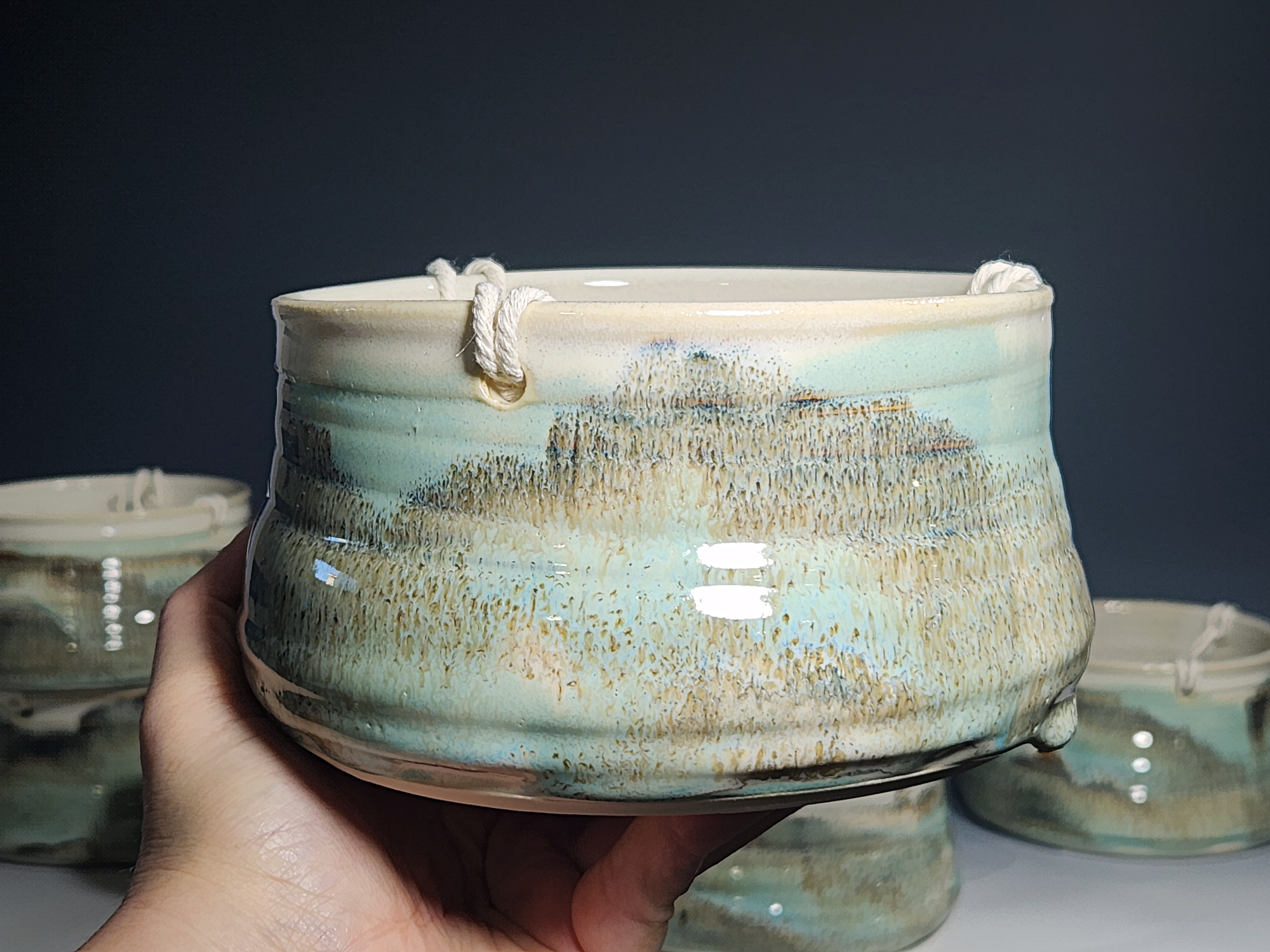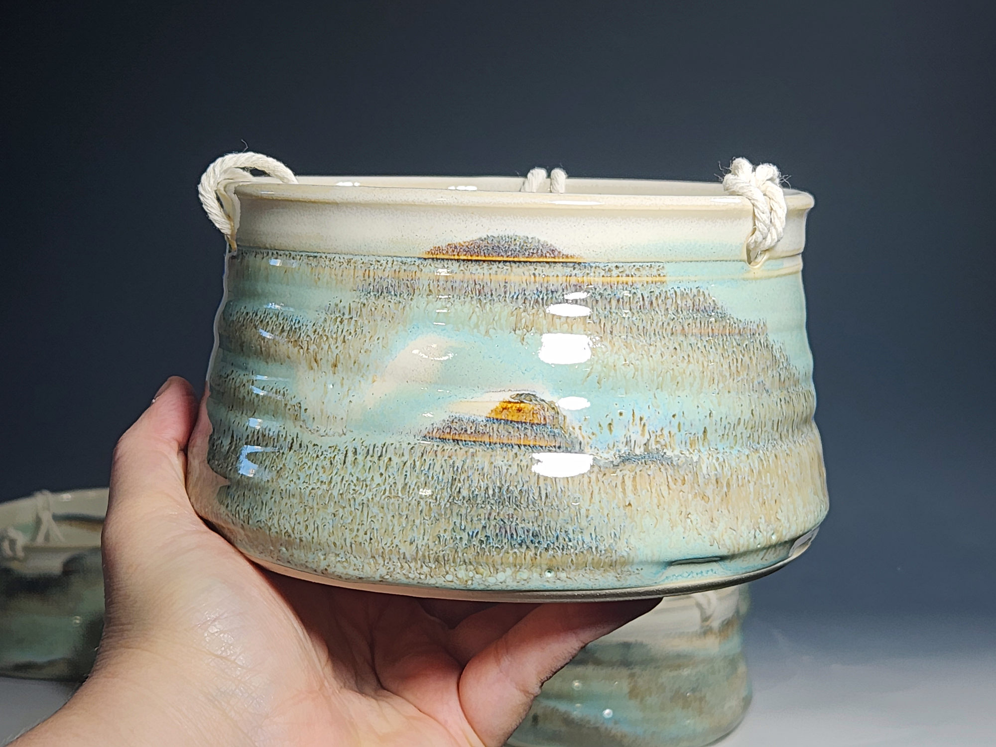 All dressed up in my new glaze combination, “Snowy Wood,” this medium-sized hanging planter holds your plant for safekeeping. Gorgeous, complex glaze glows and highlights the texture of the well-made form. Outdoor hanging planters include a drainage hole. Indoor hanging planters have no drainage. Each planter has a secure hanging rope with a simple knot at the top. They make a great birthday, wedding, or housewarming gift.