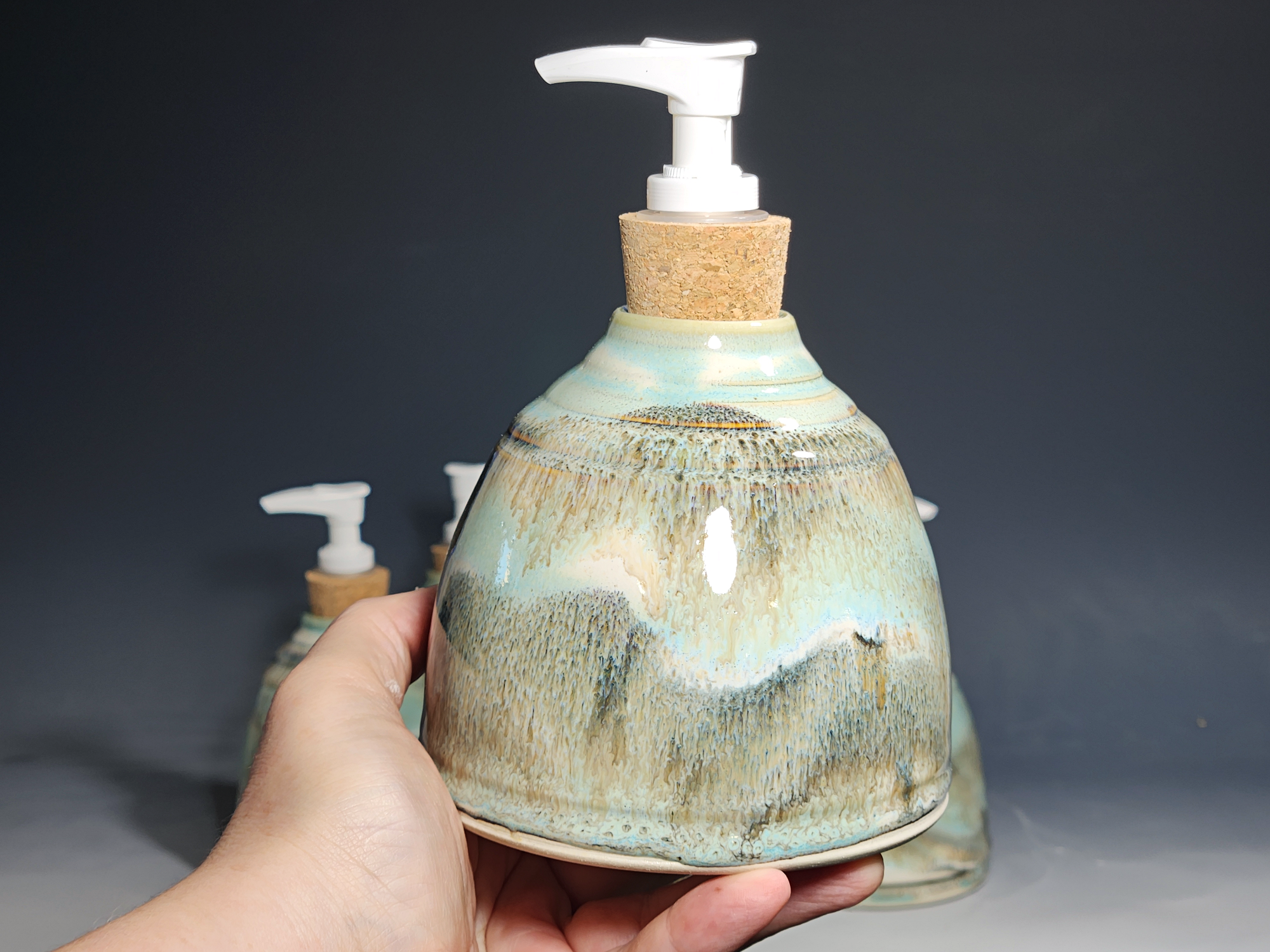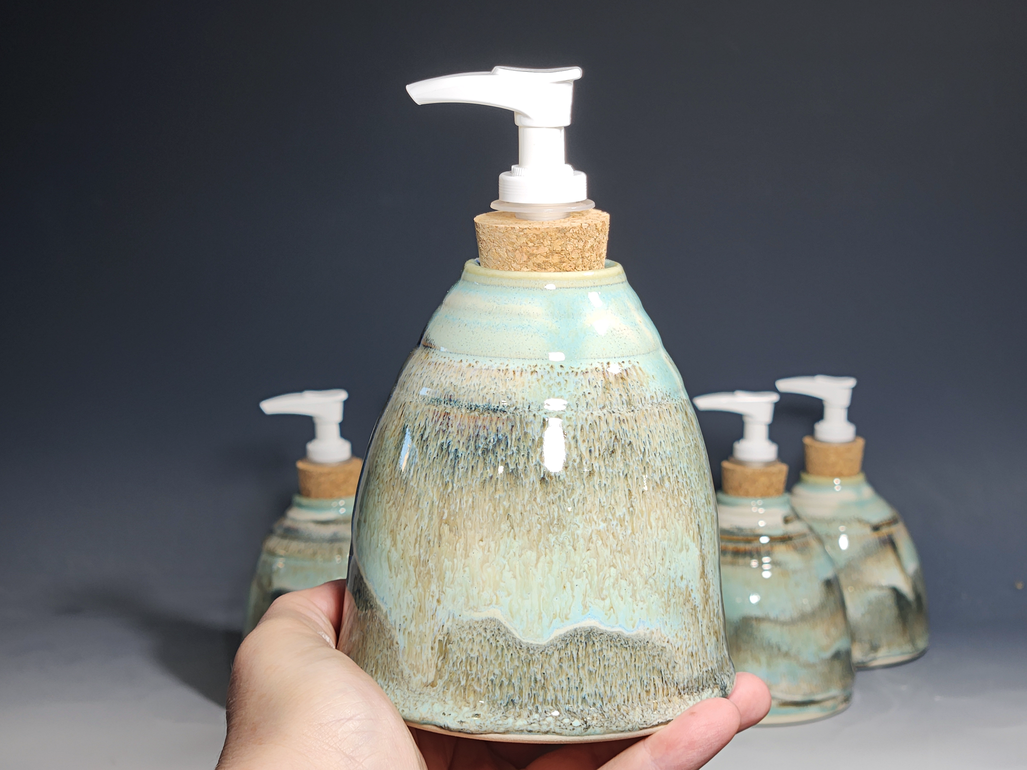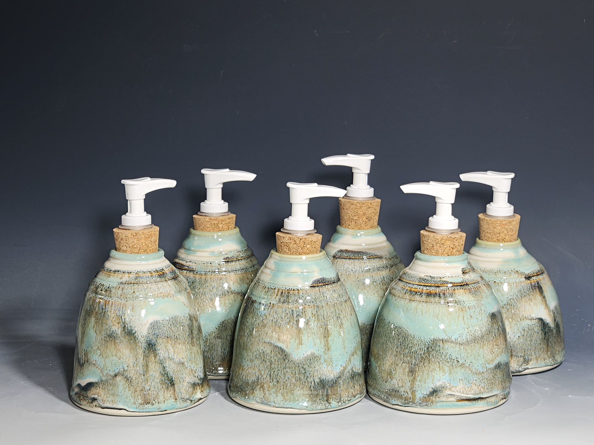 These hand-thrown ceramic soap pumps are all dressed up in my glaze combination, “Snowy Wood.” Beautiful, functional soap dispenser holds your soap in style. It’s big enough to hold lots of soap, and small enough to fit on a bathroom or kitchen counter. It’s easy to refill and easy to clean; when it gets dusty, just tuck it into the dishwasher! Makes a great housewarming or wedding gift.