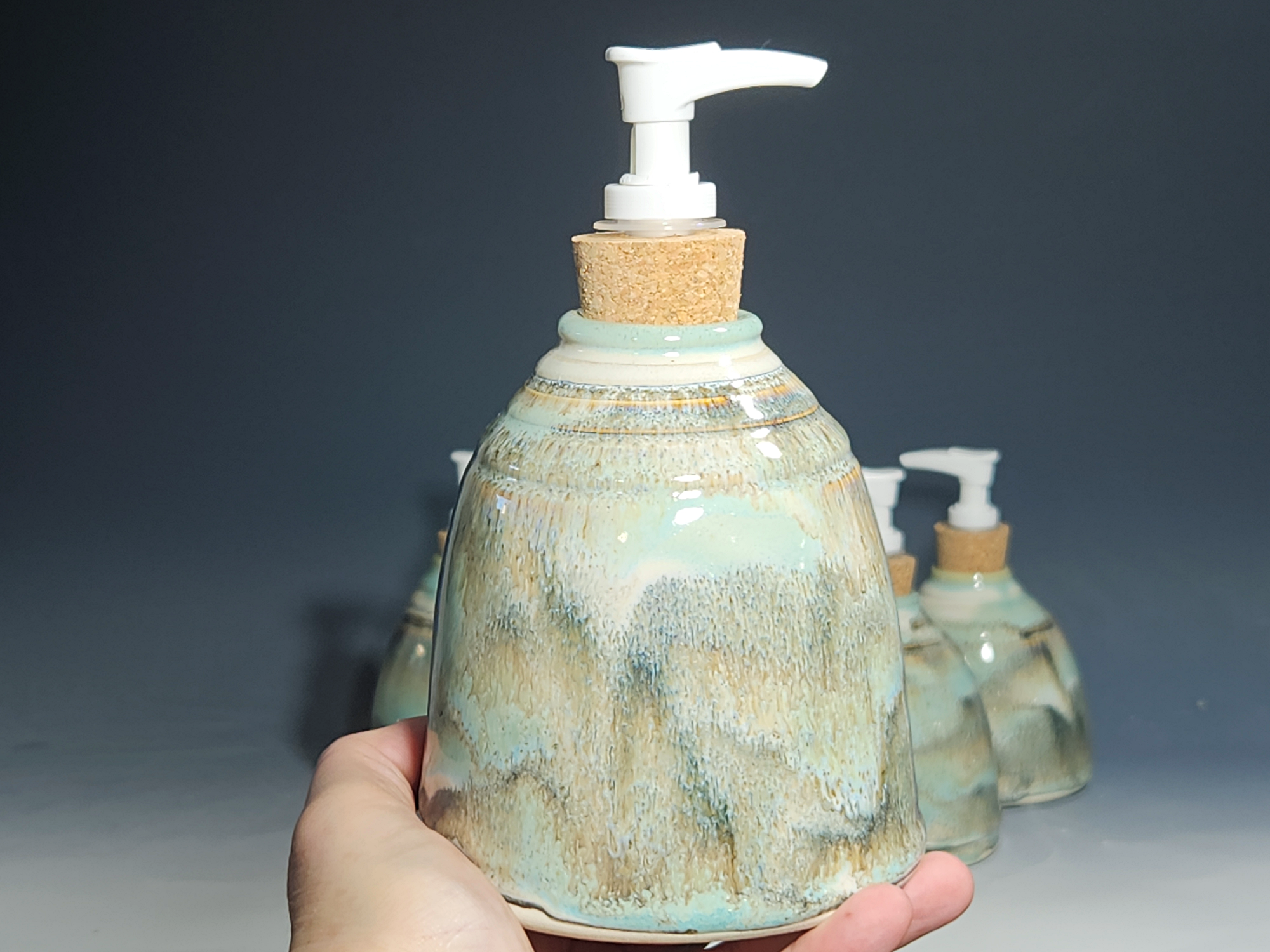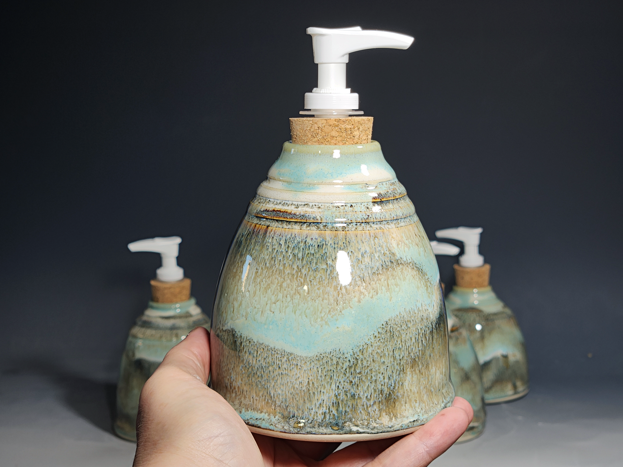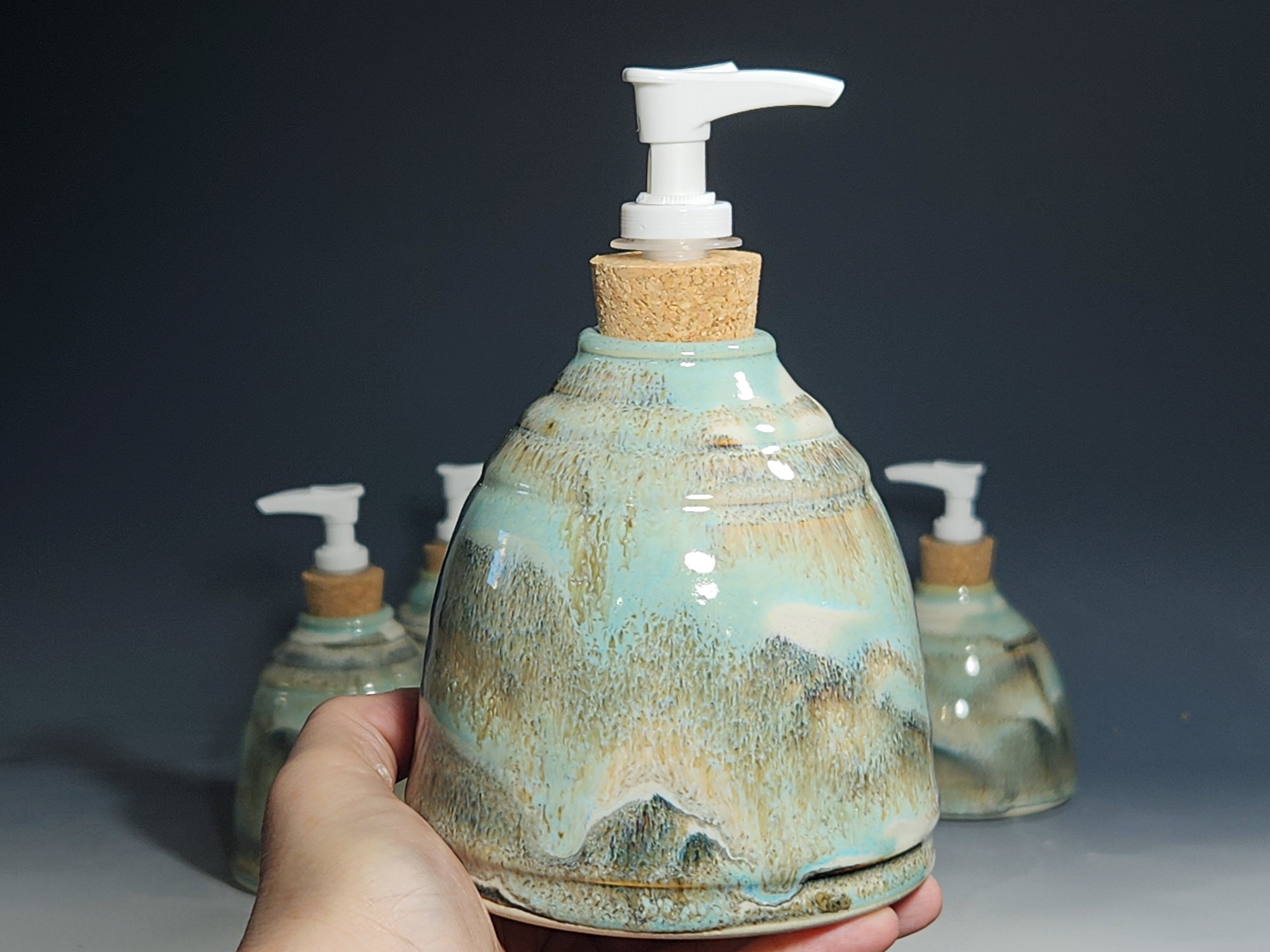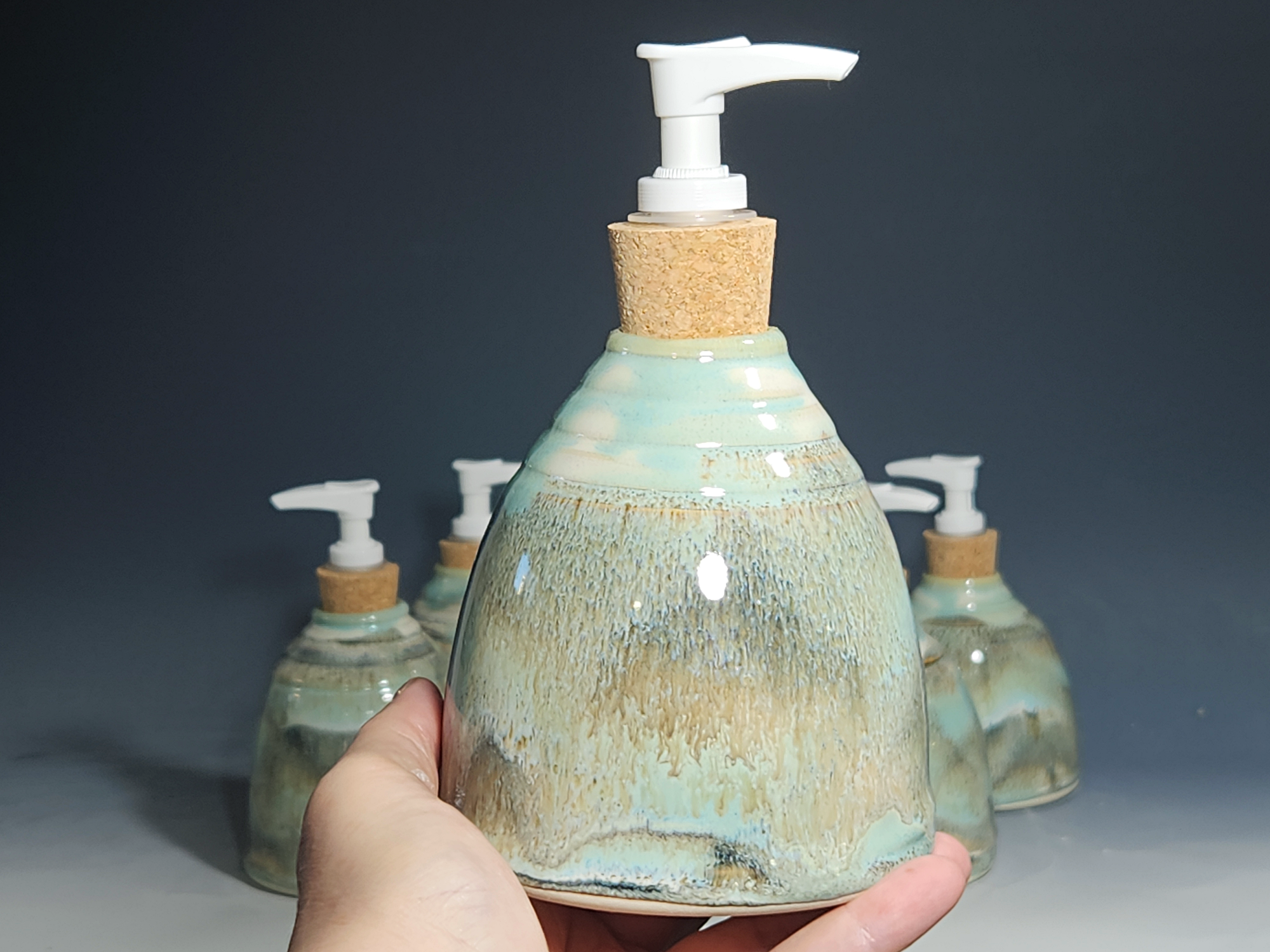 These hand-thrown ceramic soap pumps are all dressed up in my glaze combination, “Snowy Wood.” Beautiful, functional soap dispenser holds your soap in style. It’s big enough to hold lots of soap, and small enough to fit on a bathroom or kitchen counter. It’s easy to refill and easy to clean; when it gets dusty, just tuck it into the dishwasher! Makes a great housewarming or wedding gift.