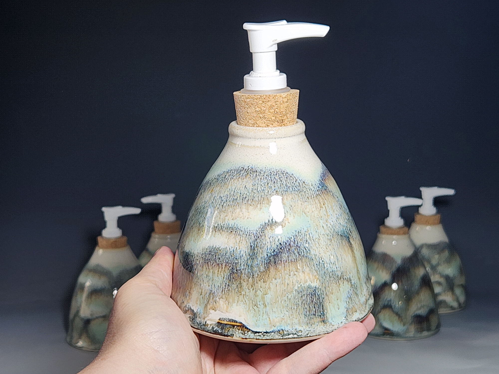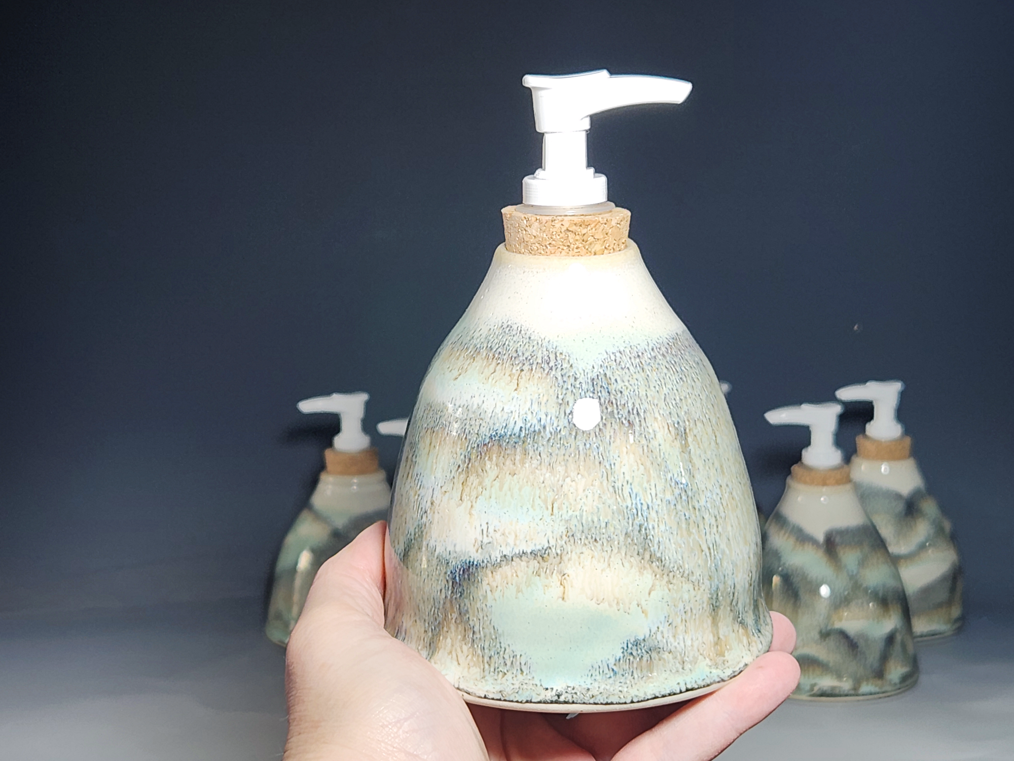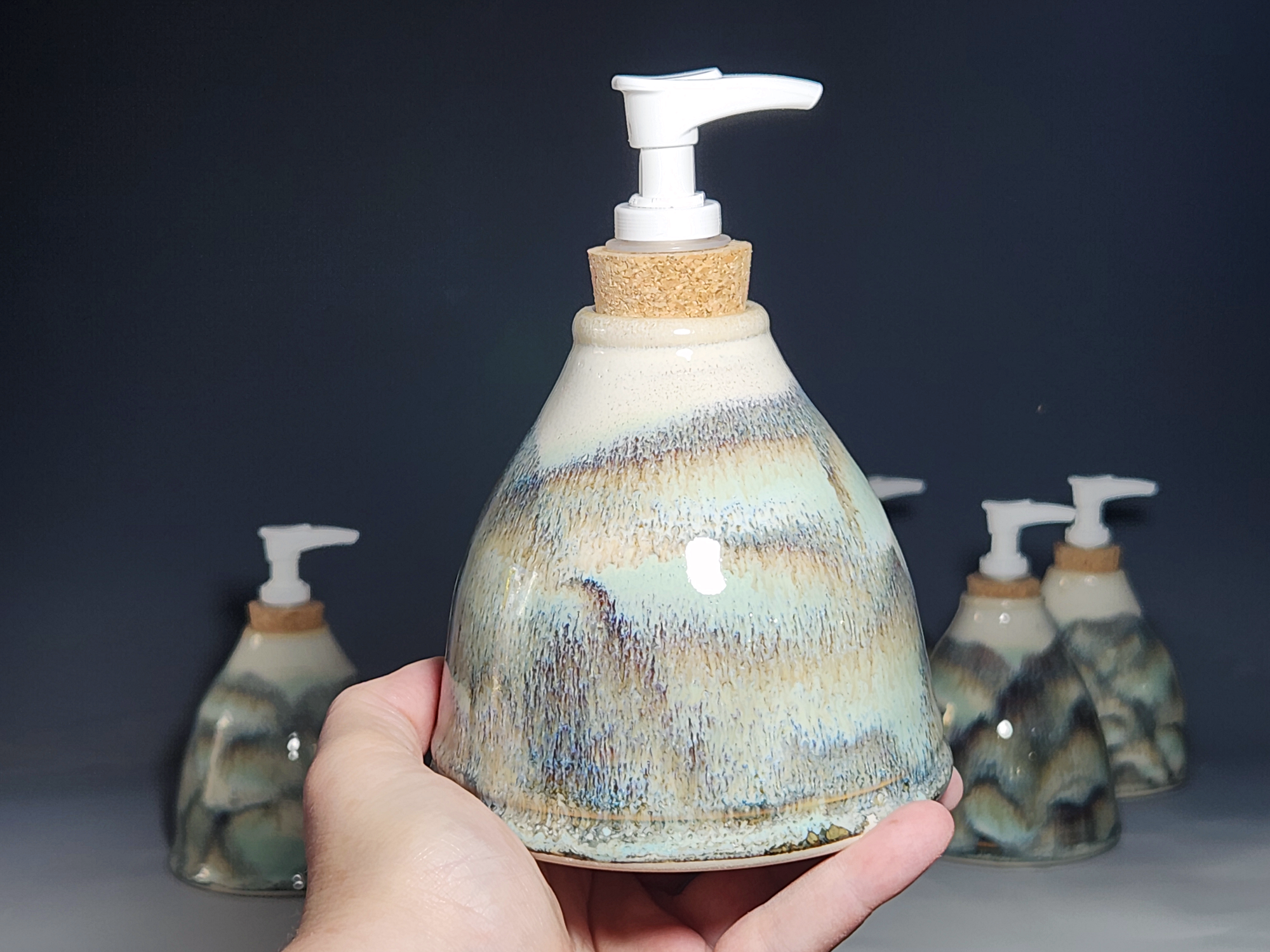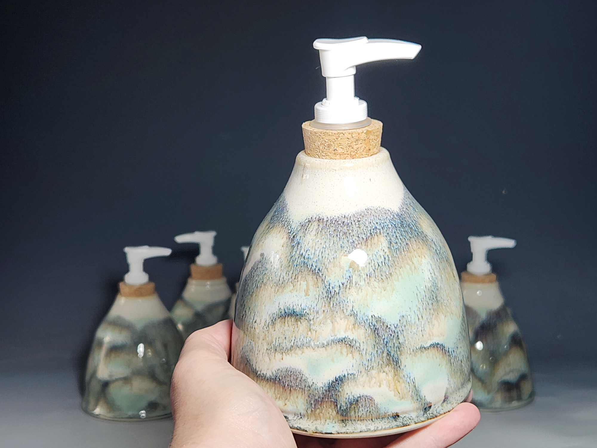 These hand-thrown ceramic soap pumps are all dressed up in my glaze combination, “Snowy Wood,” a rich white over iron accented with blue-green. Beautiful, functional soap dispenser holds your soap in style. It’s big enough to hold lots of soap, and small enough to fit on a bathroom or kitchen counter. It’s easy to refill and easy to clean; when it gets dusty, just tuck it into the dishwasher! Makes a great housewarming or wedding gift.