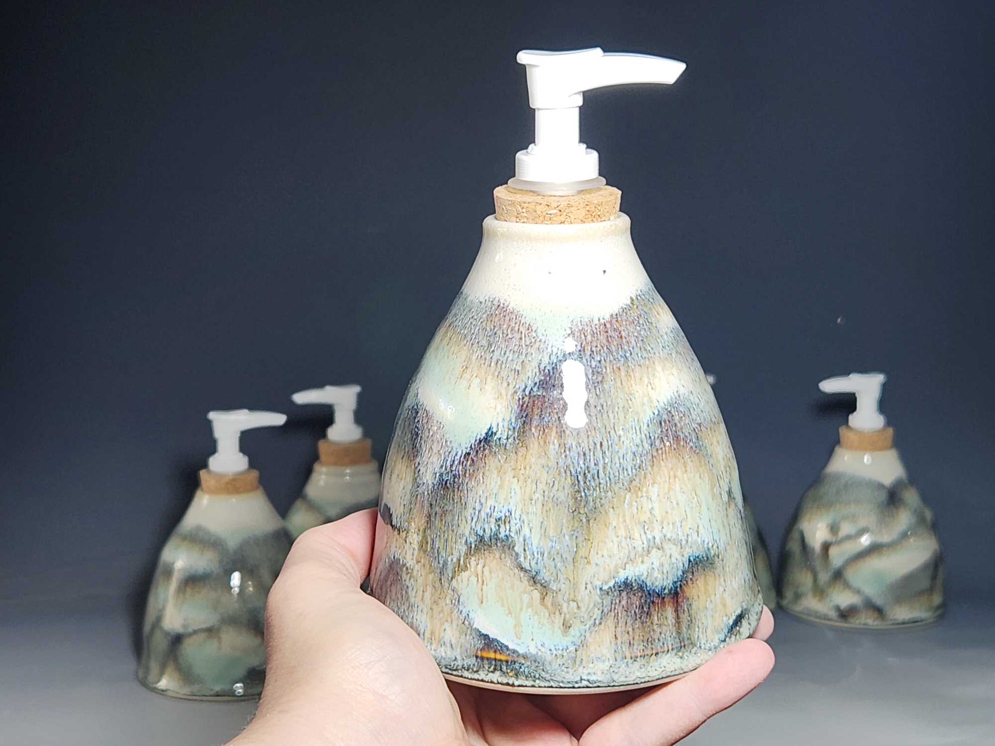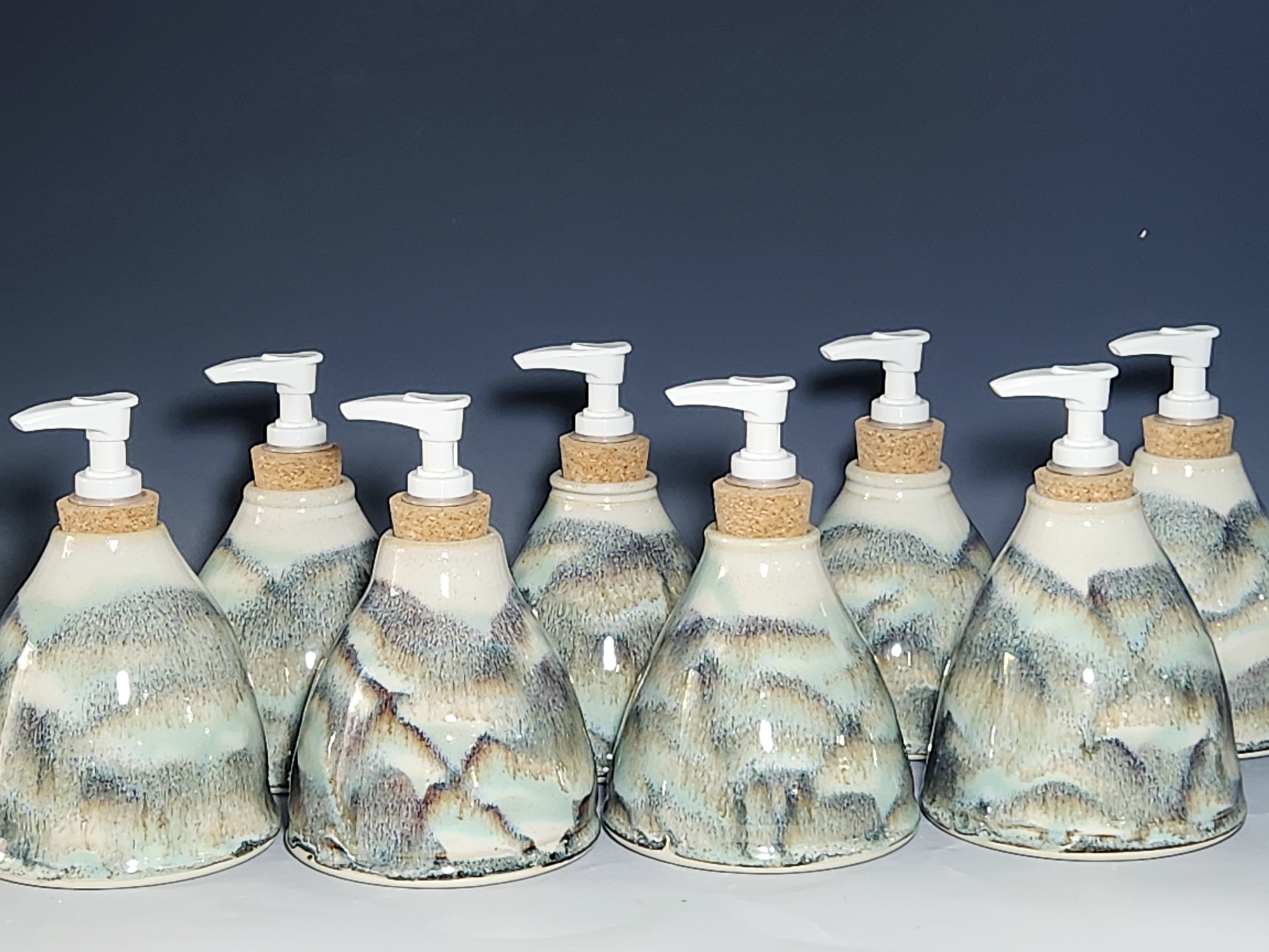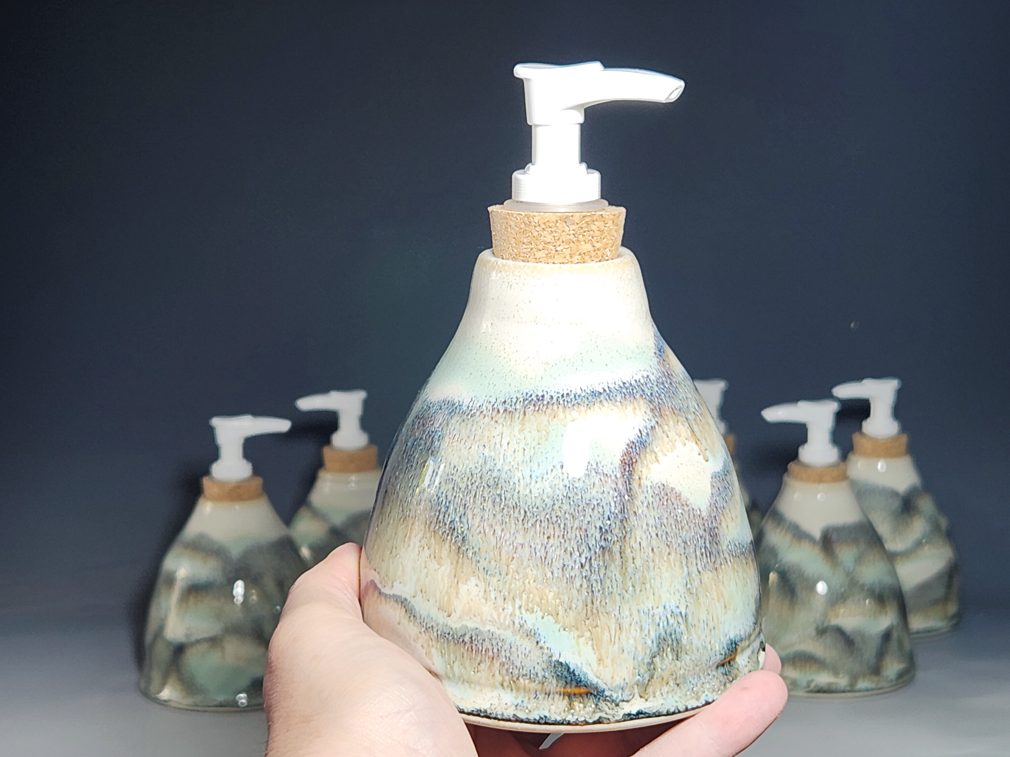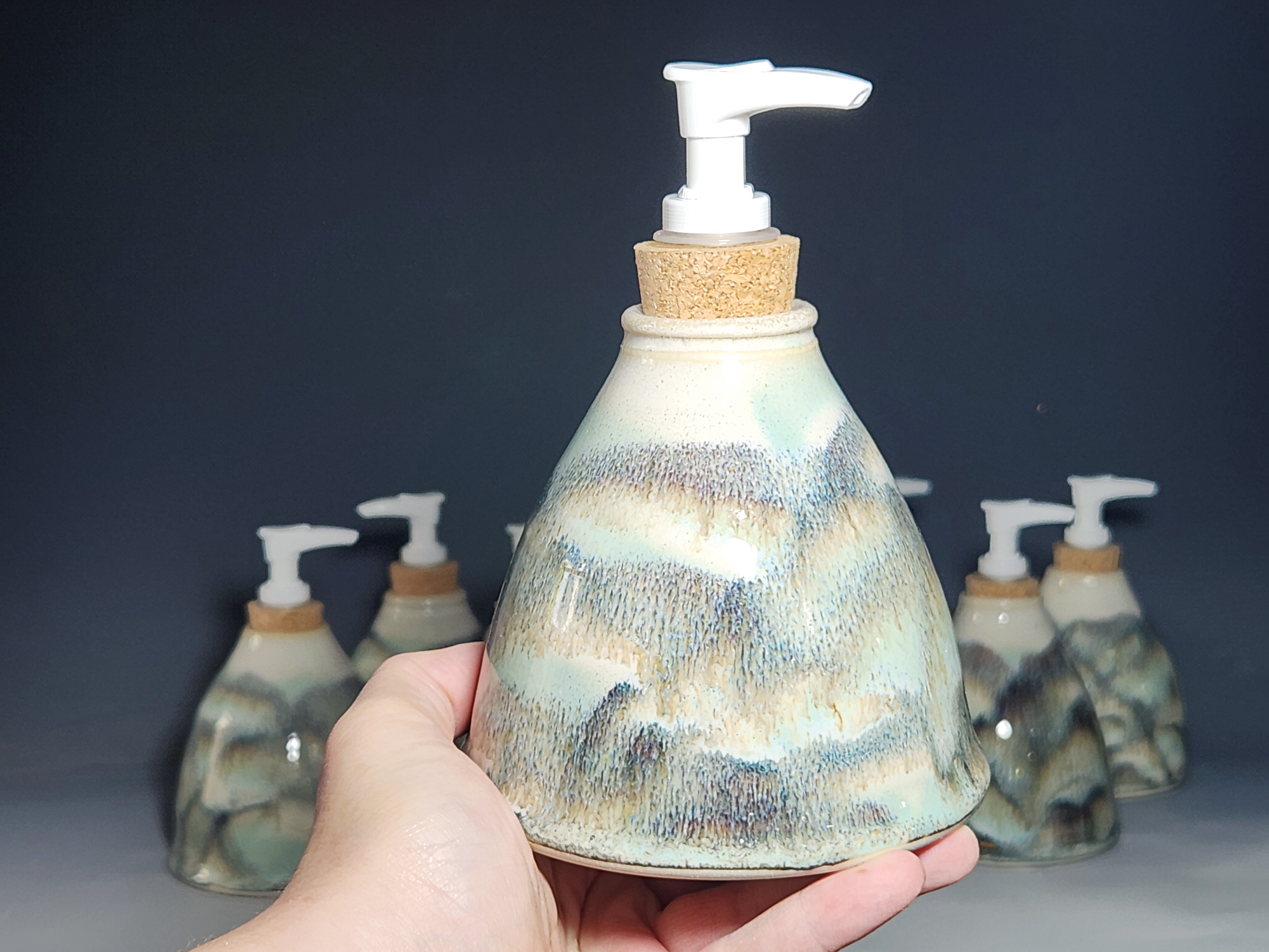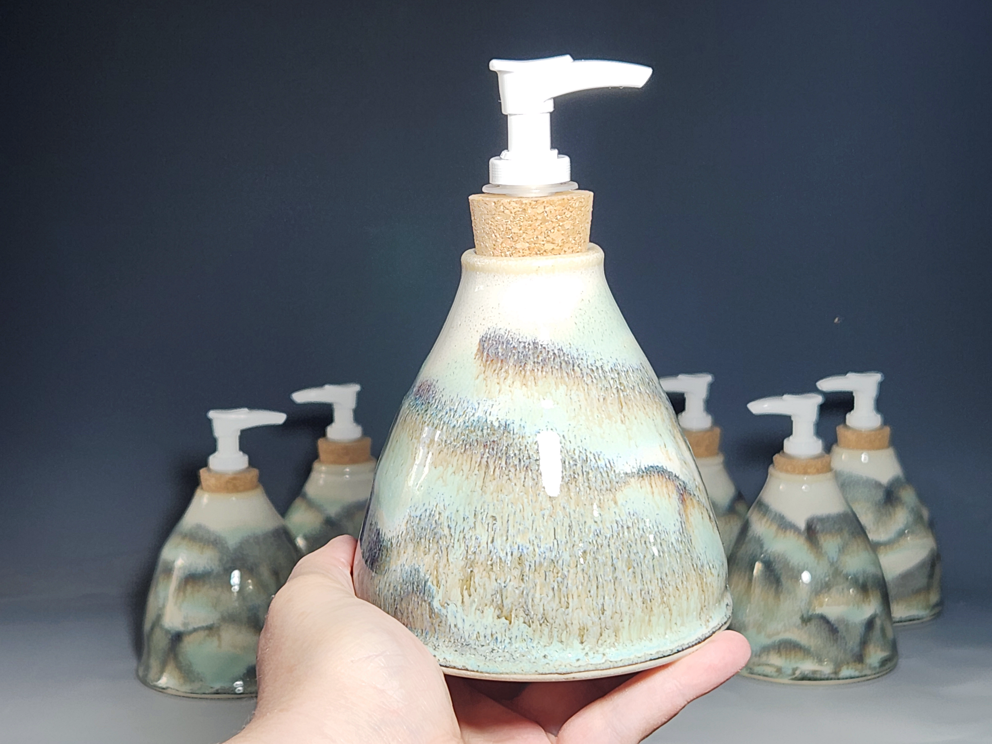 These hand-thrown ceramic soap pumps are all dressed up in my glaze combination, “Snowy Wood,” a rich white over iron accented with blue-green. Beautiful, functional soap dispenser holds your soap in style. It’s big enough to hold lots of soap, and small enough to fit on a bathroom or kitchen counter. It’s easy to refill and easy to clean; when it gets dusty, just tuck it into the dishwasher! Makes a great housewarming or wedding gift.