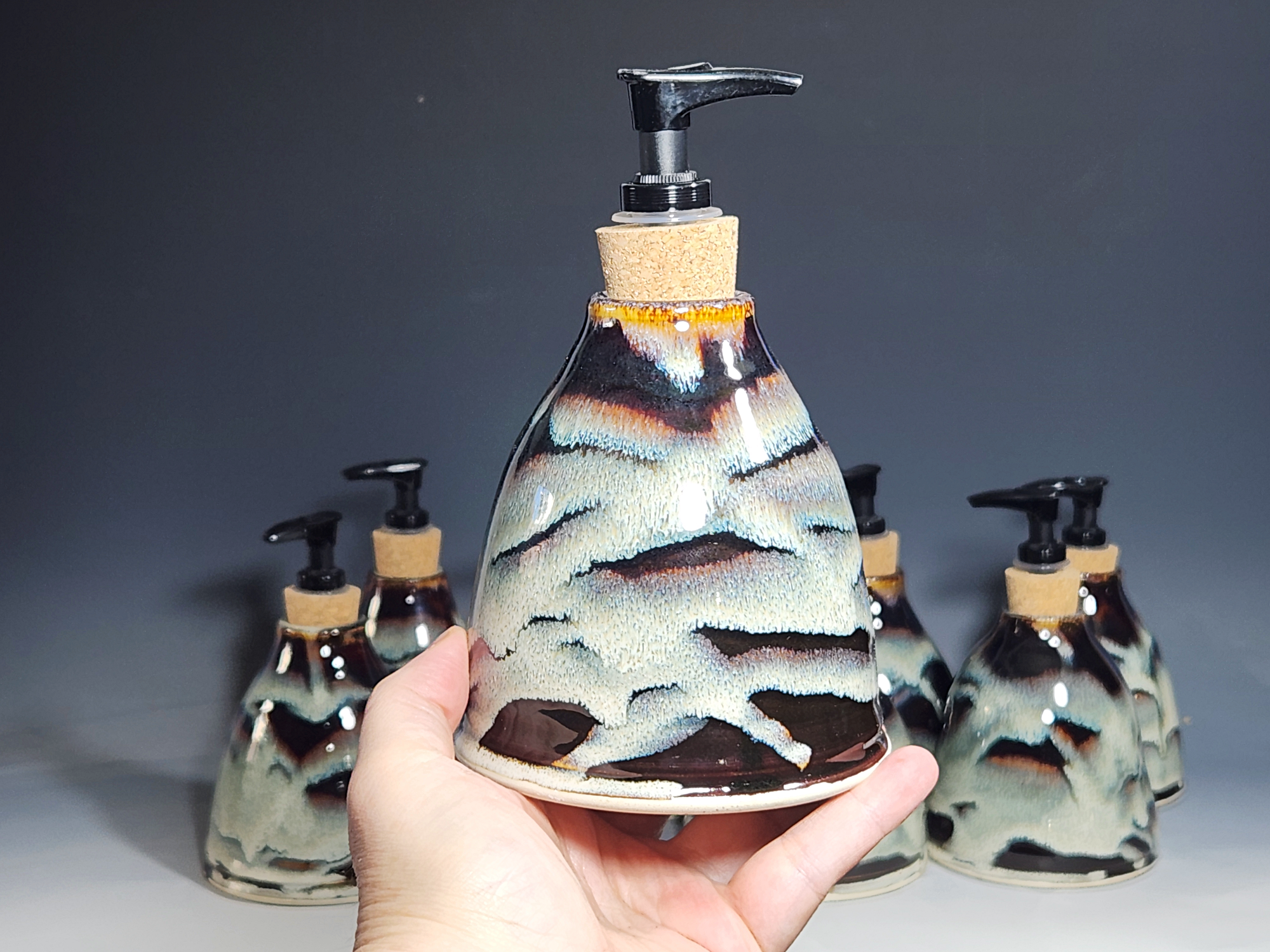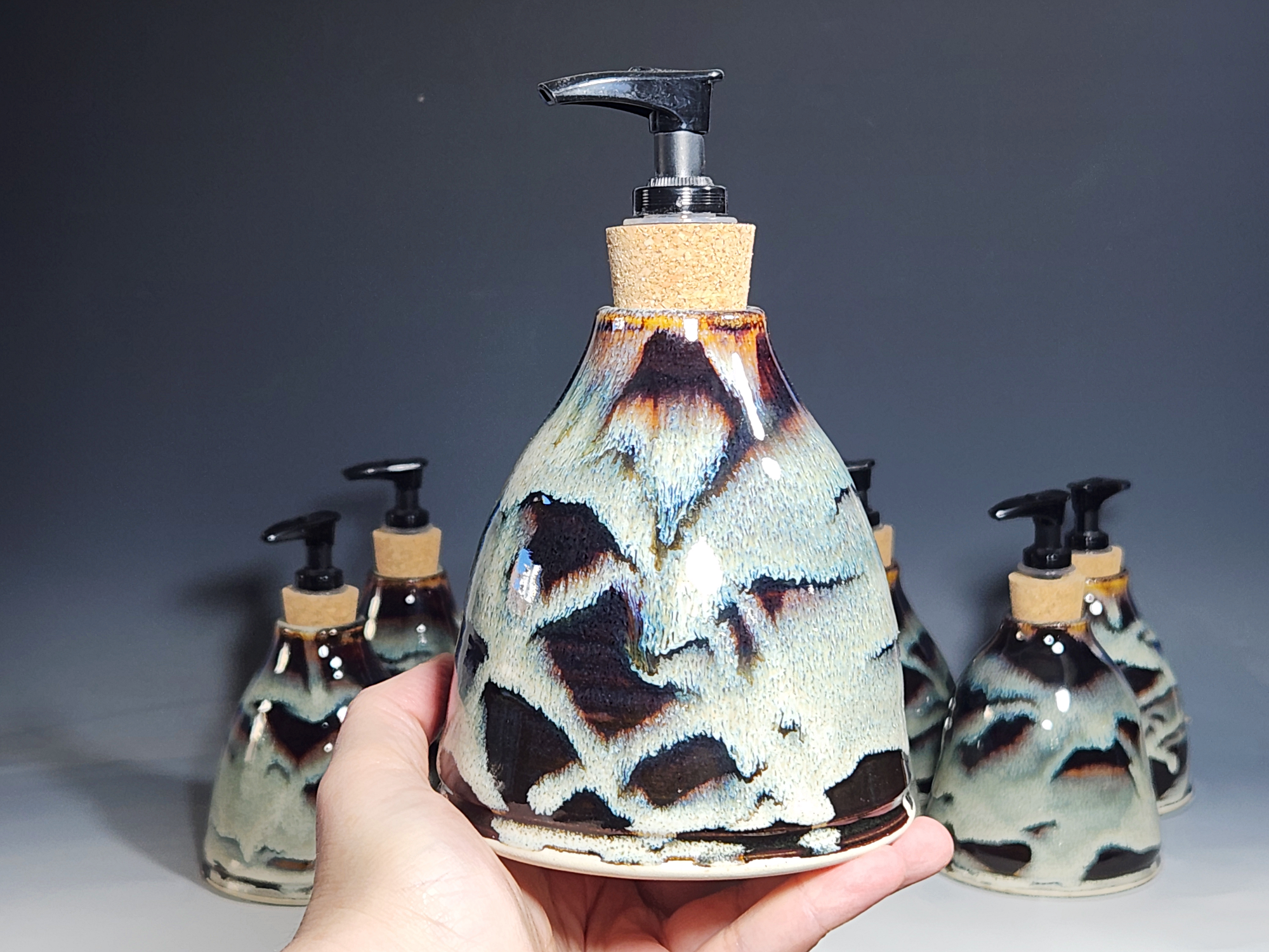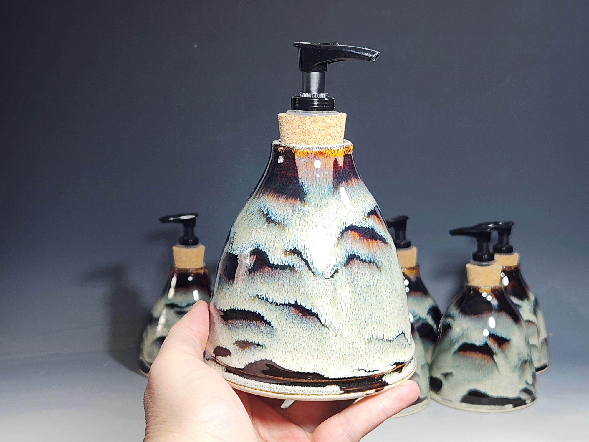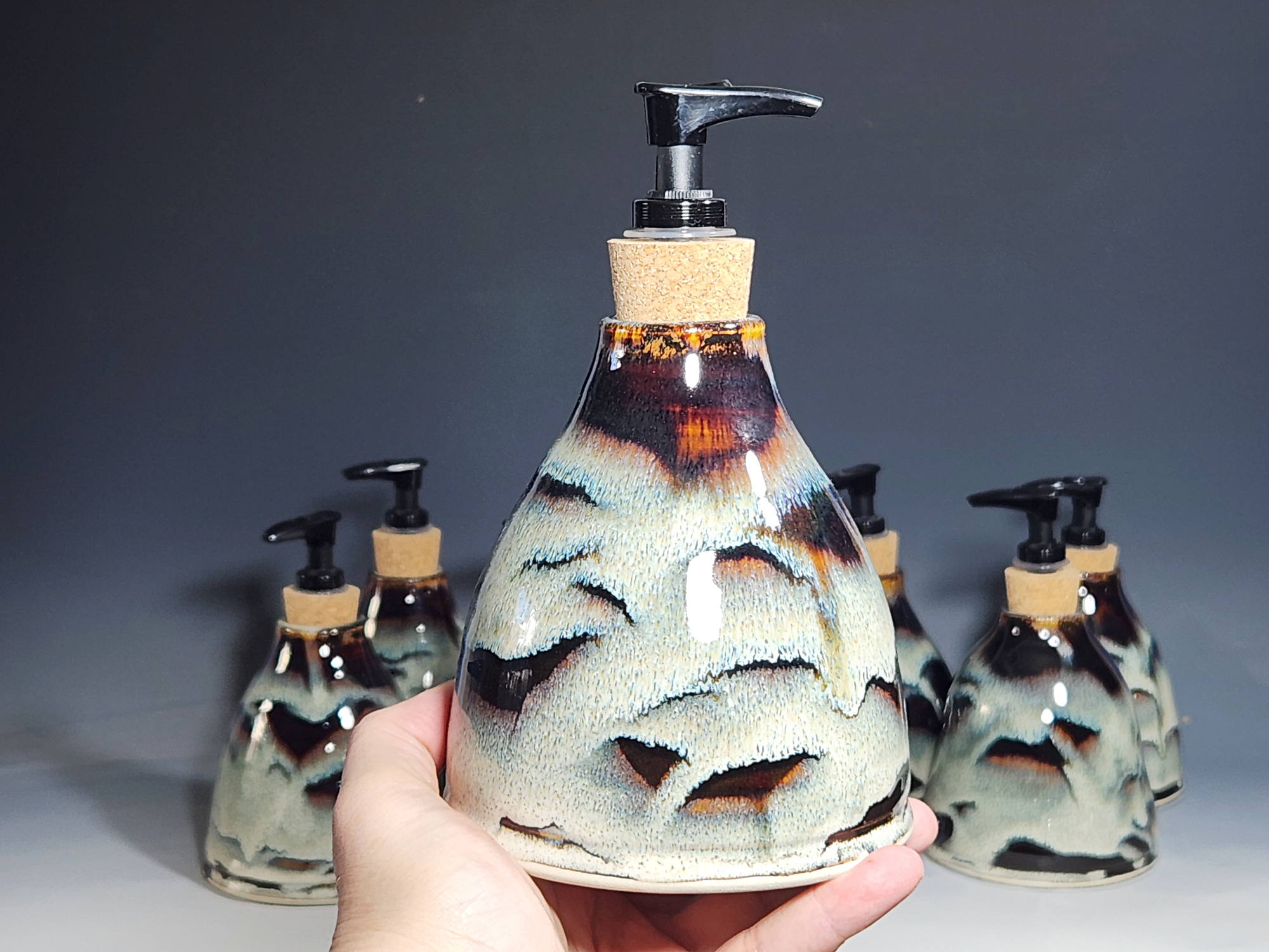 These hand-thrown ceramic soap pumps are all dressed up in my glaze combination, “Thoreau’s Pond.” Beautiful, functional soap dispenser holds your soap in style. It’s big enough to hold lots of soap, and small enough to fit on a bathroom or kitchen counter. It’s easy to refill and easy to clean; when it gets dusty, just tuck it into the dishwasher! Makes a great housewarming or wedding gift.