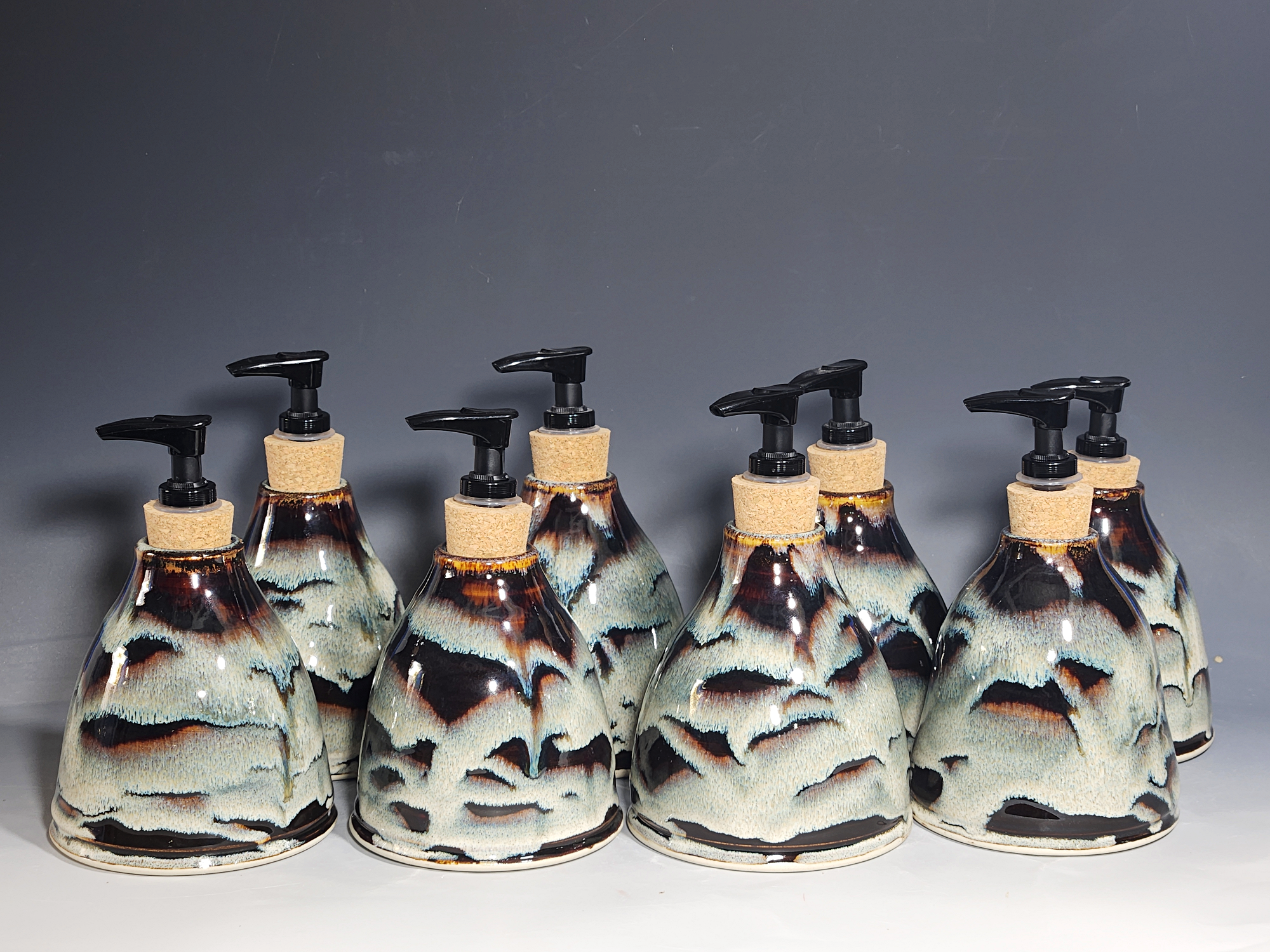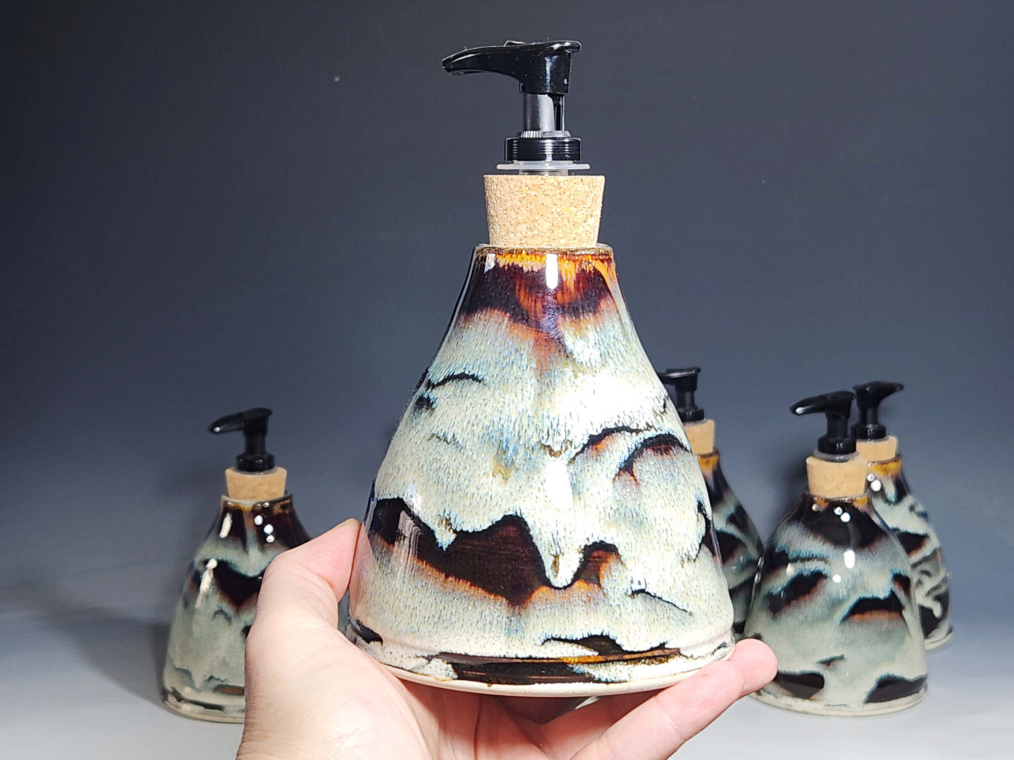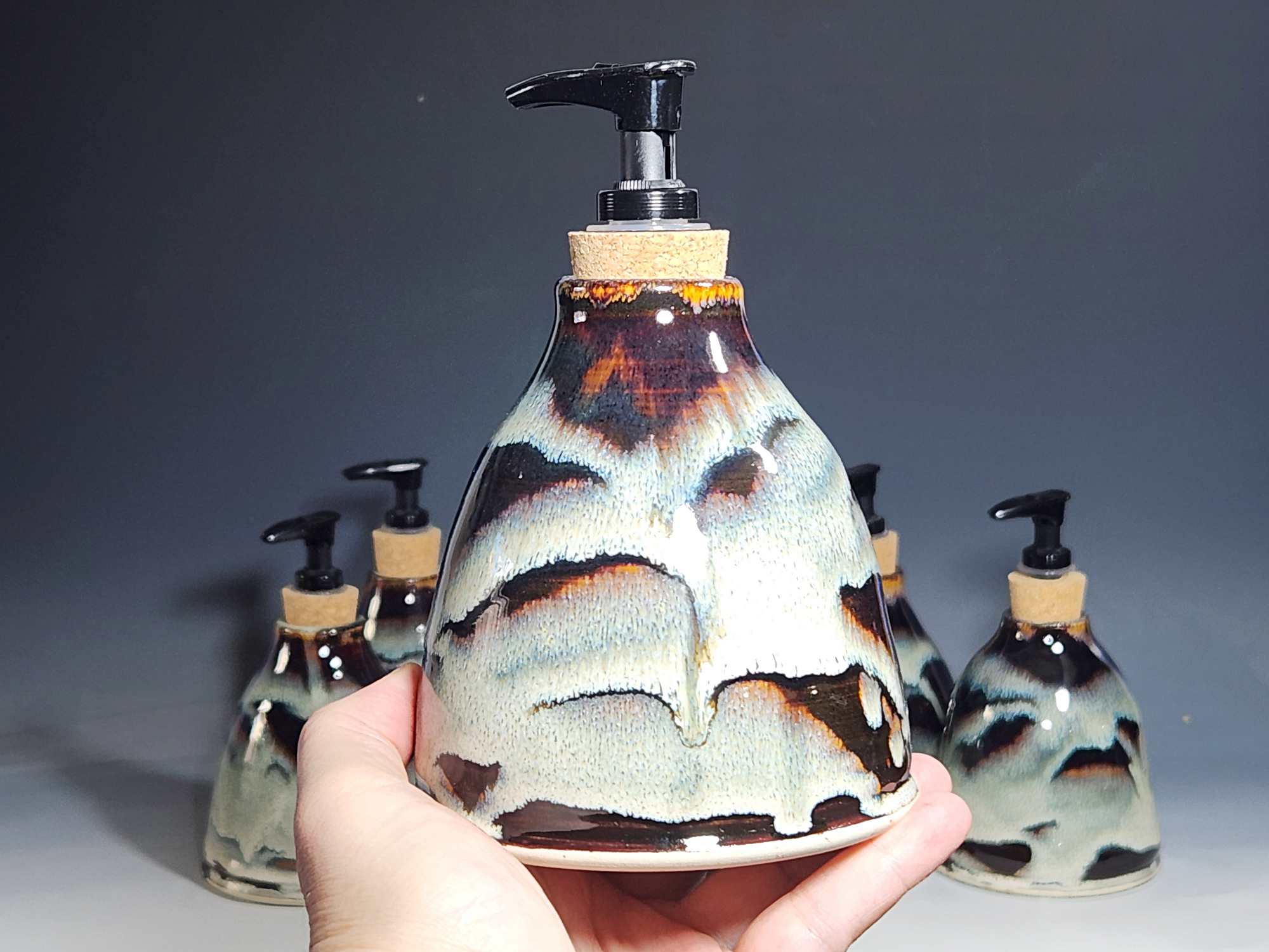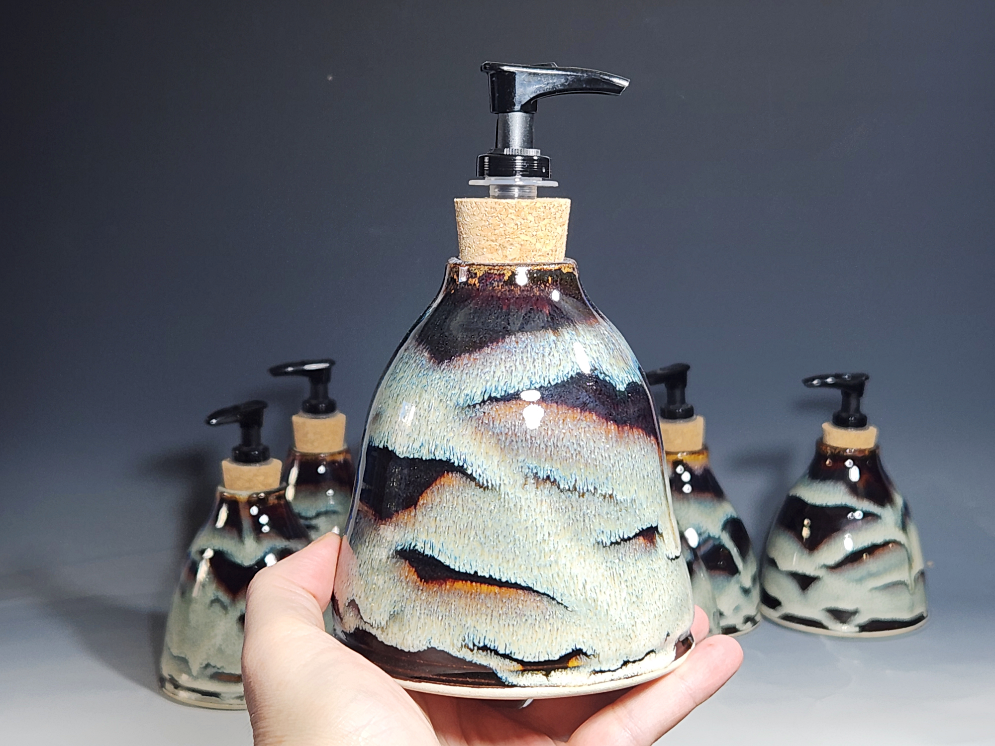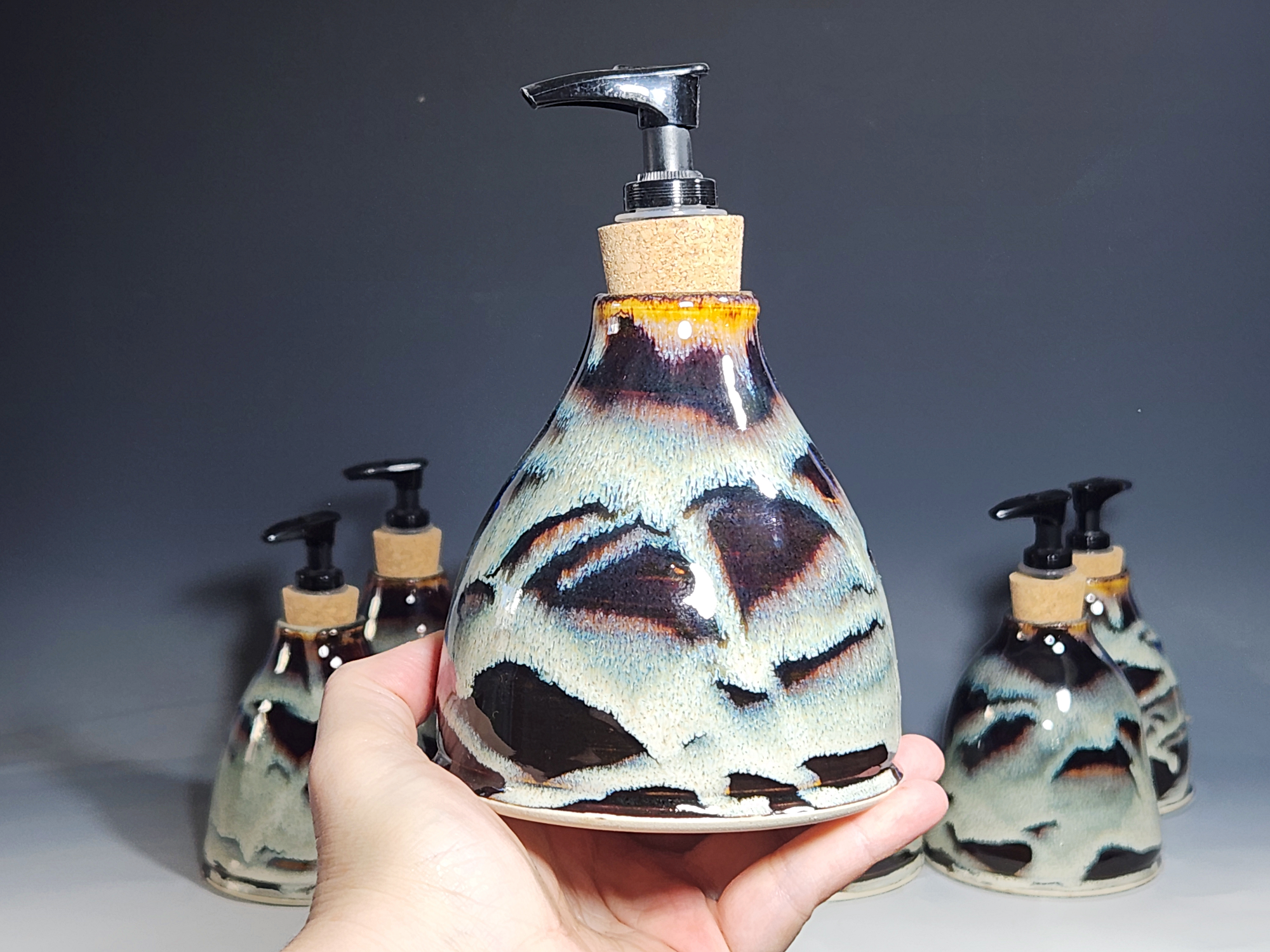 These hand-thrown ceramic soap pumps are all dressed up in my glaze combination, “Thoreau’s Pond.” Beautiful, functional soap dispenser holds your soap in style. It’s big enough to hold lots of soap, and small enough to fit on a bathroom or kitchen counter. It’s easy to refill and easy to clean; when it gets dusty, just tuck it into the dishwasher! Makes a great housewarming or wedding gift.