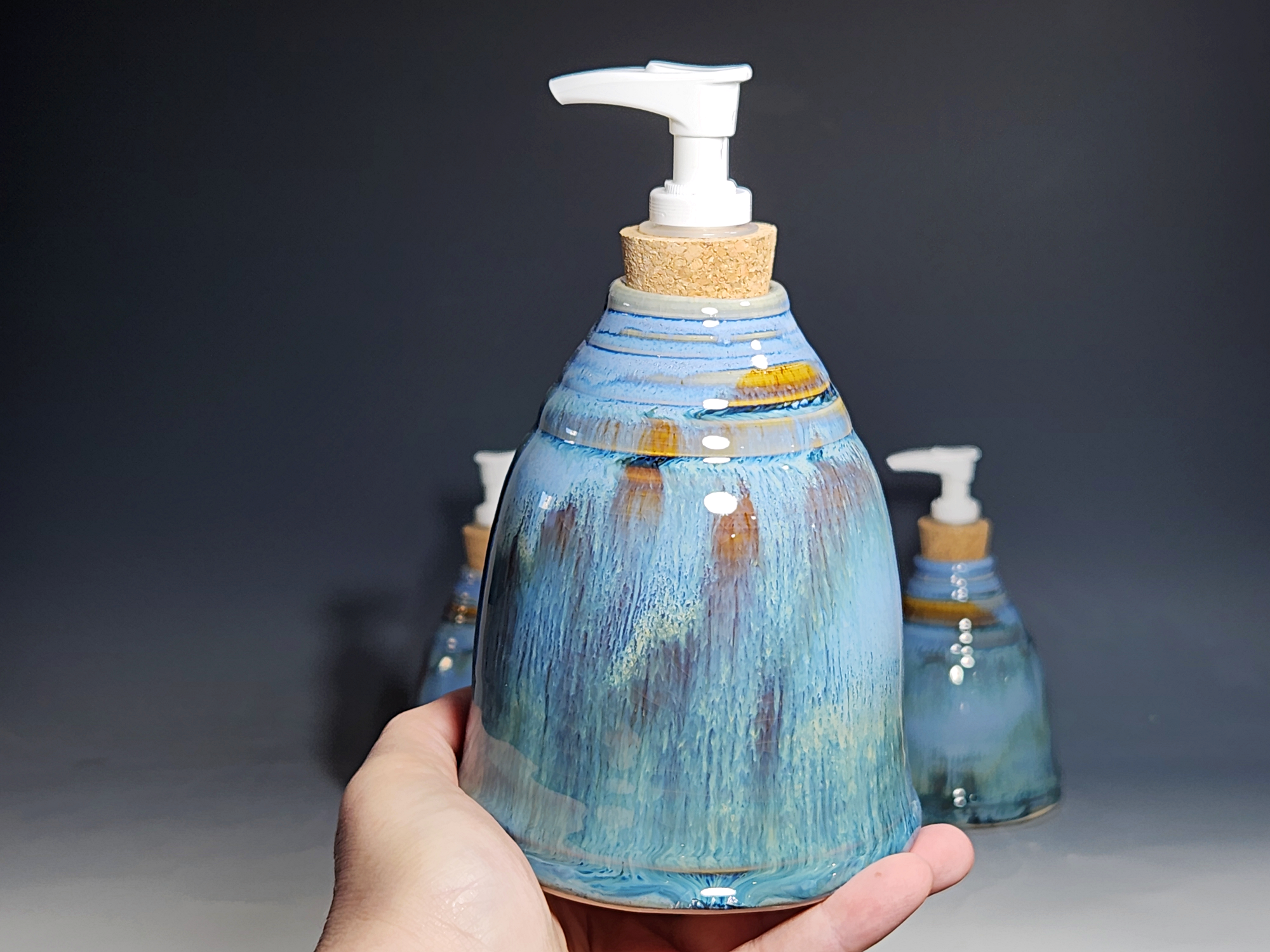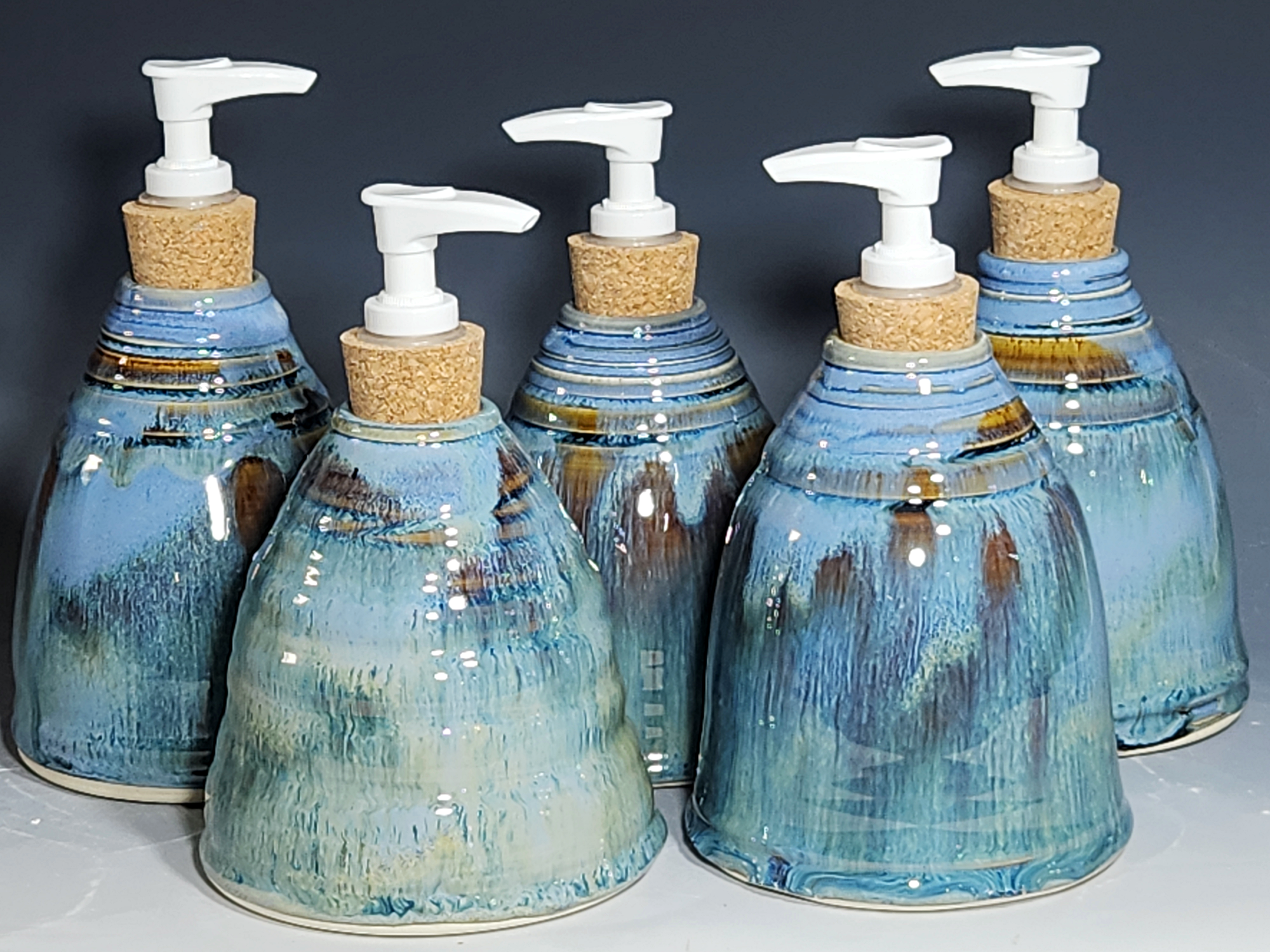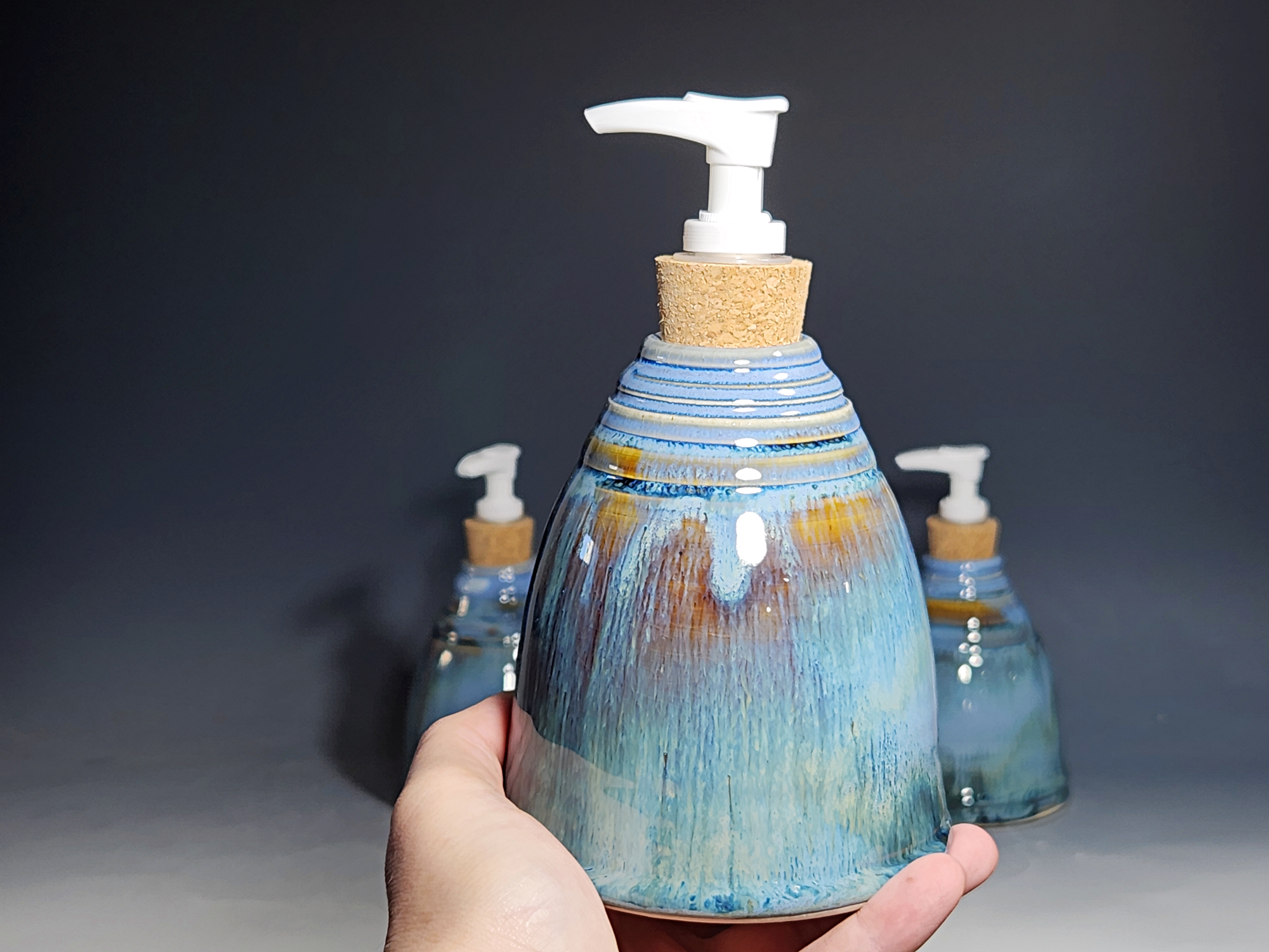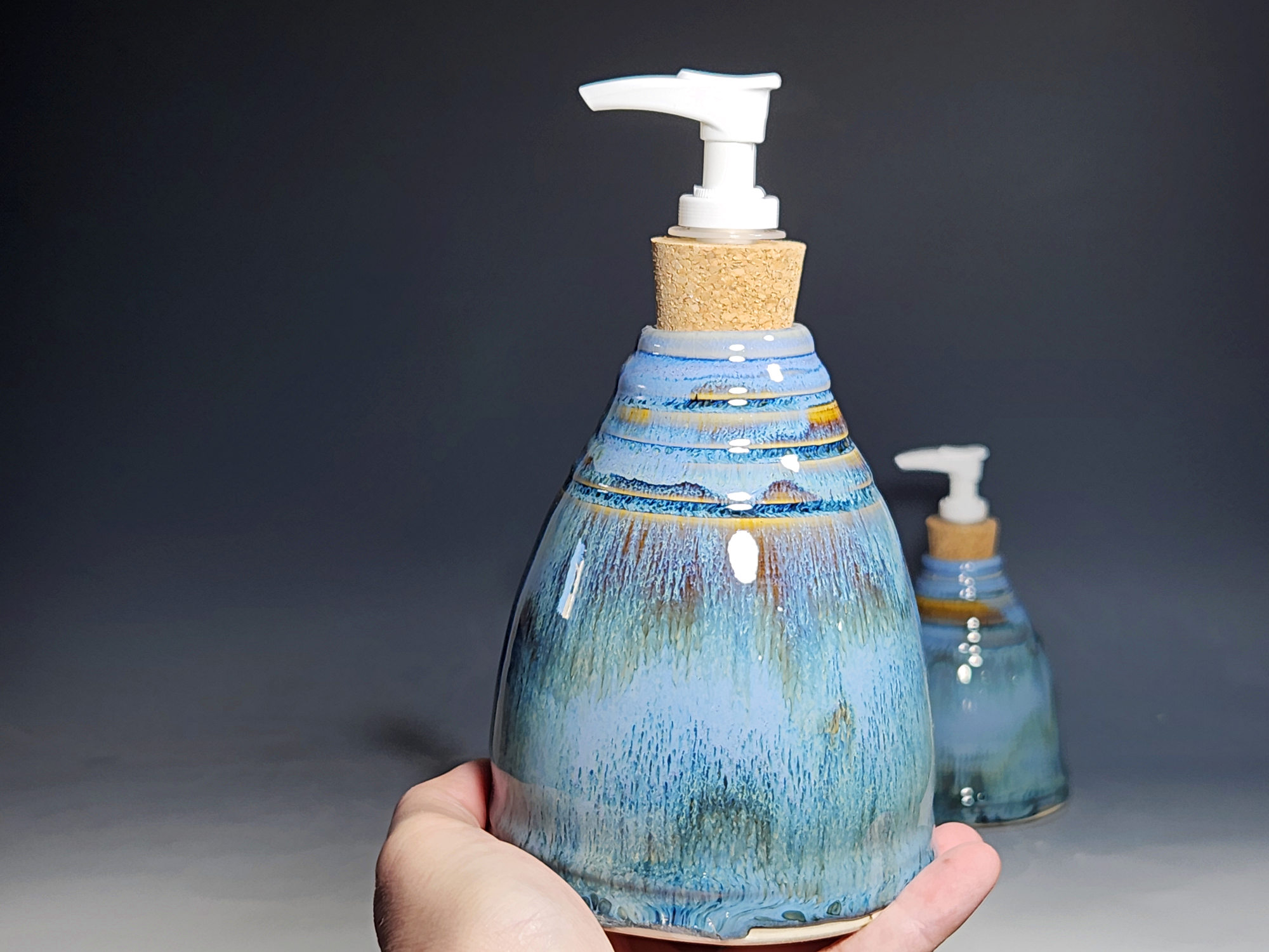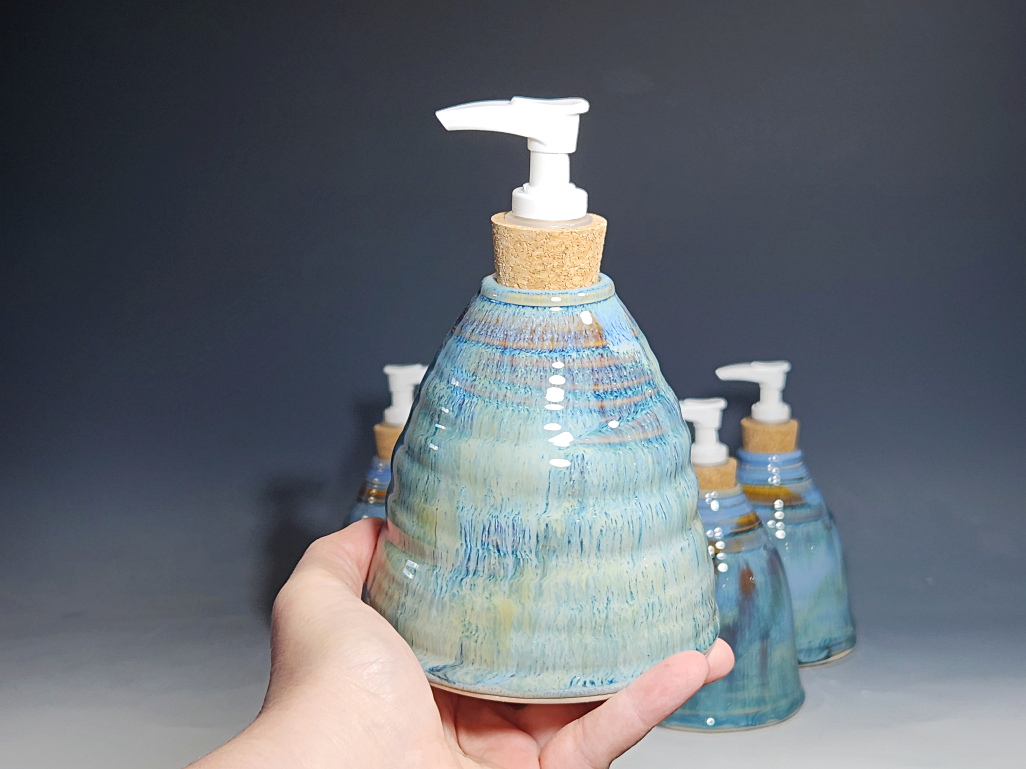 These hand-thrown ceramic soap pumps are all dressed up in my glaze combination, “Winter Lake.” Beautiful, functional soap dispenser holds your soap in style. It’s big enough to hold lots of soap, and small enough to fit on a bathroom or kitchen counter. It’s easy to refill and easy to clean; when it gets dusty, just tuck it into the dishwasher! Makes a great housewarming or wedding gift.