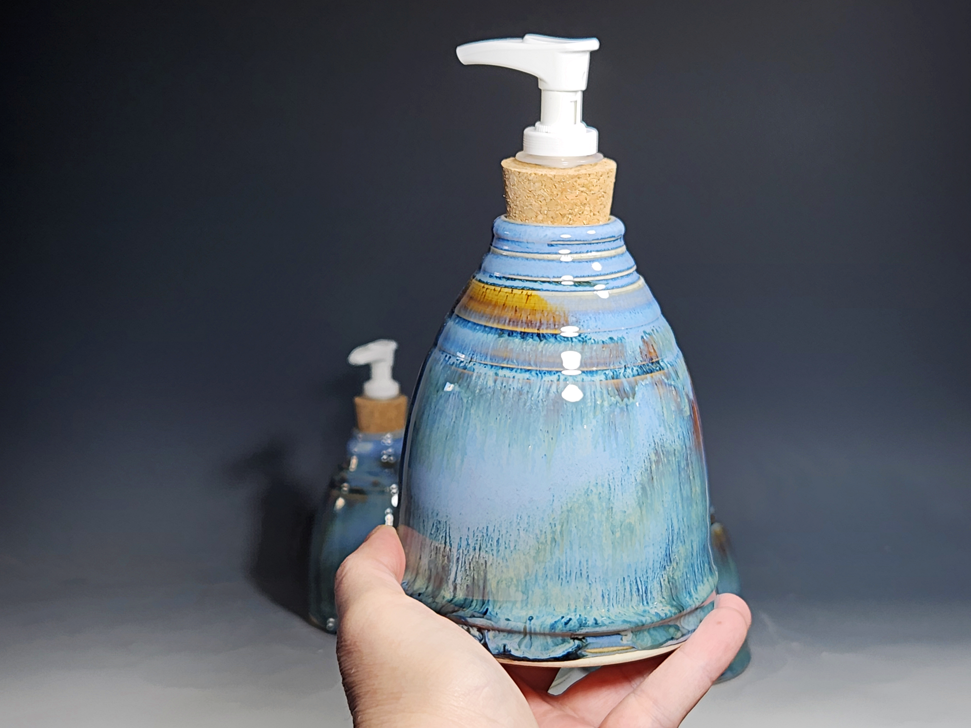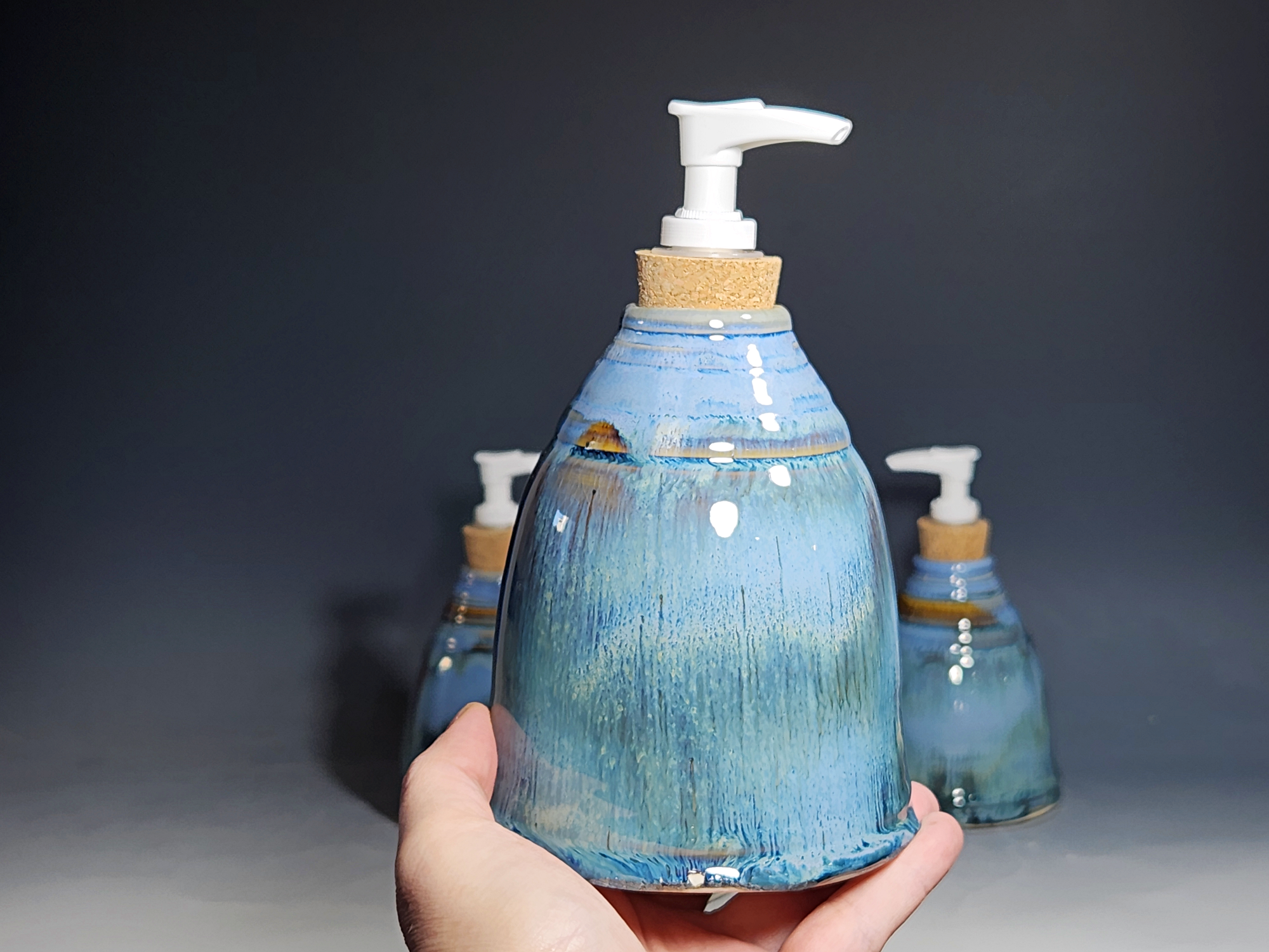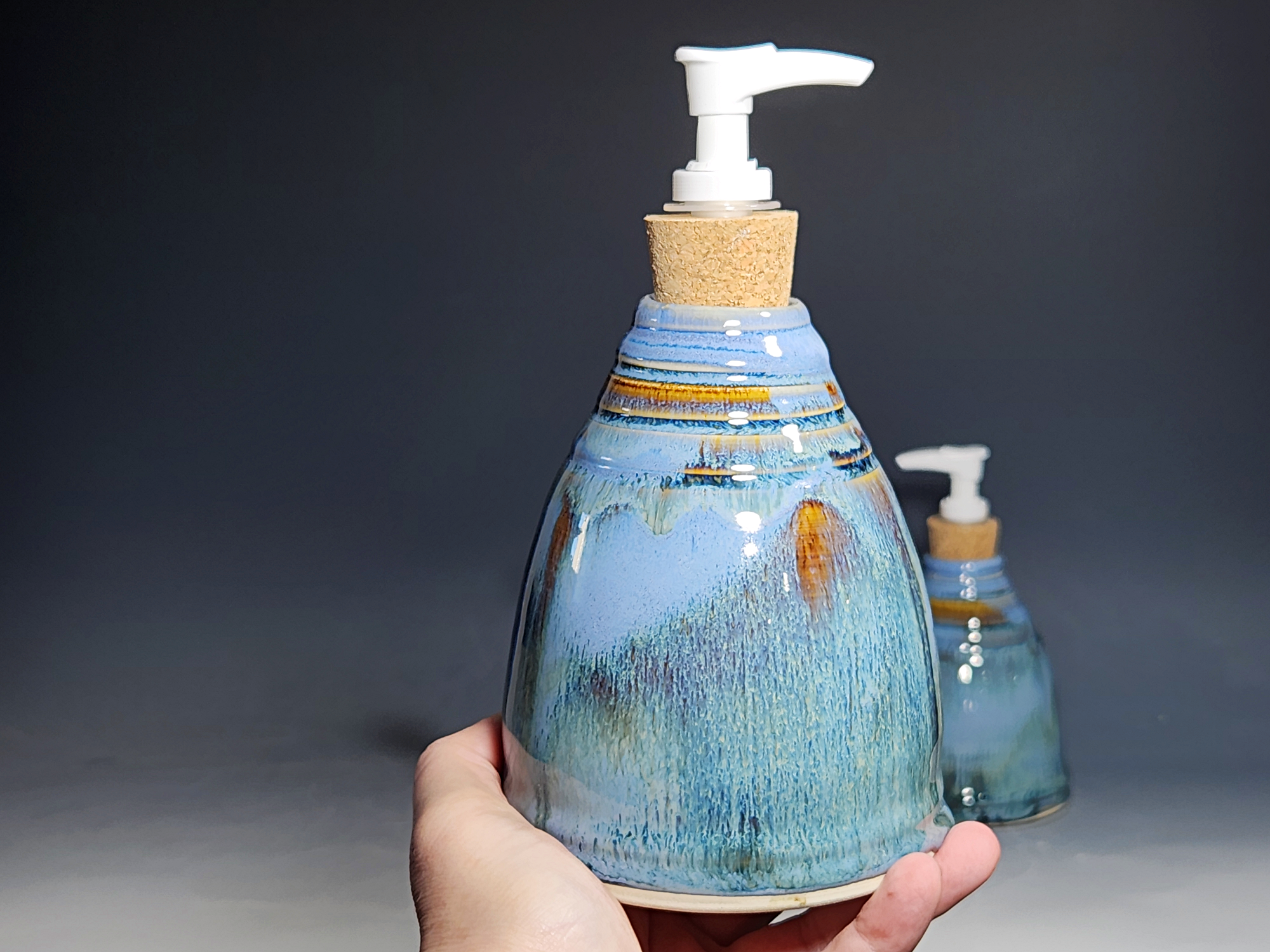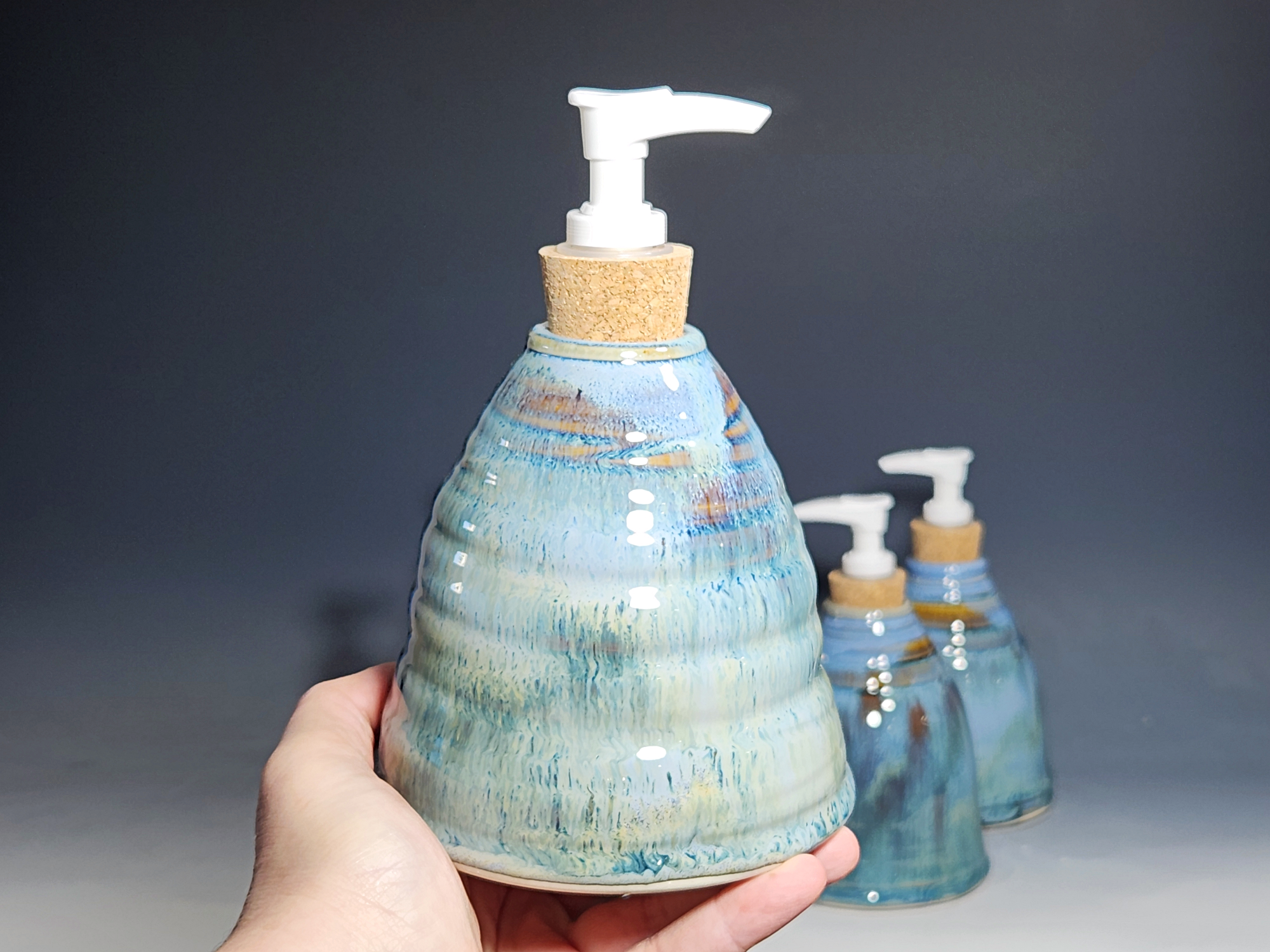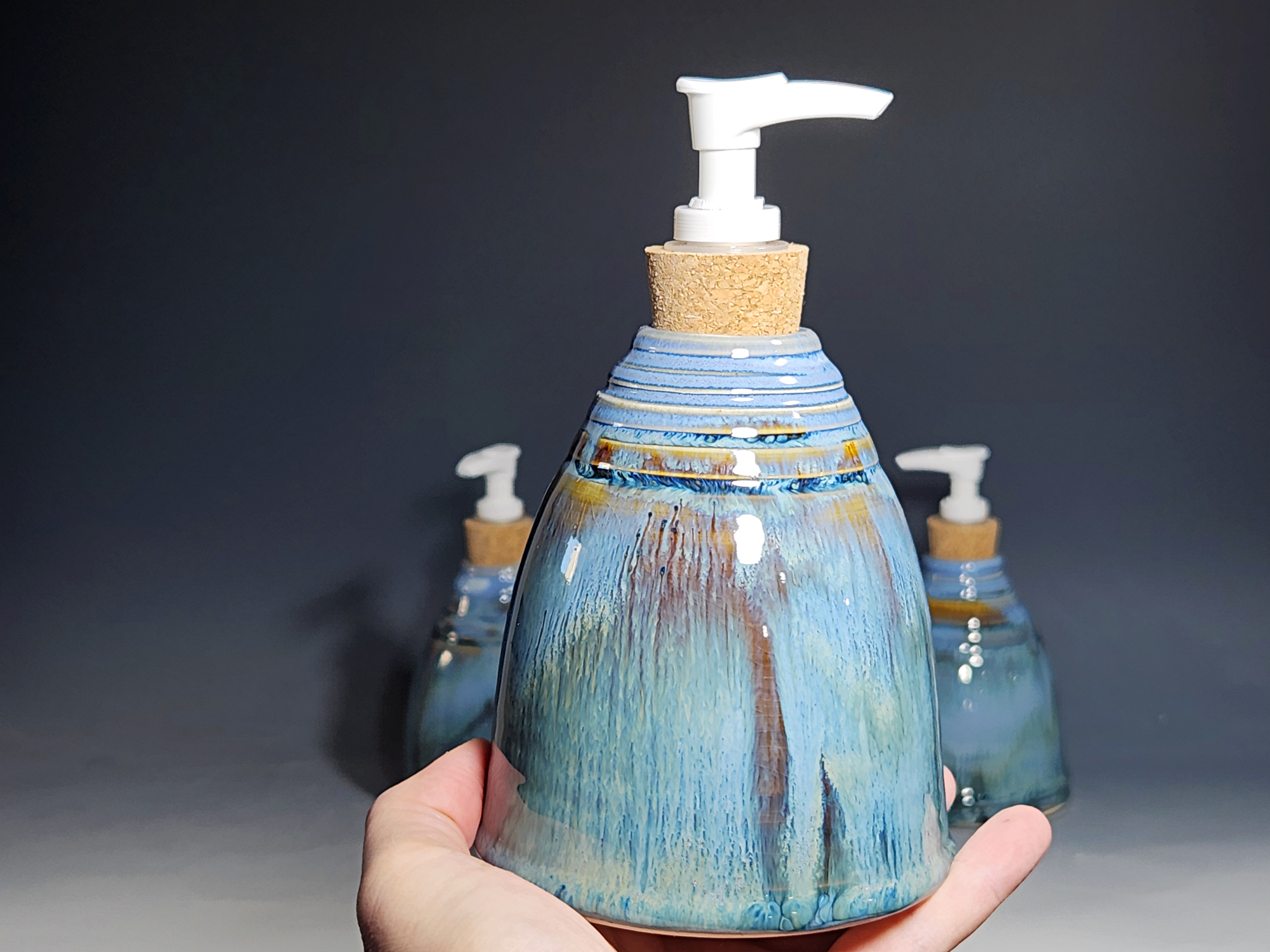 These hand-thrown ceramic soap pumps are all dressed up in my glaze combination, “Winter Lake.” Beautiful, functional soap dispenser holds your soap in style. It’s big enough to hold lots of soap, and small enough to fit on a bathroom or kitchen counter. It’s easy to refill and easy to clean; when it gets dusty, just tuck it into the dishwasher! Makes a great housewarming or wedding gift.