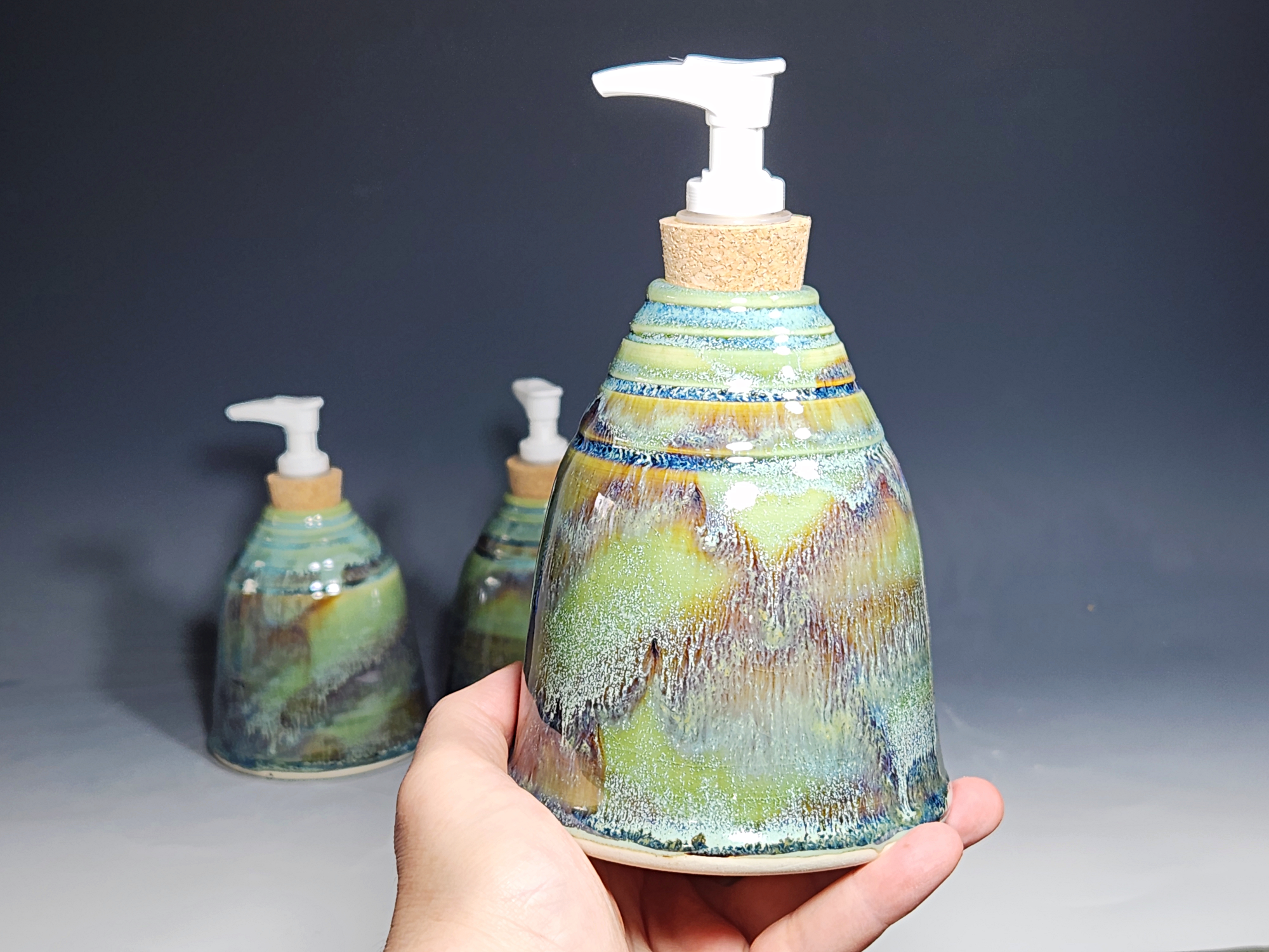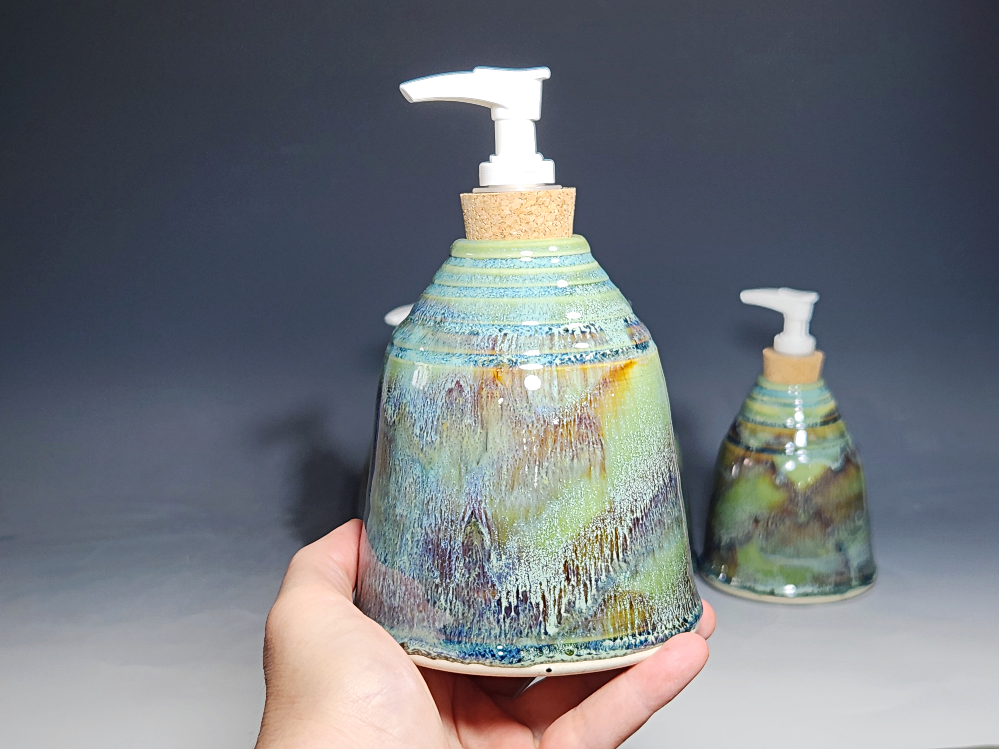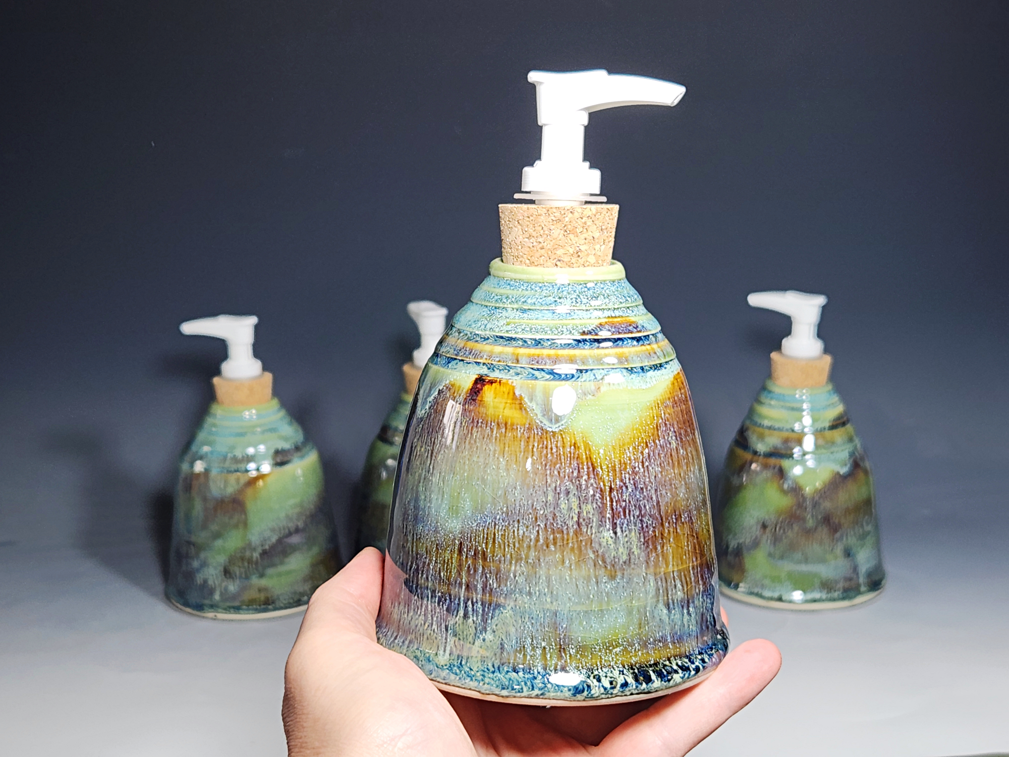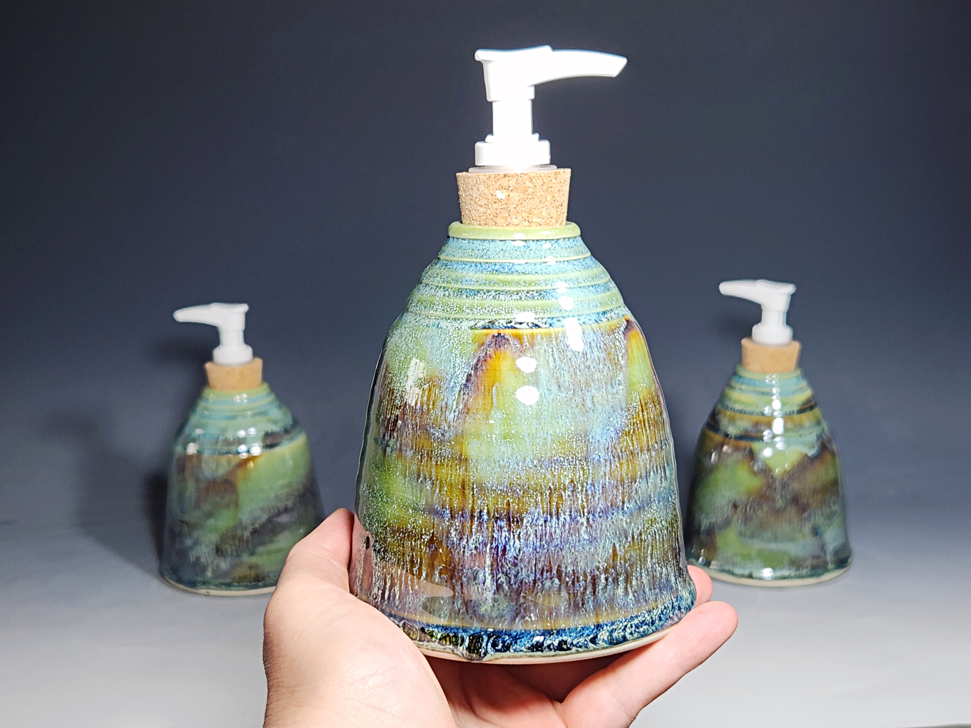 These hand-thrown ceramic soap dispenser pumps are all dressed up in a my glaze combination, “Sea Foam,” consisting of glazes I mix in-house. Beautiful, functional soap dispenser holds your soap in style. It’s big enough to hold lots of soap, and small enough to fit on a bathroom or kitchen counter. It’s easy to refill and easy to clean; when it gets dusty, just tuck it into the dishwasher! Makes a great housewarming gift.