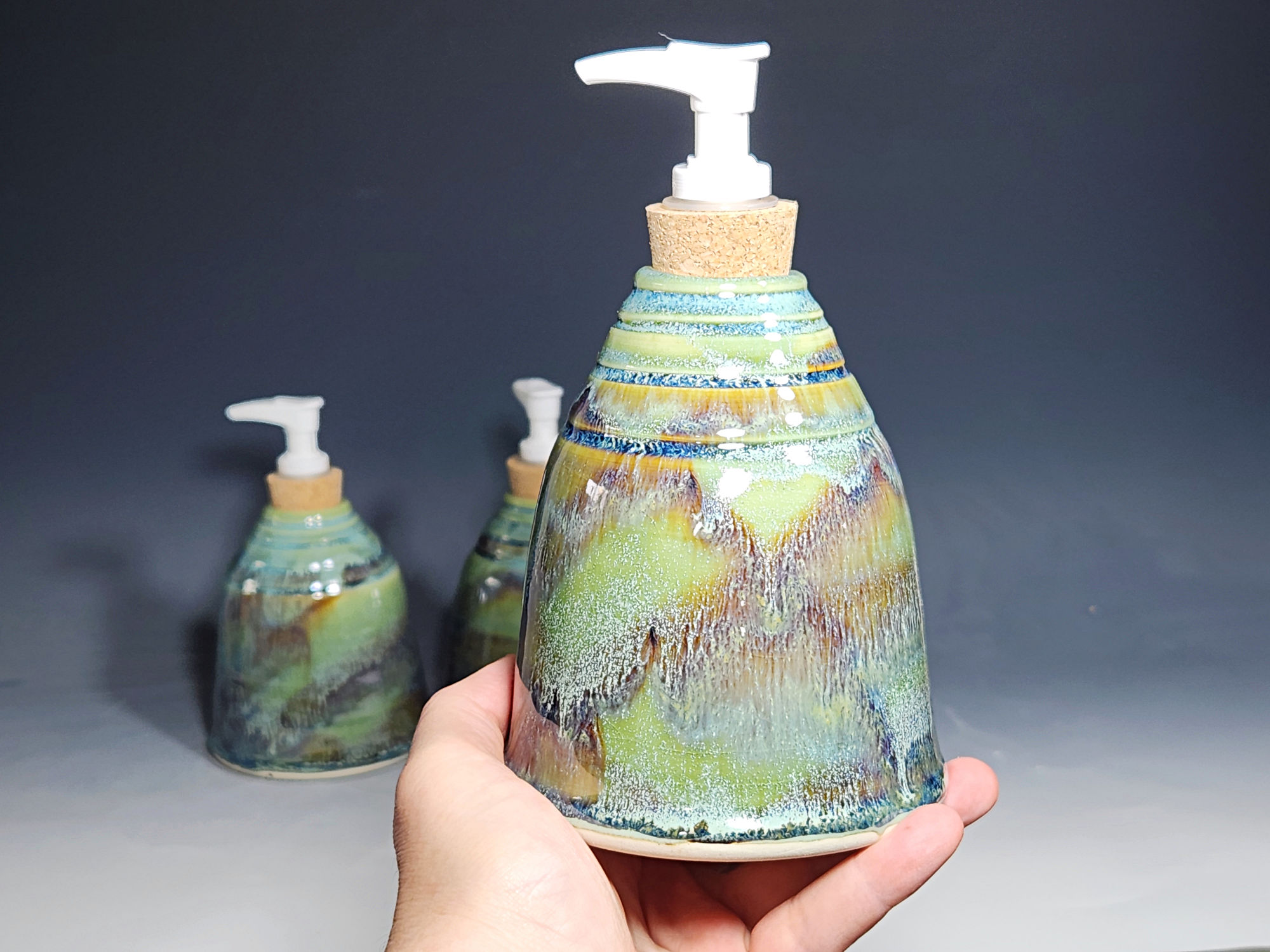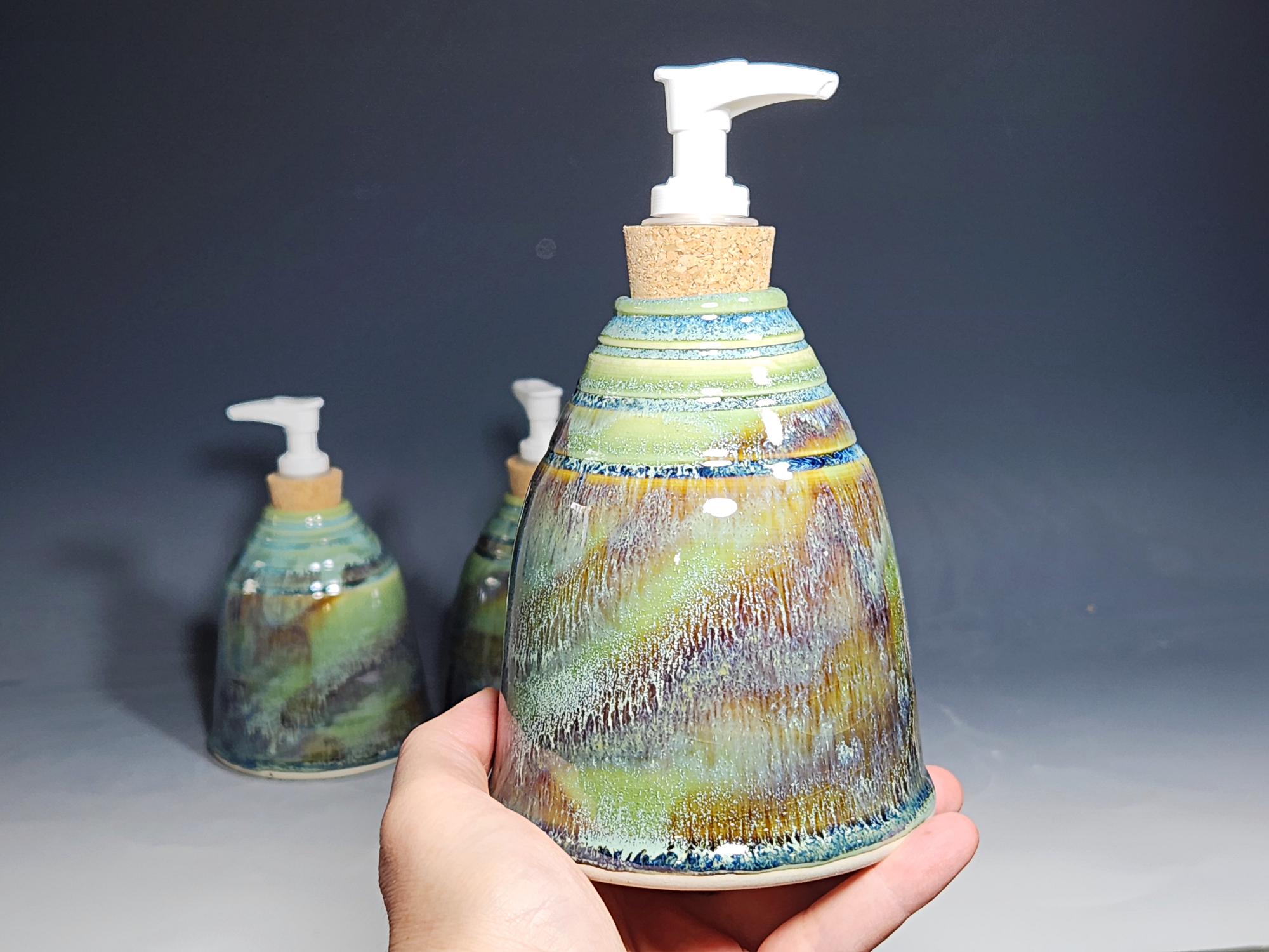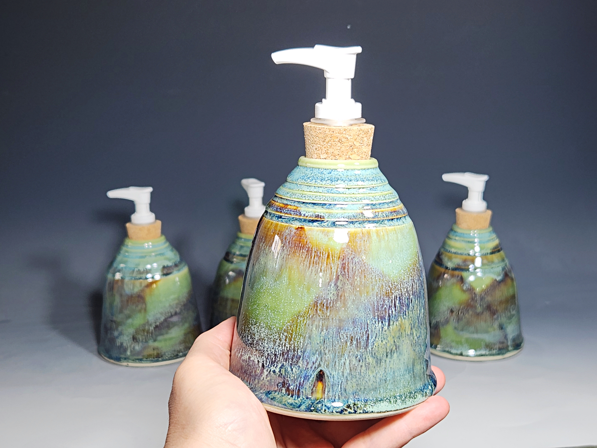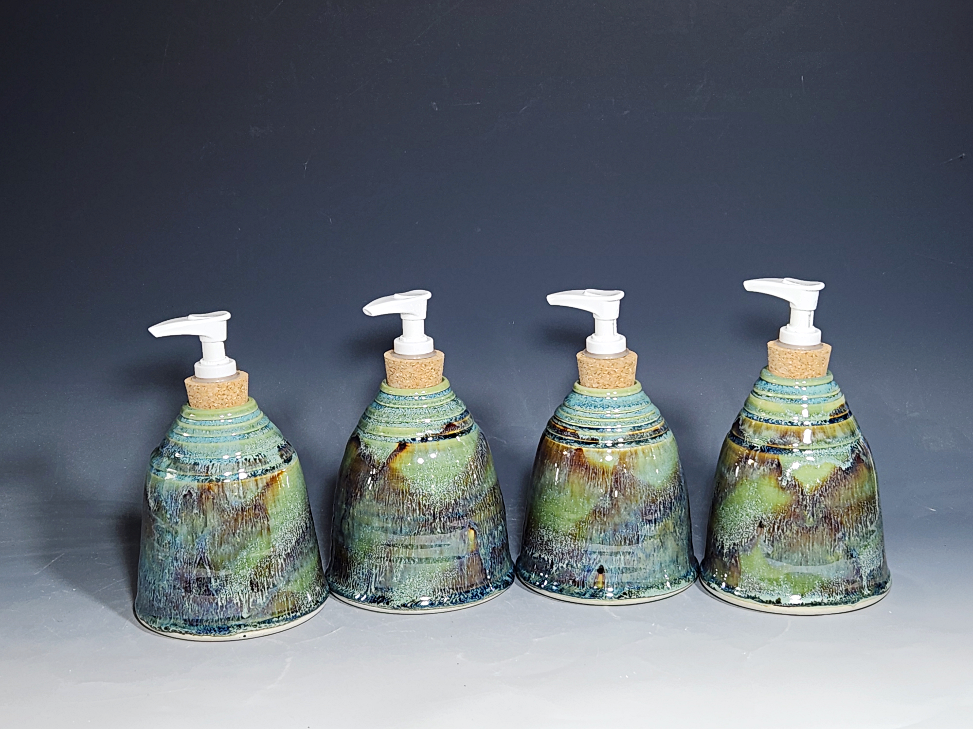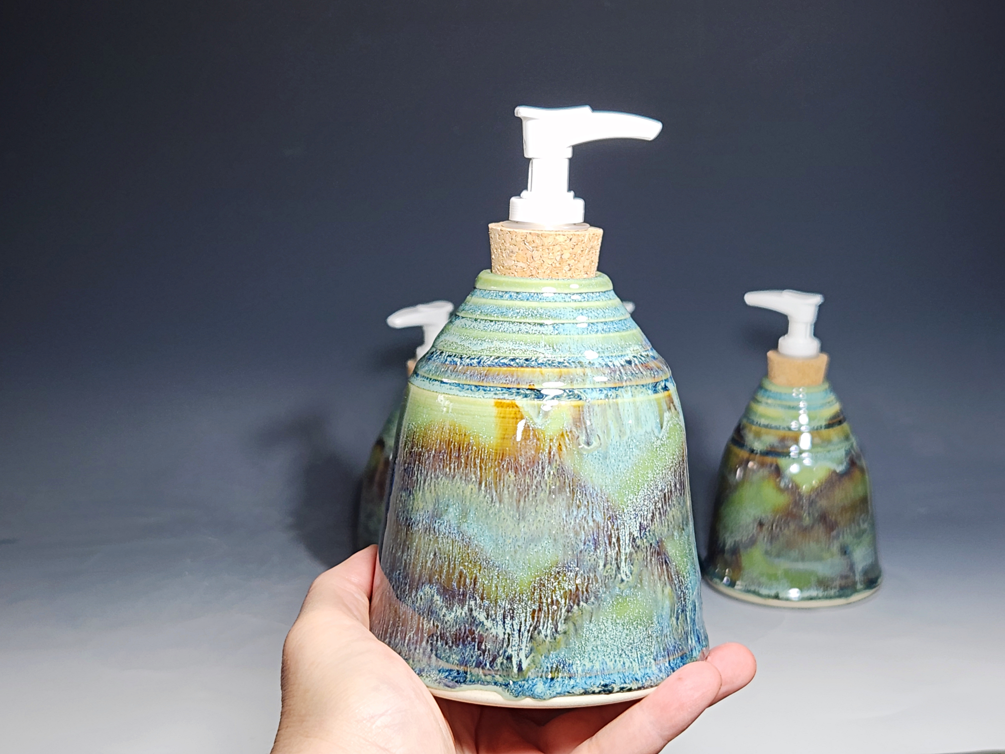 These hand-thrown ceramic soap dispenser pumps are all dressed up in a my glaze combination, “Sea Foam,” consisting of glazes I mix in-house. Beautiful, functional soap dispenser holds your soap in style. It’s big enough to hold lots of soap, and small enough to fit on a bathroom or kitchen counter. It’s easy to refill and easy to clean; when it gets dusty, just tuck it into the dishwasher! Makes a great housewarming gift.