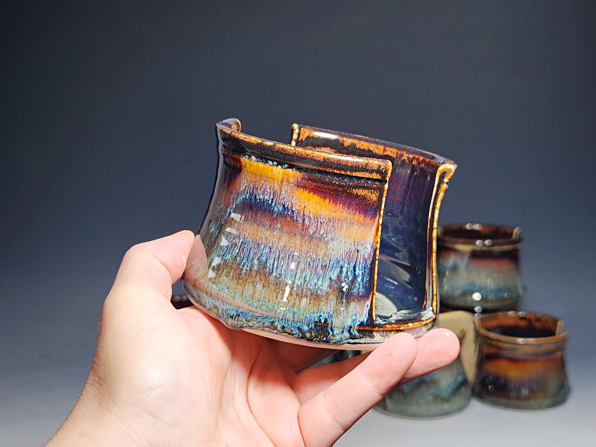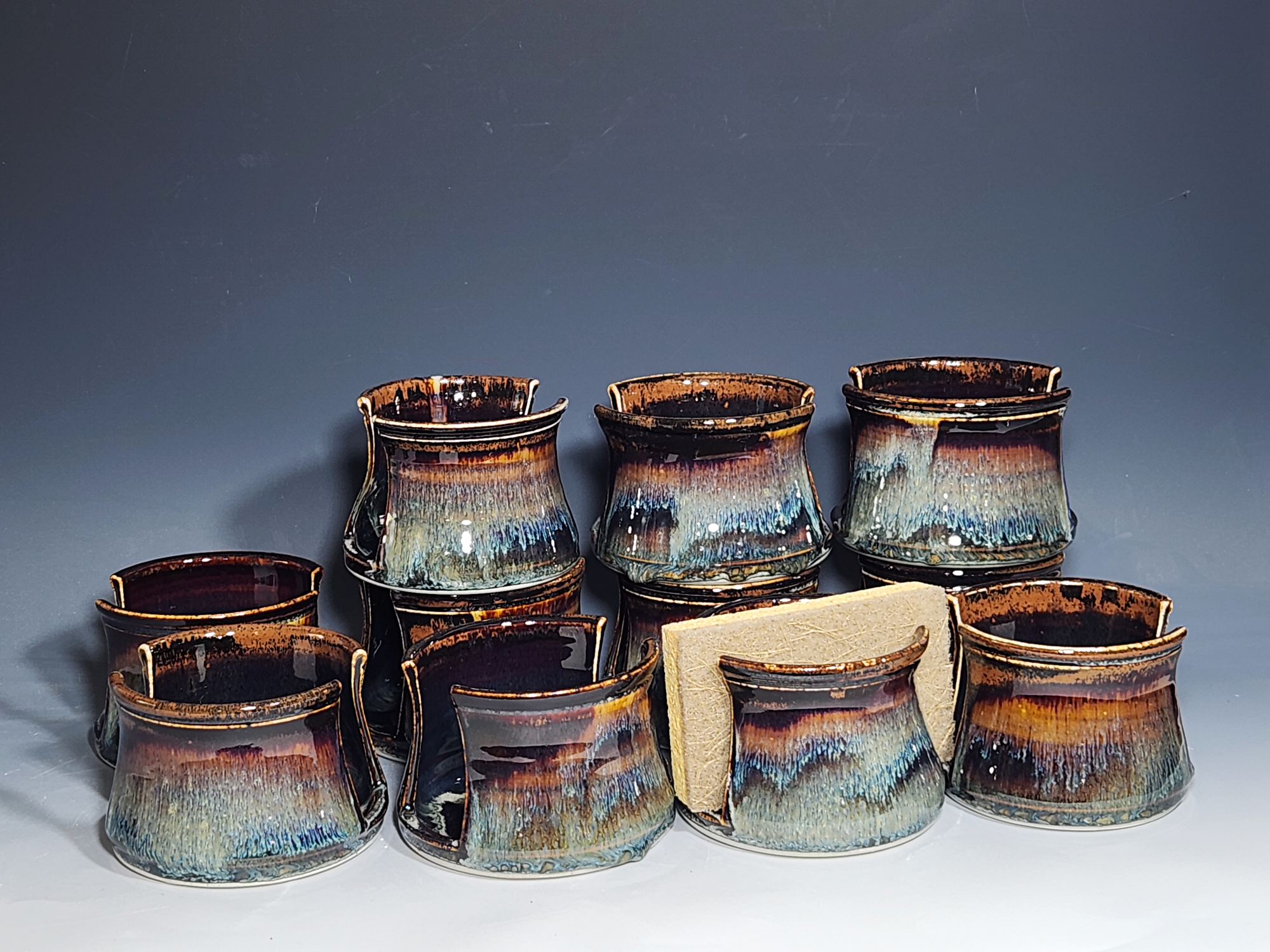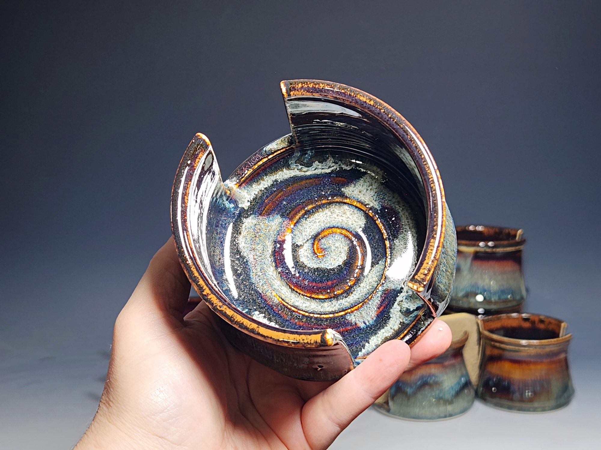 These pieces are all dressed up in my glaze combination, “Thoreau’s Pond!” Beautiful, functional kitchen sponge holder with a rich, variegated glaze is designed to elevate your kitchen sponges and allow them as much air flow as possible to dry faster and discourage the growth of bacteria. Helps keep your sink area organized and beautiful. Makes a great housewarming or bridesmaid’s gift.