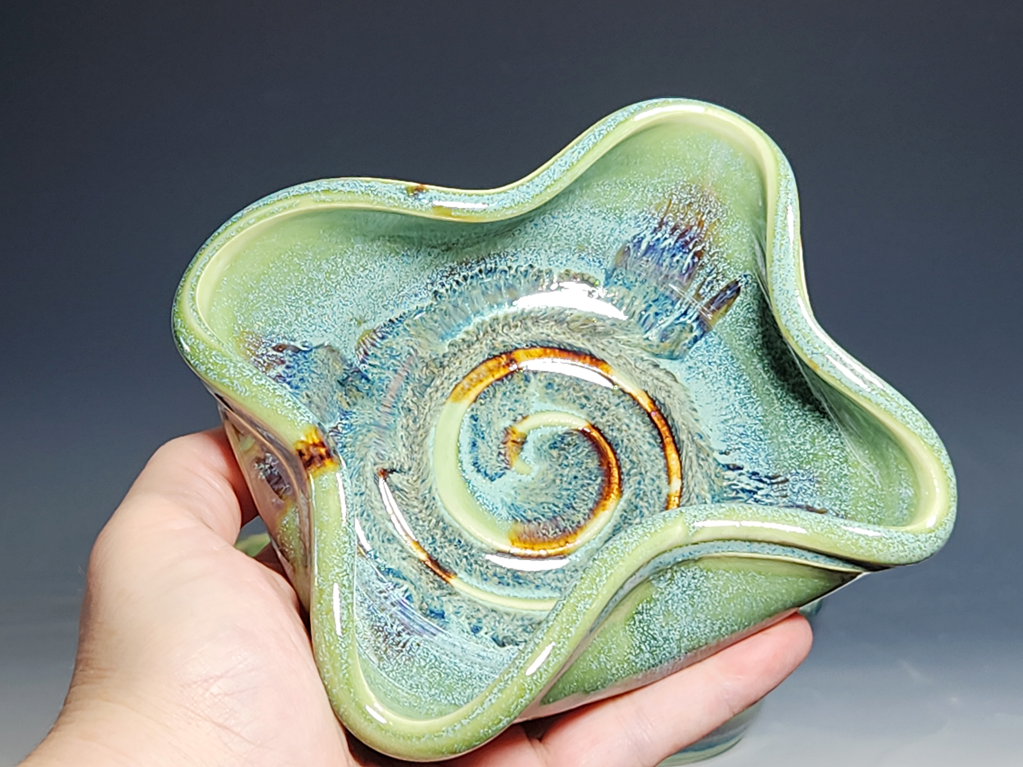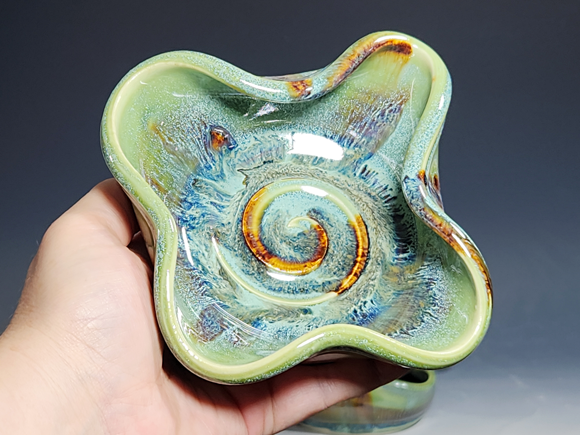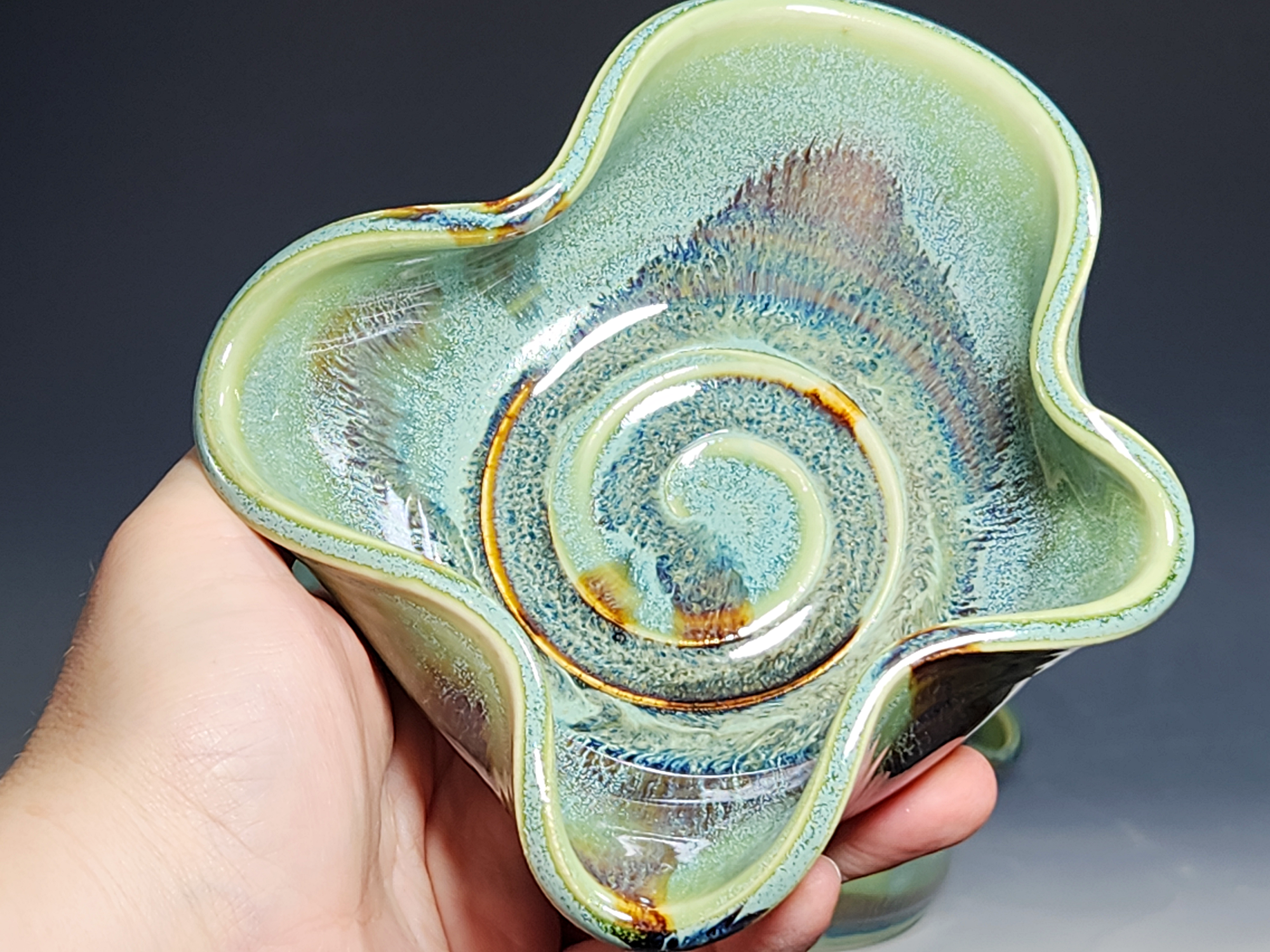 All dressed up in my green and iron glaze combination, “Seafoam,” this small hand-thrown ceramic jewelry holder makes a great simple, beautiful, and useful gift. Gorgeous, complex glaze of green over iron glows and highlights the texture of the well-made form. Great for birthdays or housewarmings, or buy it for yourself!