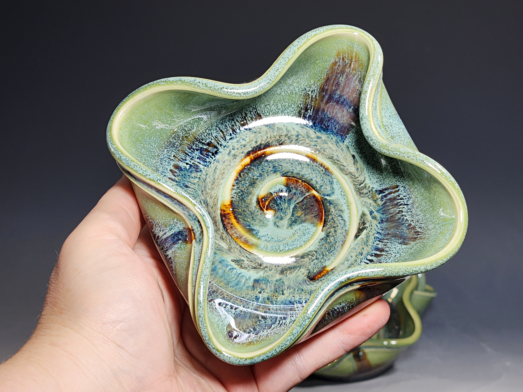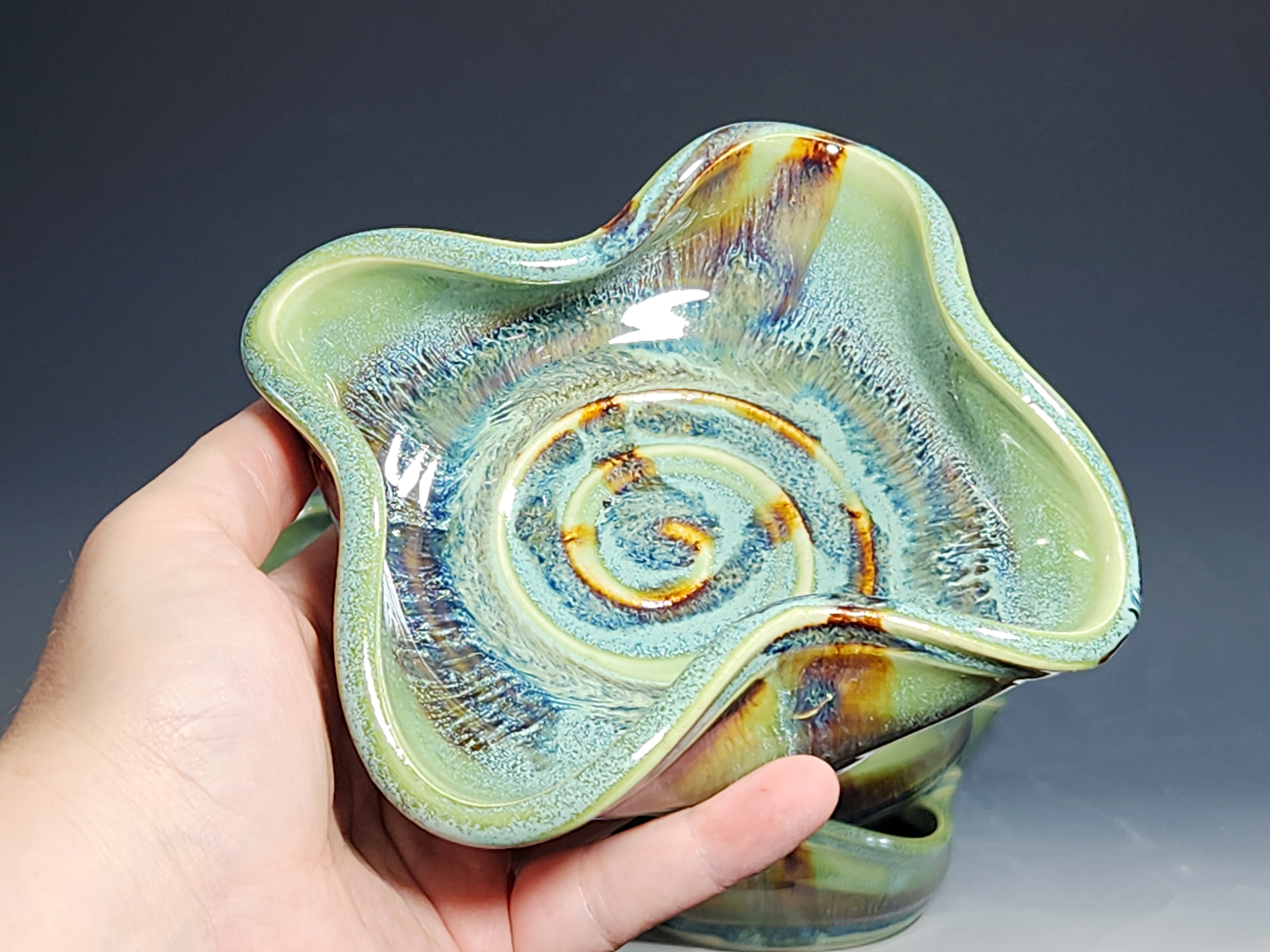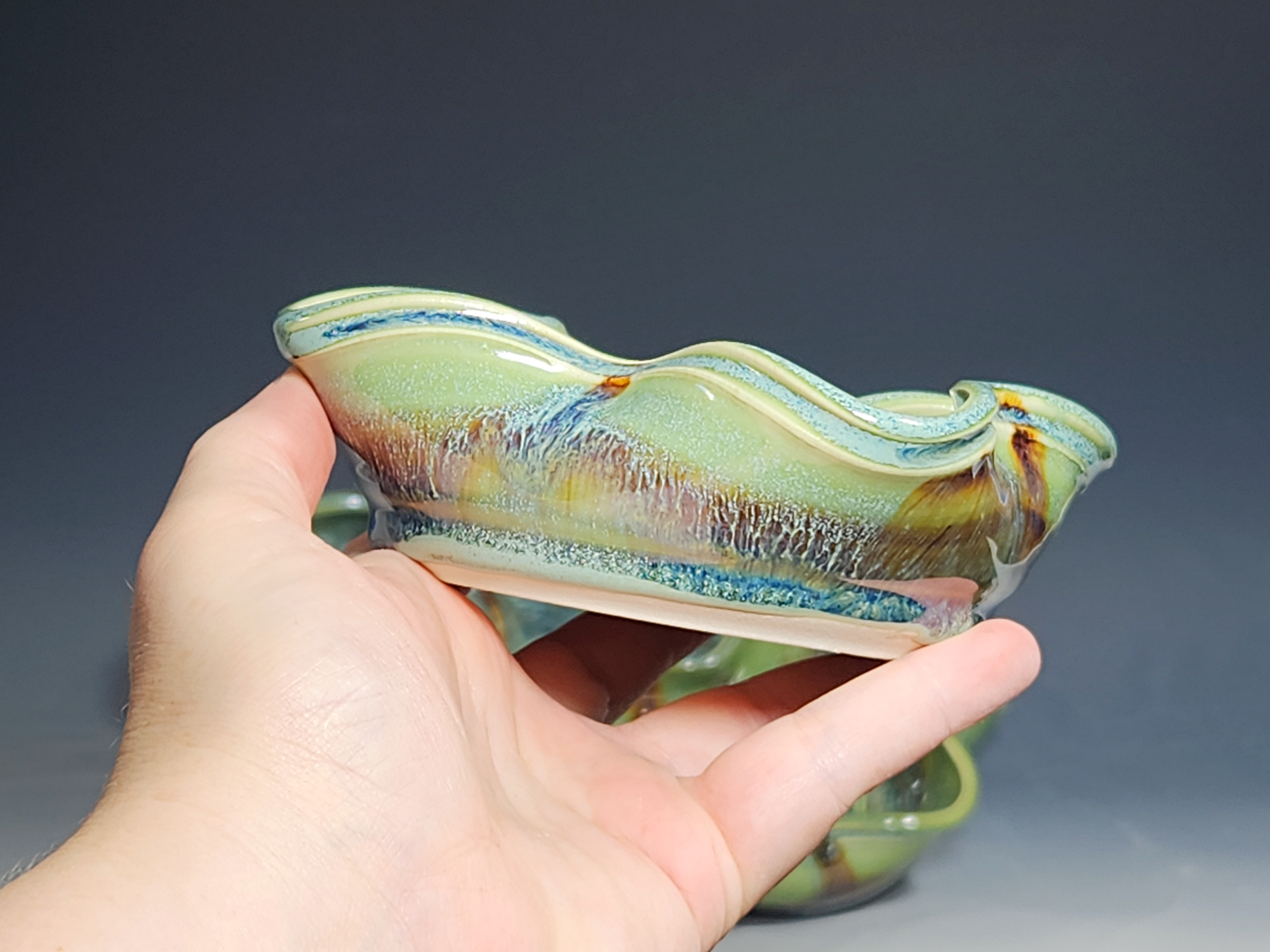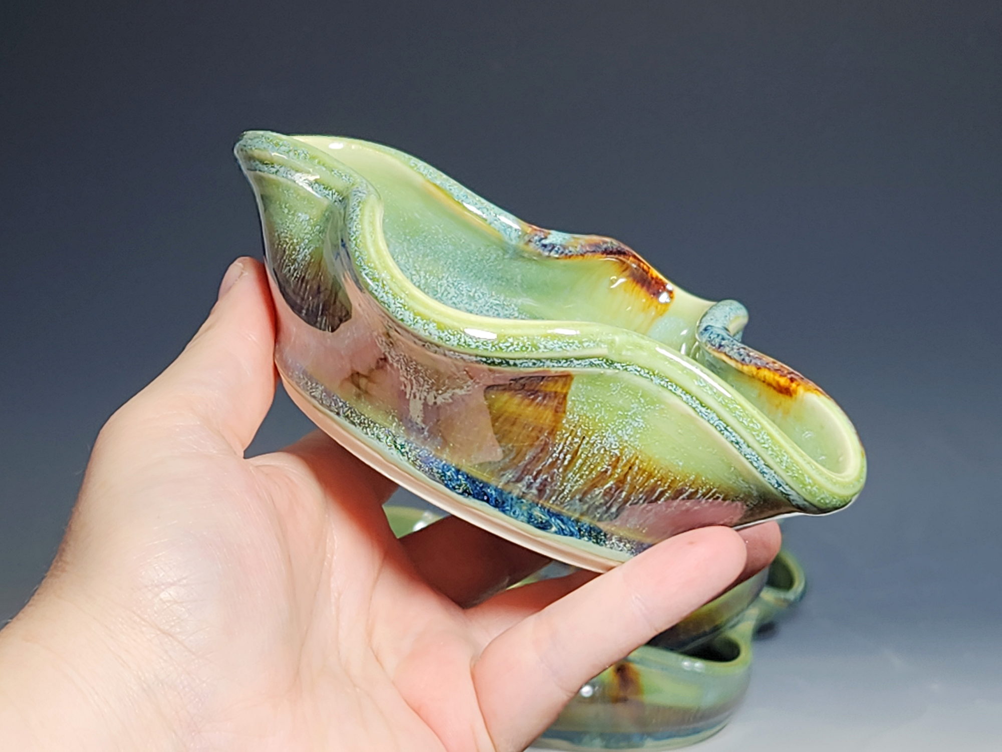 All dressed up in my green and iron glaze combination, “Seafoam,” this small hand-thrown ceramic jewelry holder makes a great simple, beautiful, and useful gift. Gorgeous, complex glaze of green over iron glows and highlights the texture of the well-made form. Great for birthdays or housewarmings, or buy it for yourself!