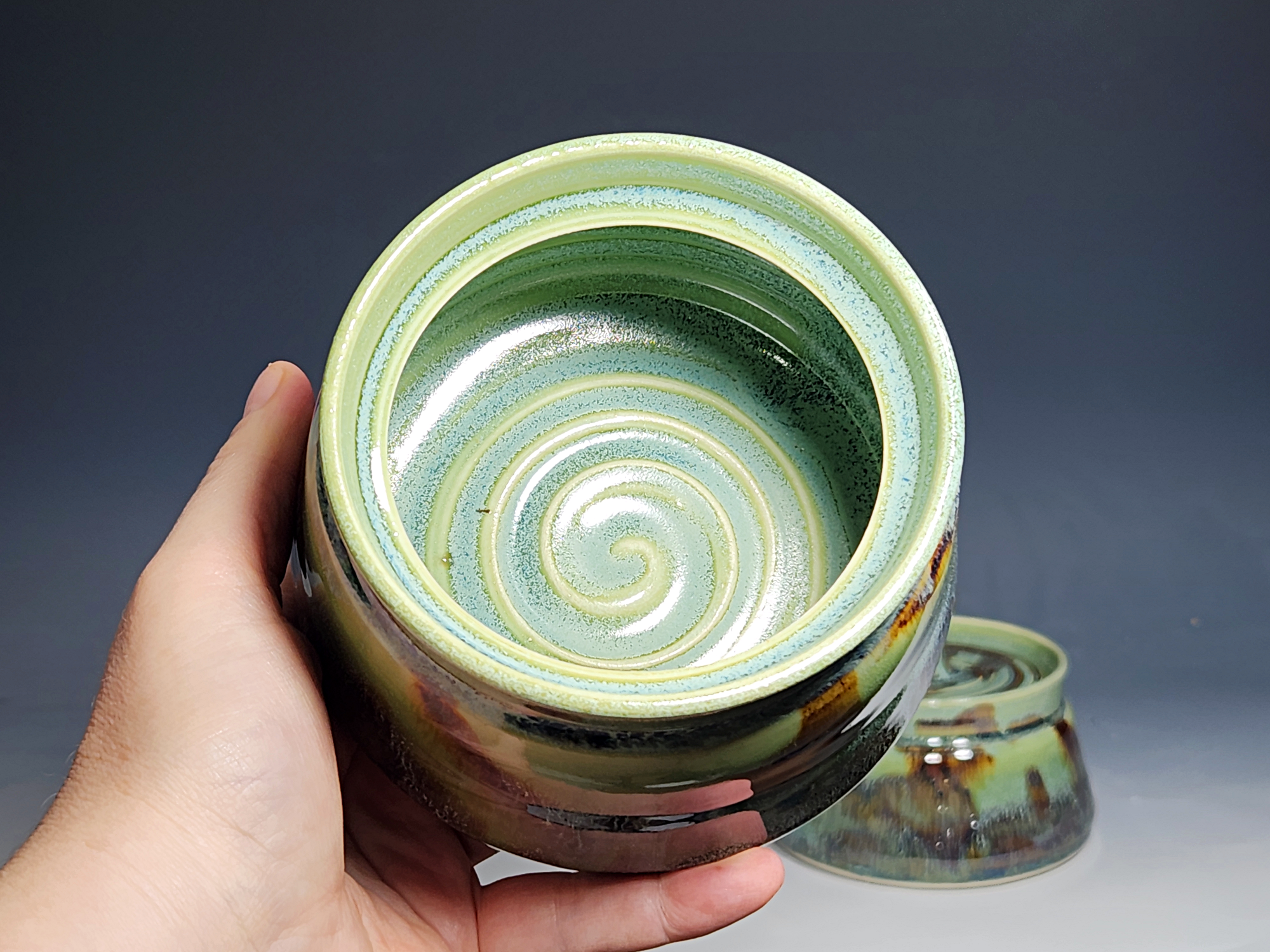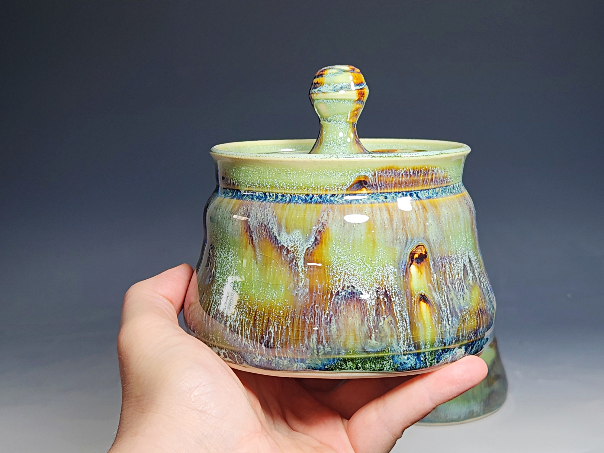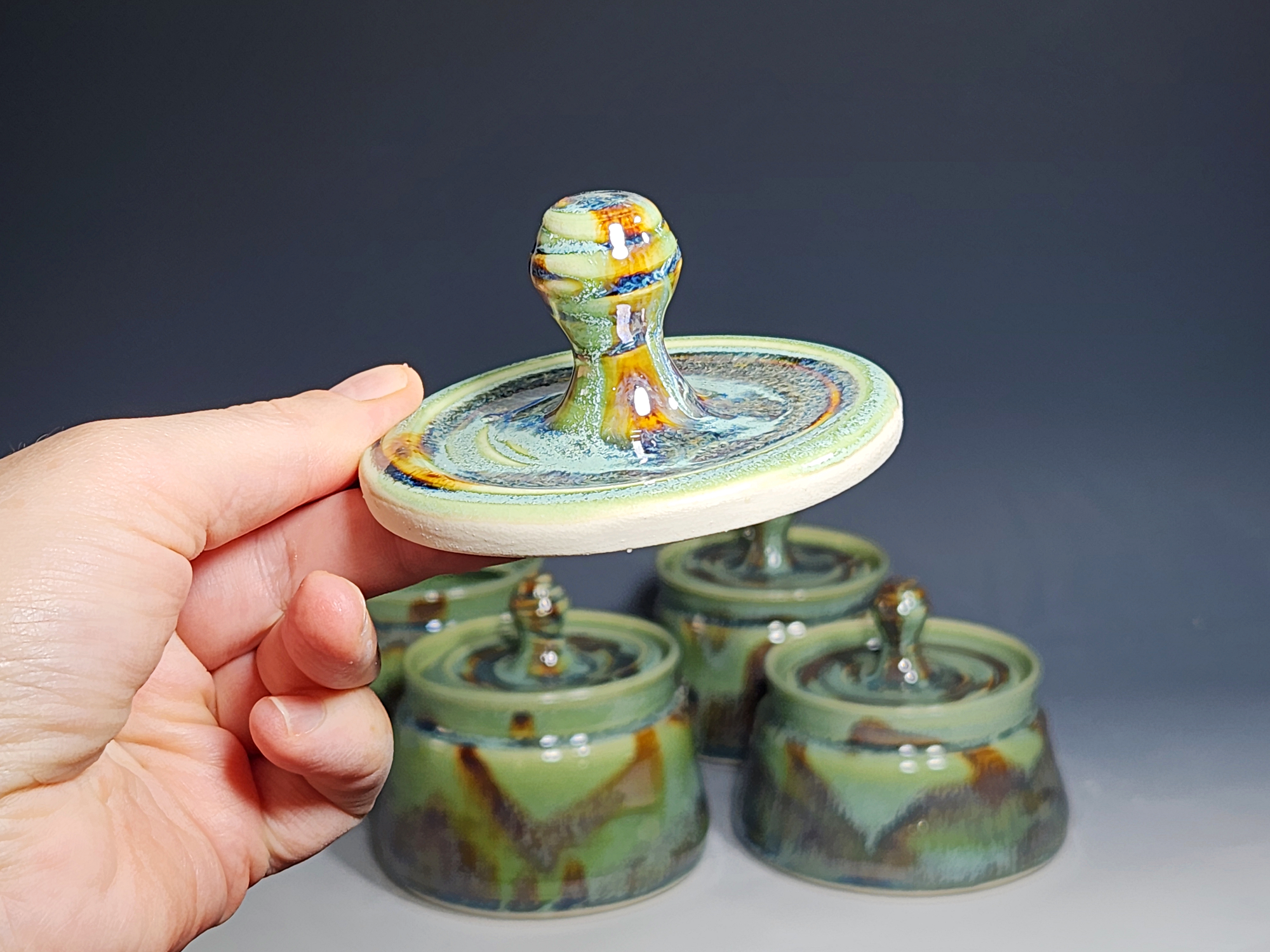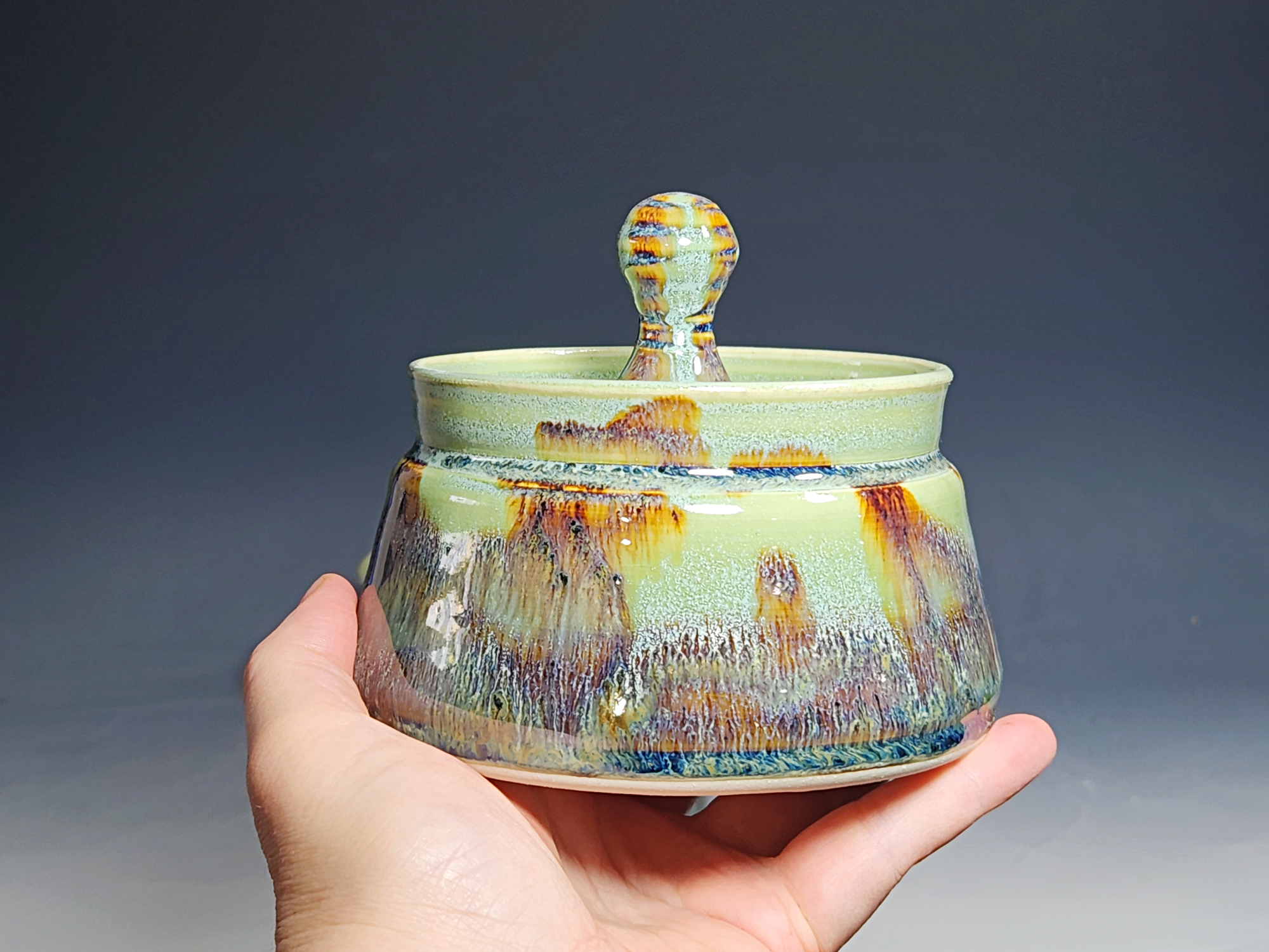 This hand-thrown ceramic lidded jar holds all the things! Tea, cookies, keepsakes, anything you want to stash! Rich, variegated glaze combination, “Sea Foam,” glows and highlights the texture of the well-made form. Makes a great birthday, housewarming, or Christmas gift.