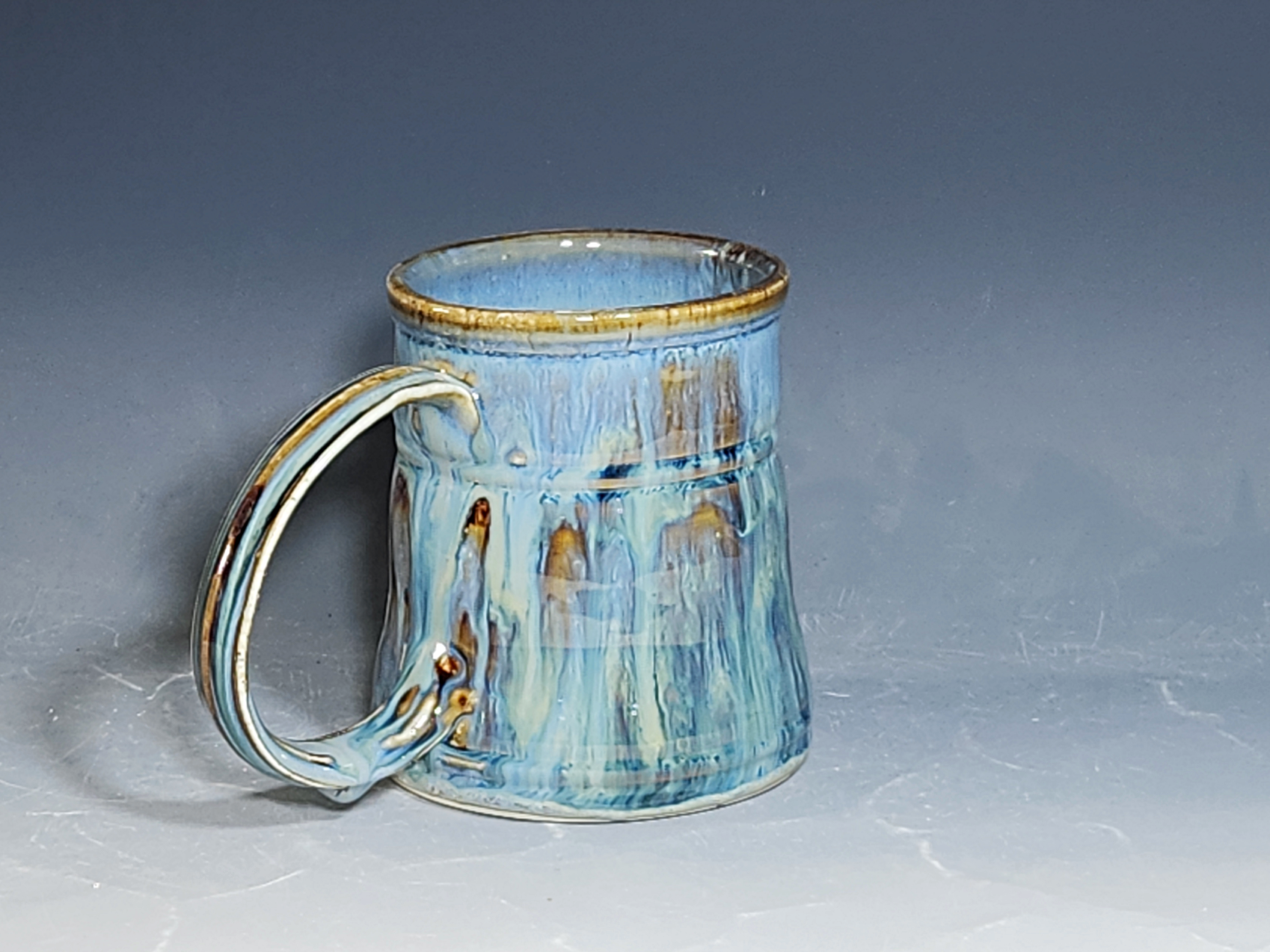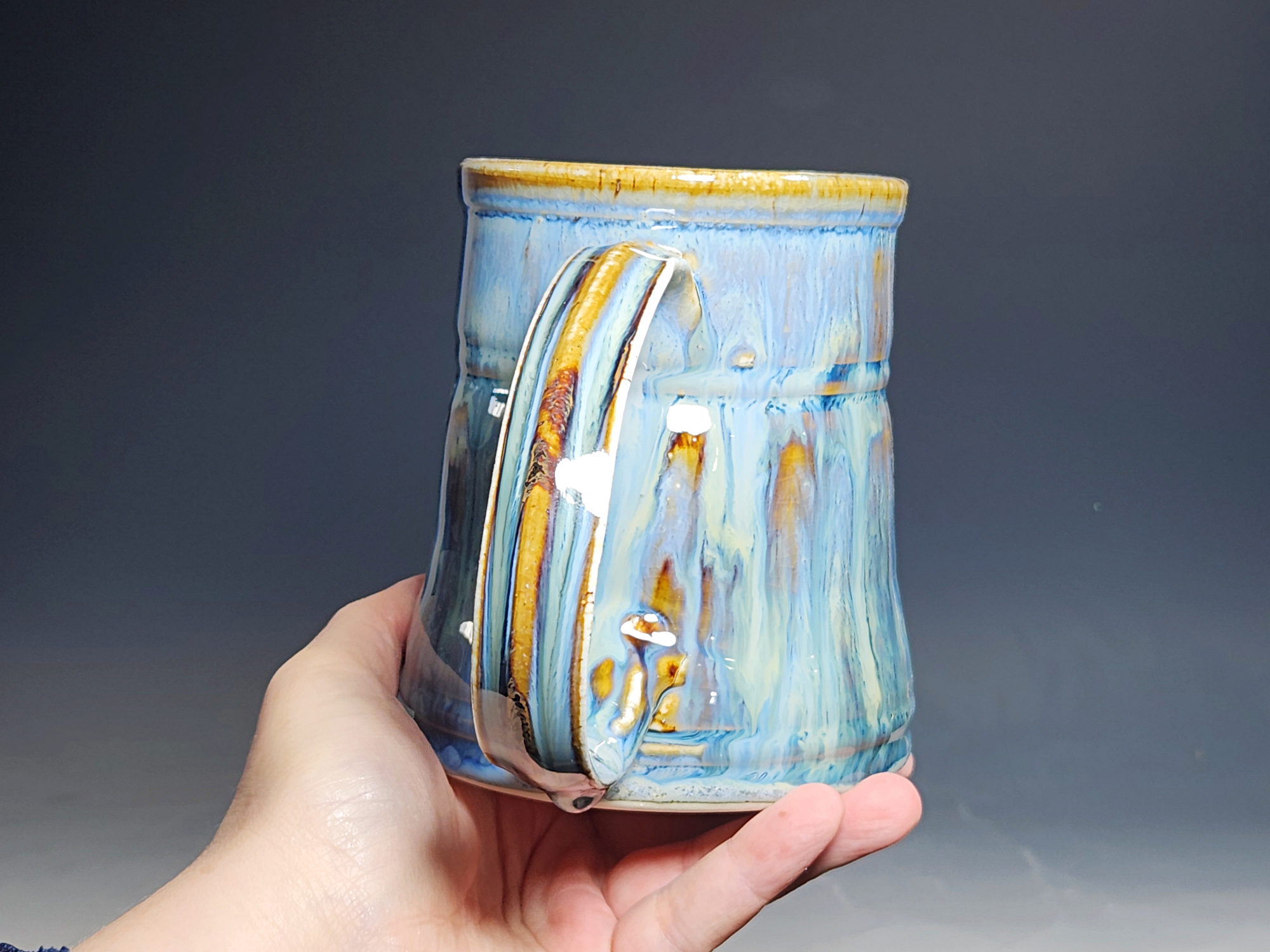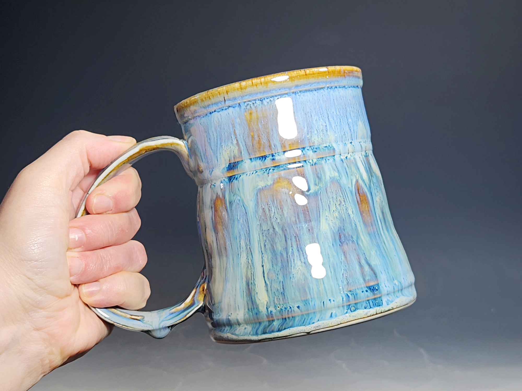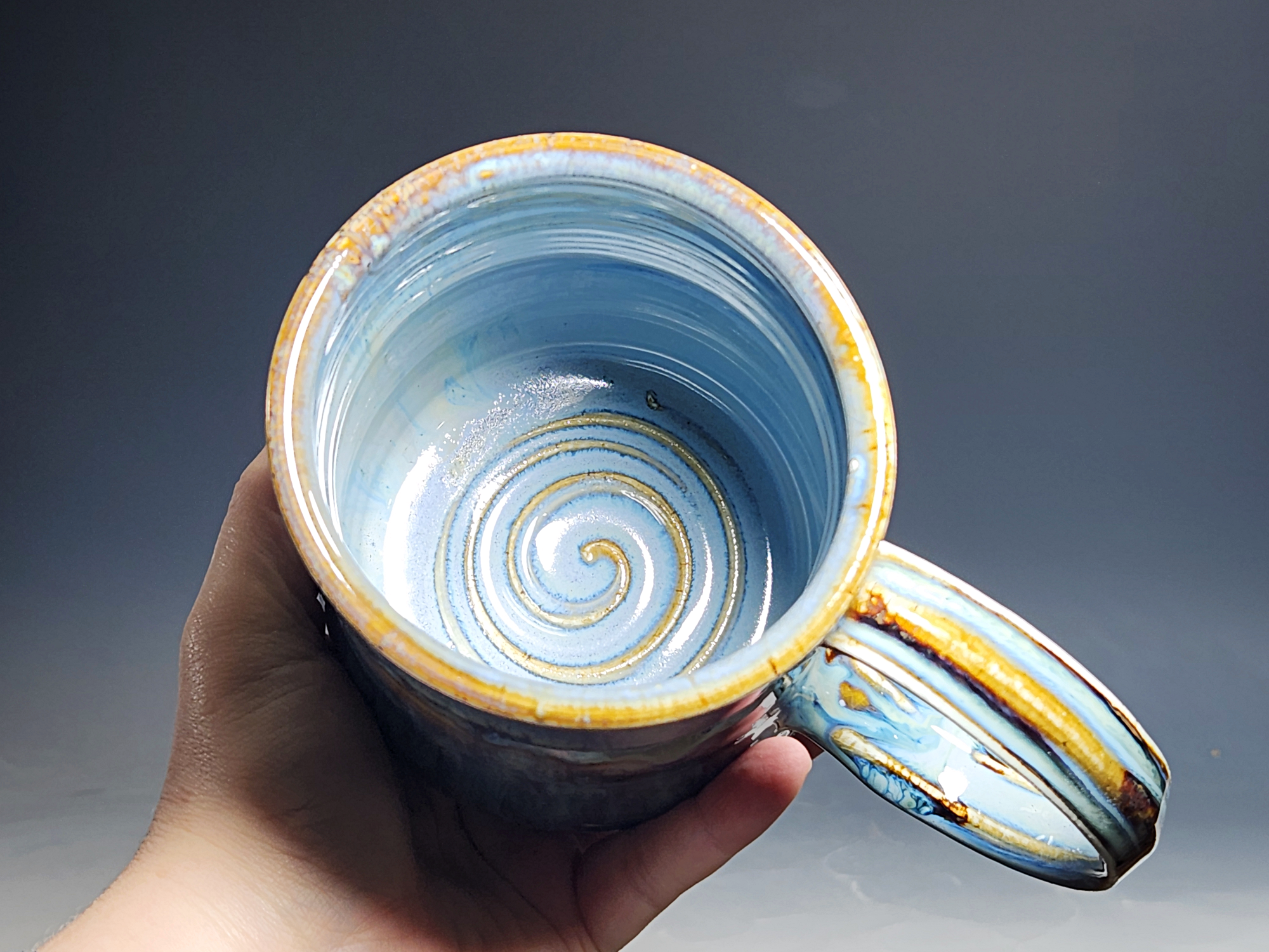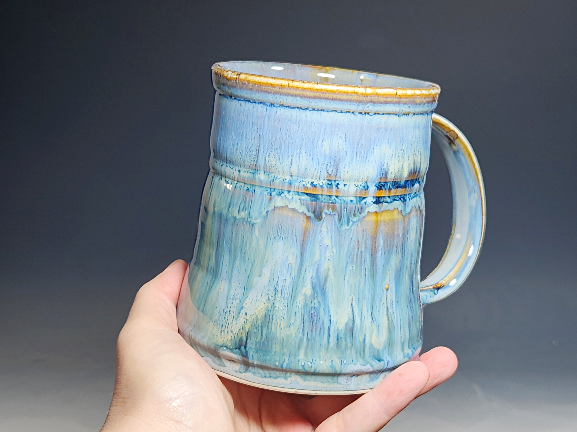 This piece is what I call a “beautiful second,” flawed, but still safe, functional, and beautiful. Fall into this glaze while you break for a cuppa! The thick, sturdy handle allows for greater comfort for your grip, and better leverage. Luxurious way to drink your morning coffee, afternoon tea, or evening beer.