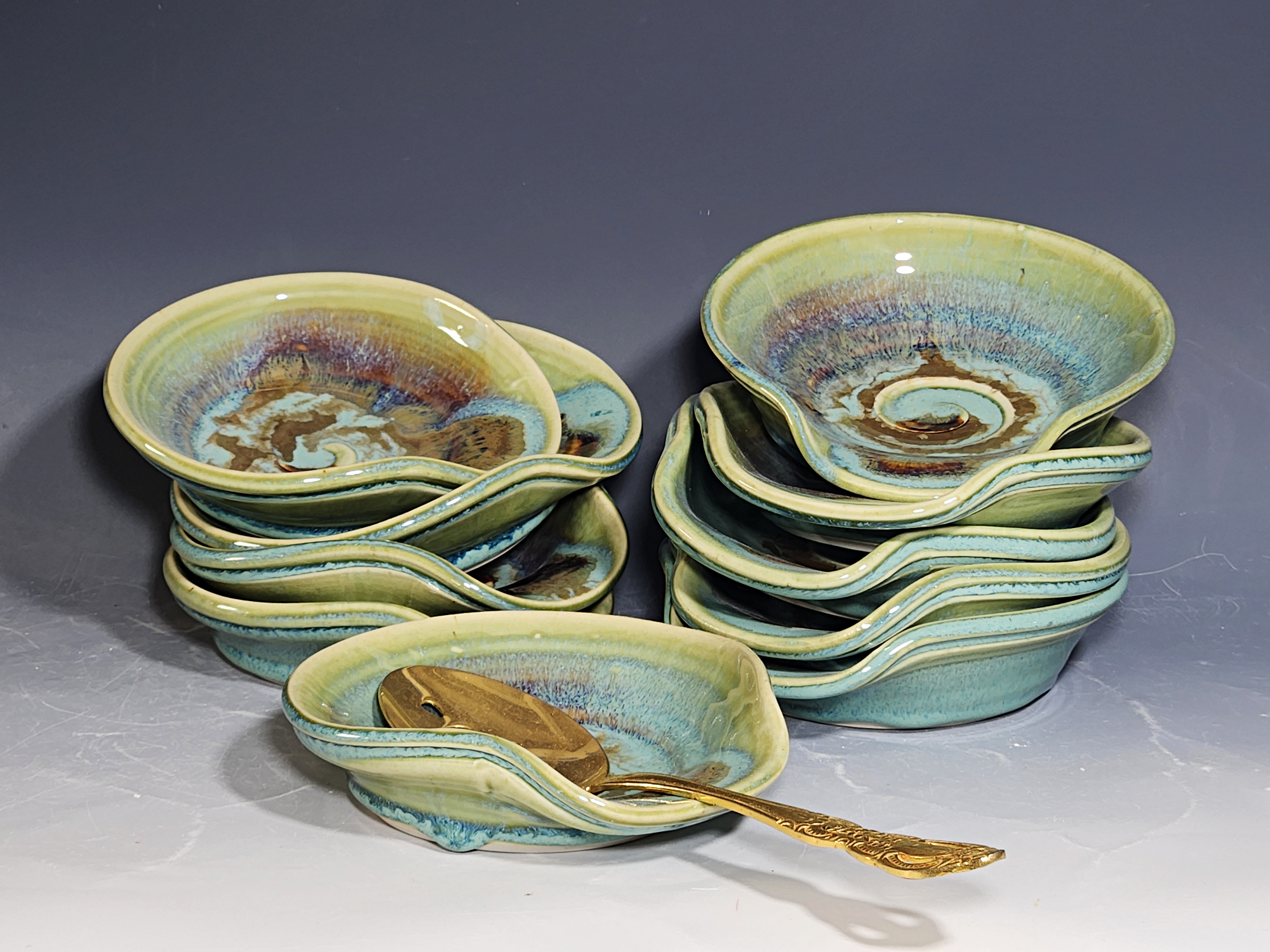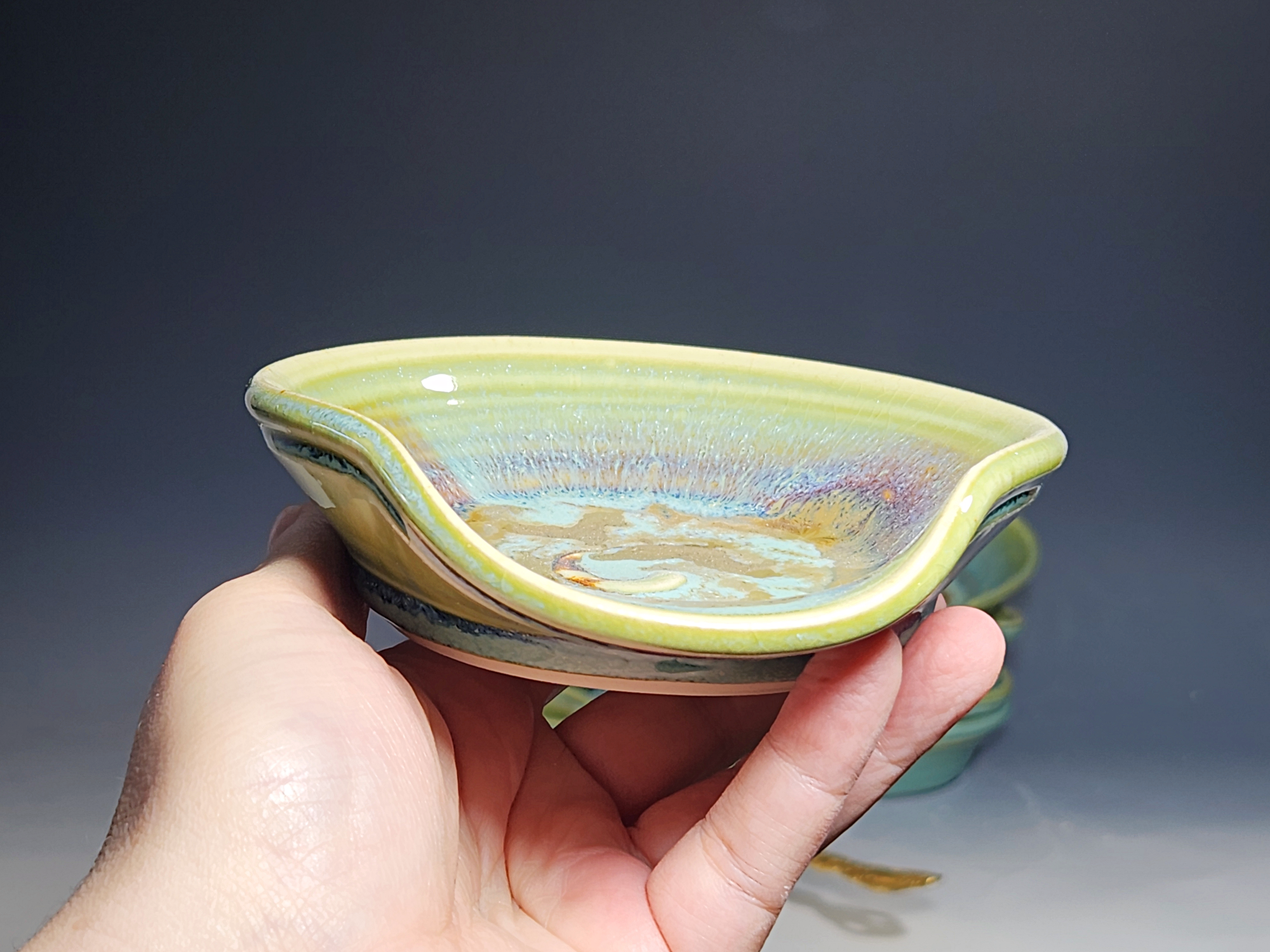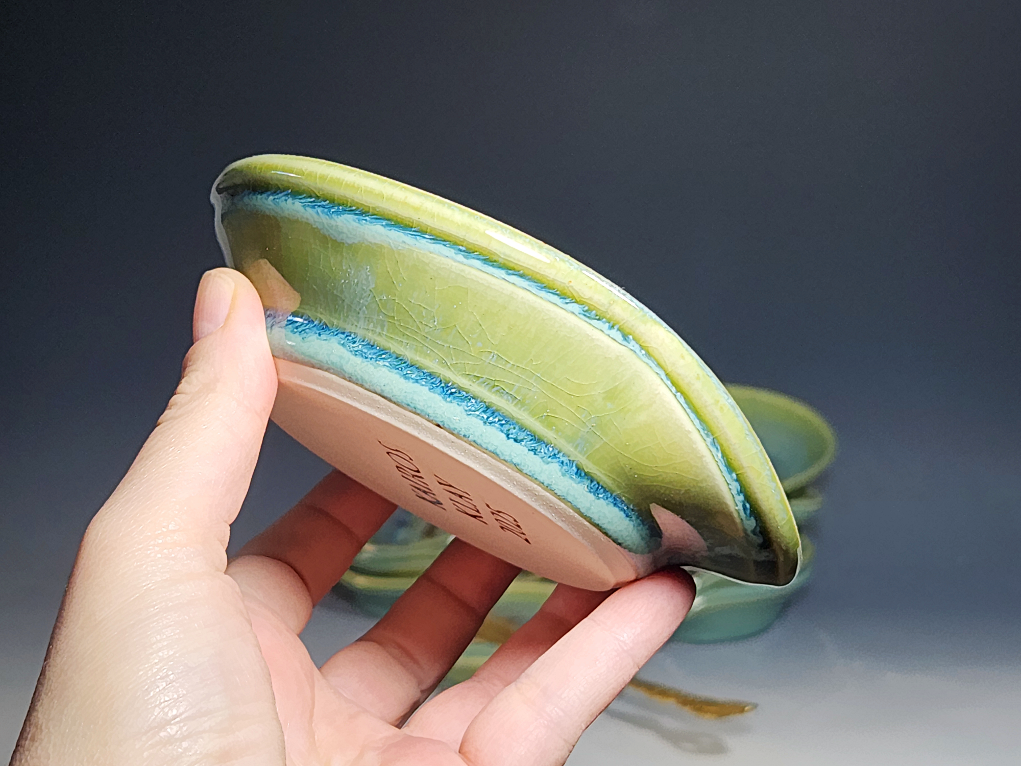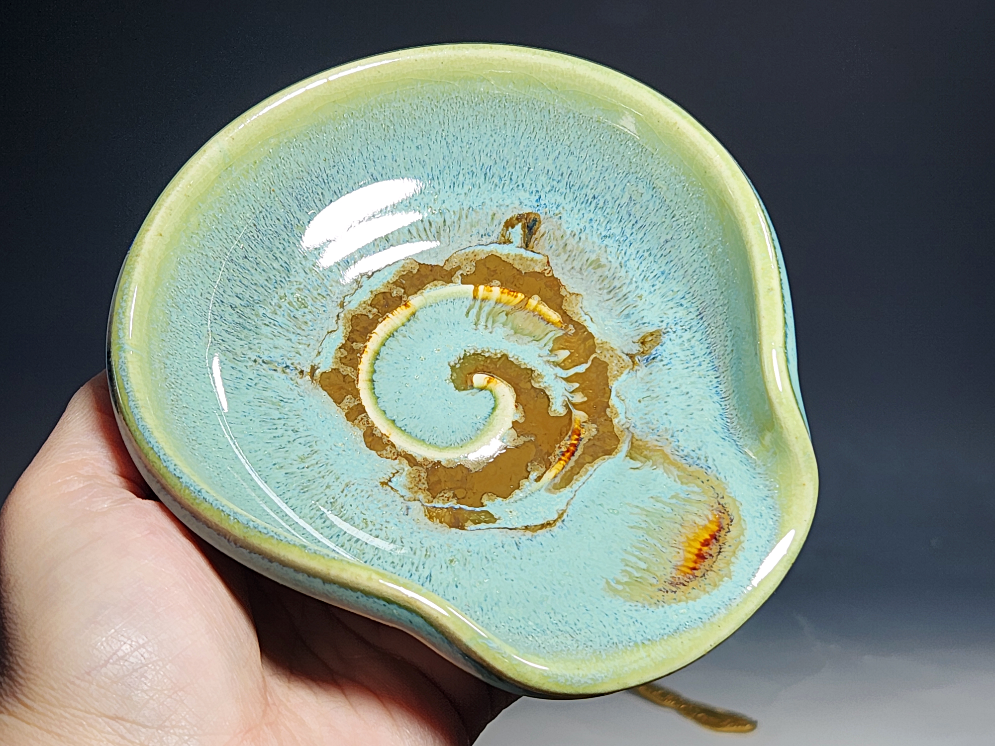 These pieces are what I call “beautiful seconds,” flawed, but still safe, functional, and beautiful. Brighten up your cooking! This hand-thrown pottery spoon or ladle rest is all dressed up in my glaze combination, “Caribbean,” which consists of glazes I mix in-house. Great for use at the stove as a ladle rest or at the coffee pot.