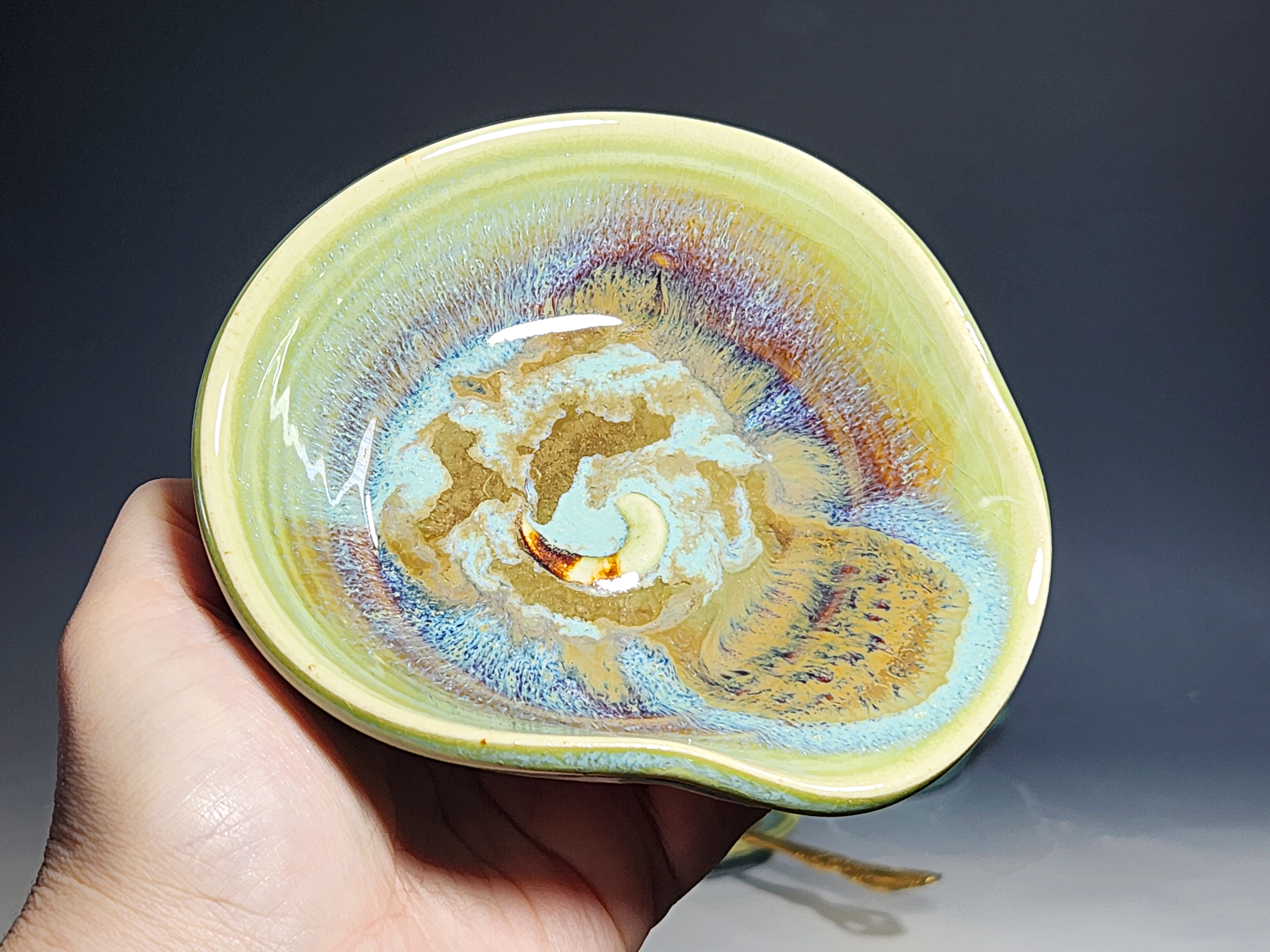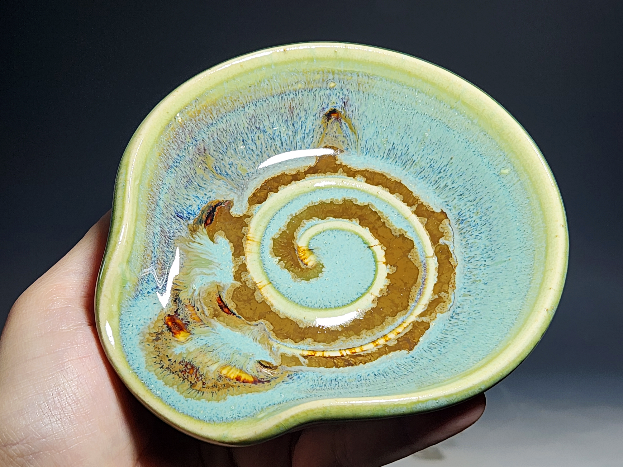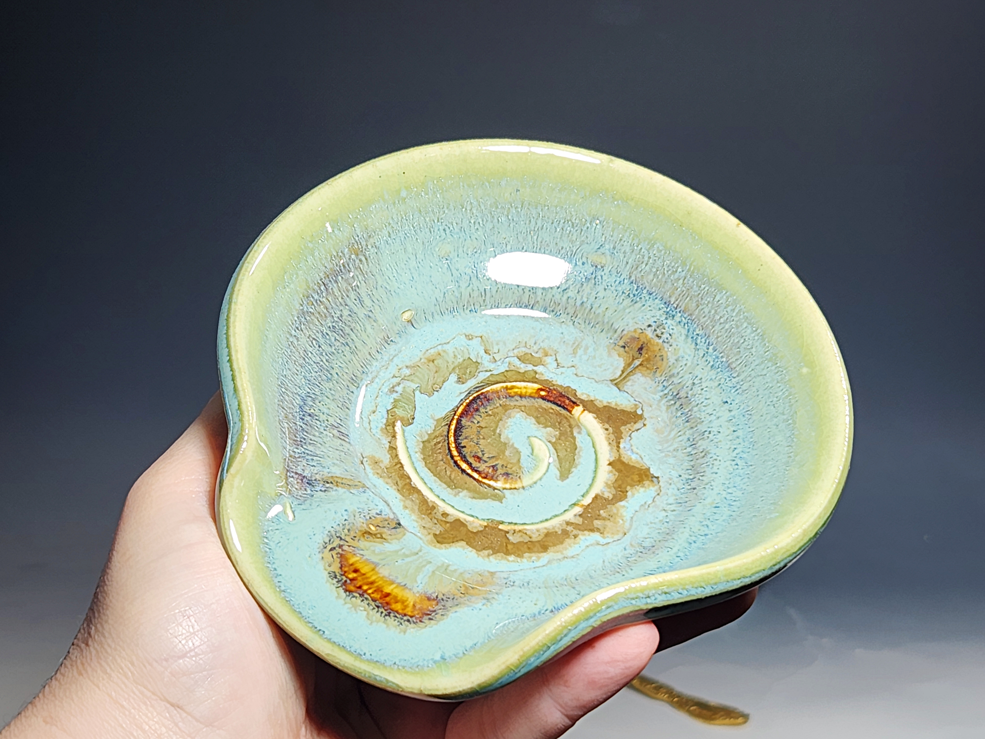 These pieces are what I call “beautiful seconds,” flawed, but still safe, functional, and beautiful. Brighten up your cooking! This hand-thrown pottery spoon or ladle rest is all dressed up in my glaze combination, “Caribbean,” which consists of glazes I mix in-house. Great for use at the stove as a ladle rest or at the coffee pot.