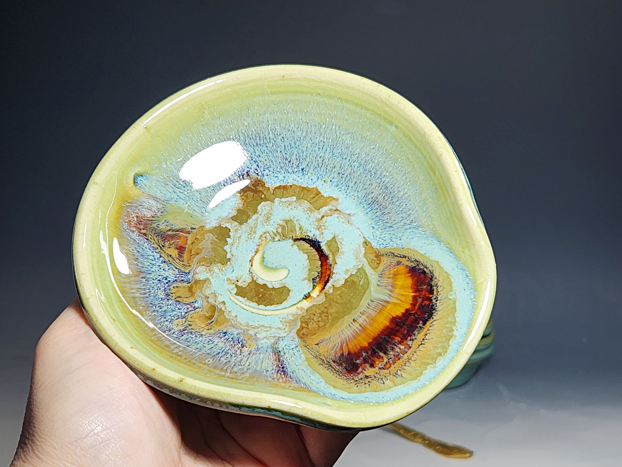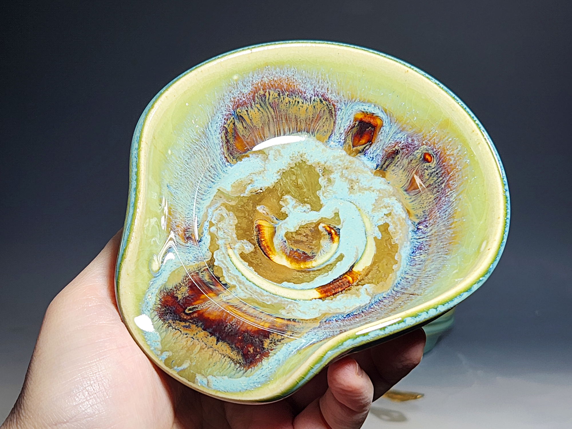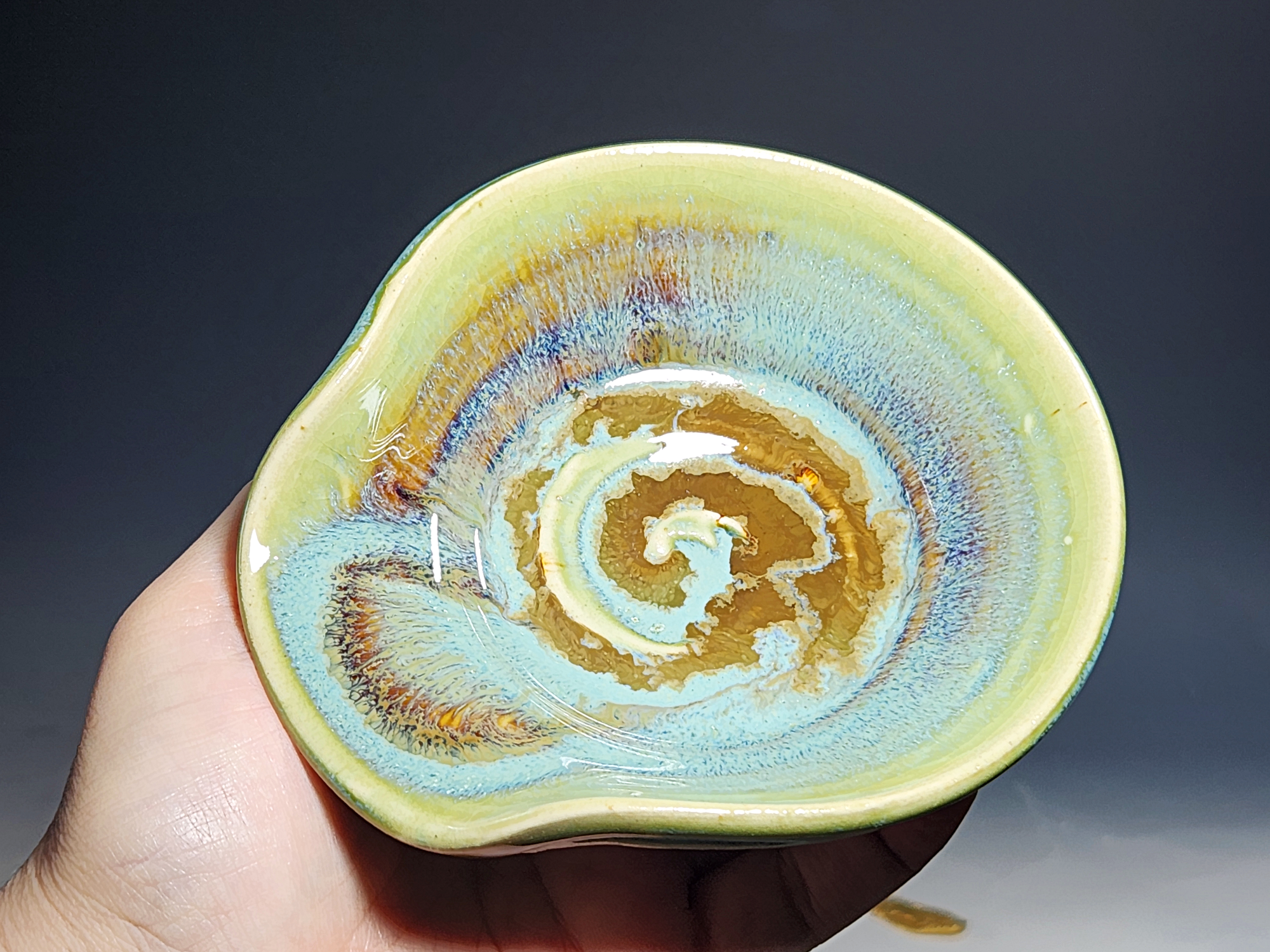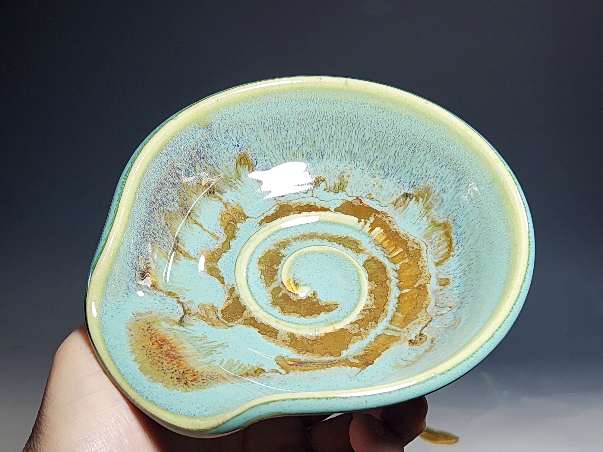 These pieces are what I call “beautiful seconds,” flawed, but still safe, functional, and beautiful. Brighten up your cooking! This hand-thrown pottery spoon or ladle rest is all dressed up in my glaze combination, “Caribbean,” which consists of glazes I mix in-house. Great for use at the stove as a ladle rest or at the coffee pot.