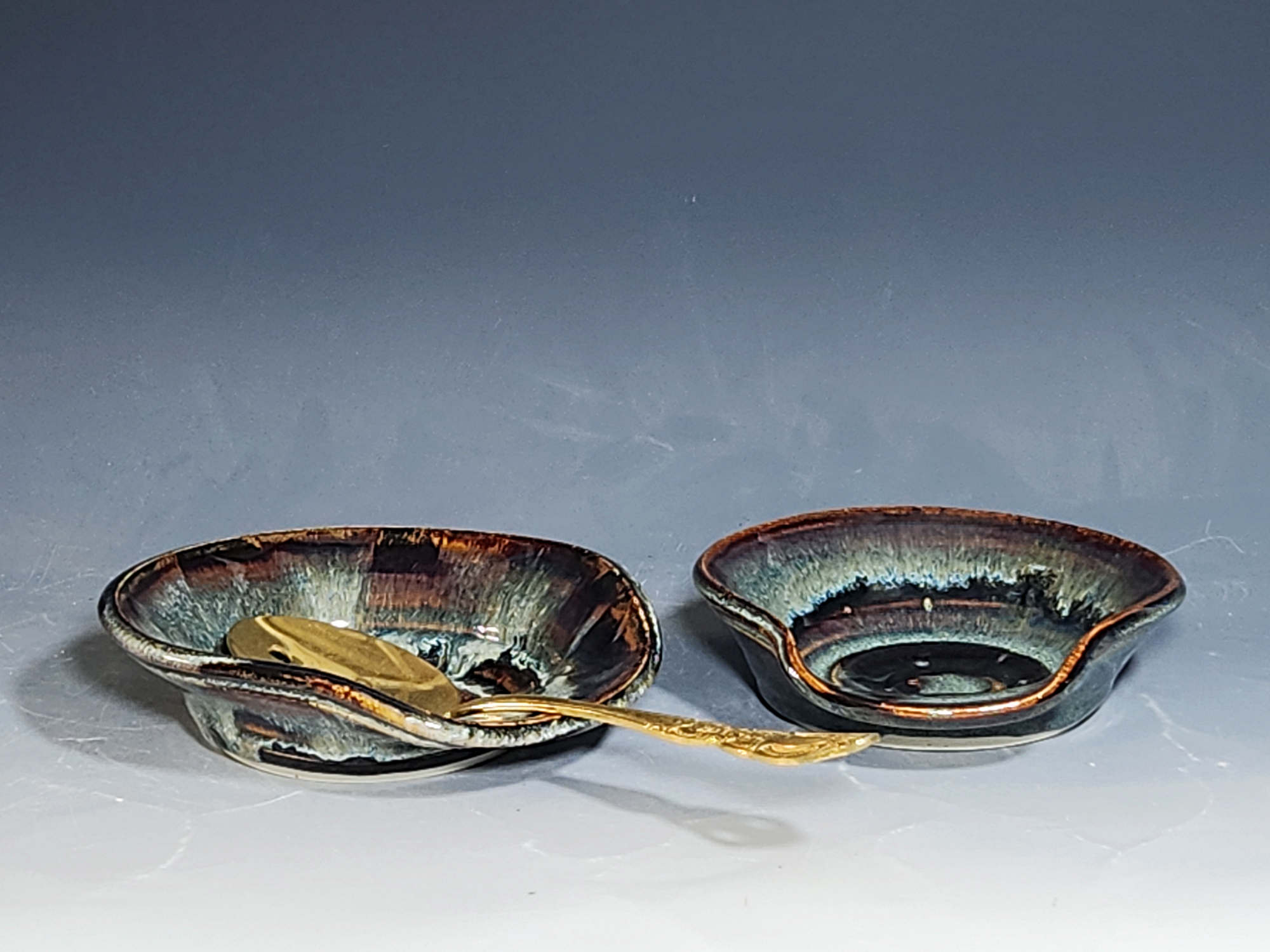These pieces are what I call “beautiful seconds,” flawed, but still safe, functional, and beautiful. Brighten up your cooking! These hand-thrown pottery spoon or ladle rests are all dressed up in glazes I mix in-house. Great for use at the stove as a ladle rest or at the coffee pot.