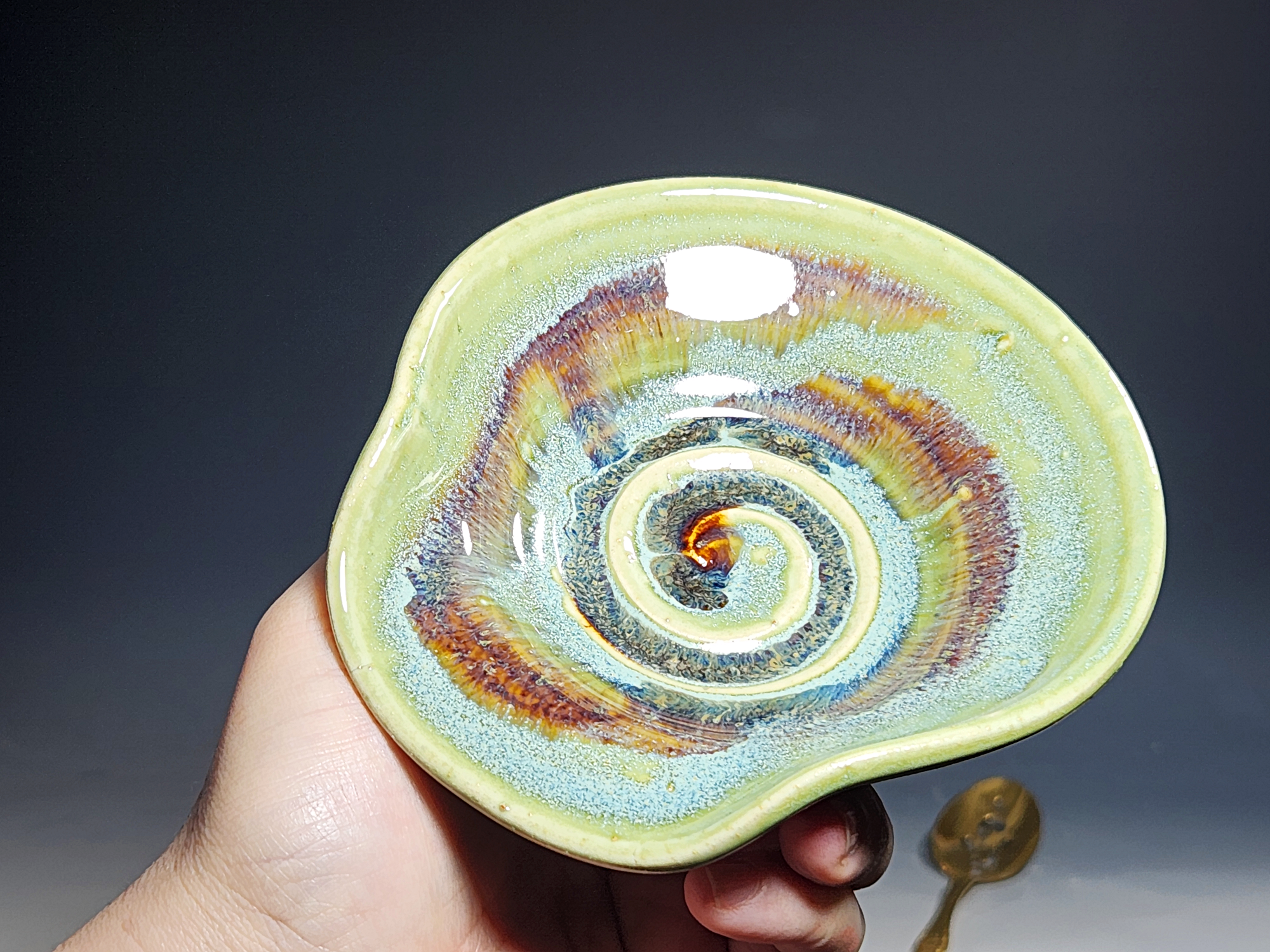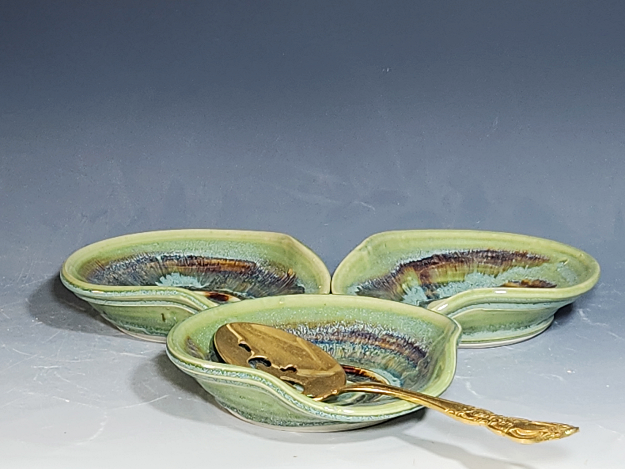 These pieces are what I call “beautiful seconds,” flawed, but still safe, functional, and beautiful. Brighten up your cooking! Great for use at the stove as a ladle rest or at the coffee pot.