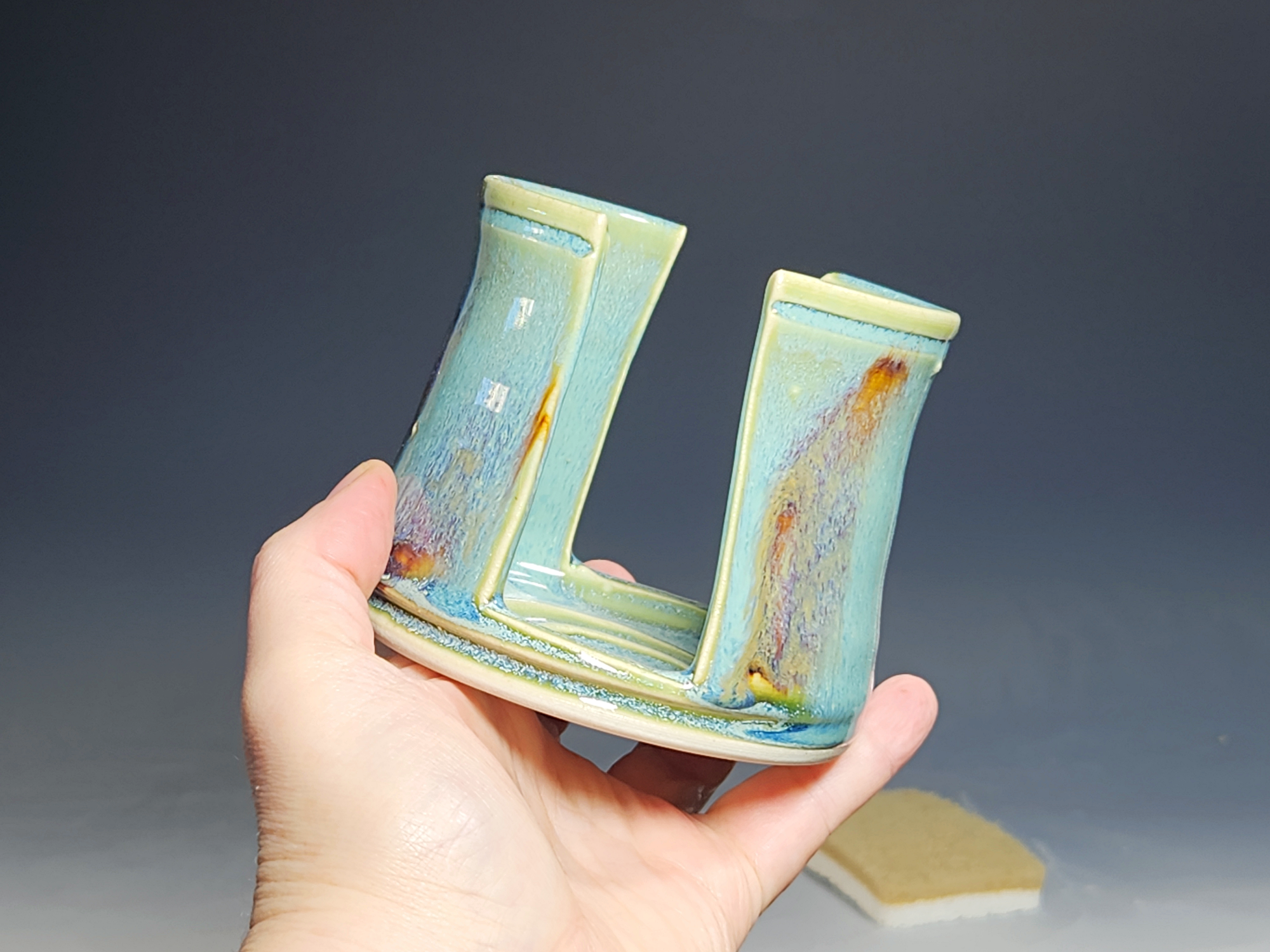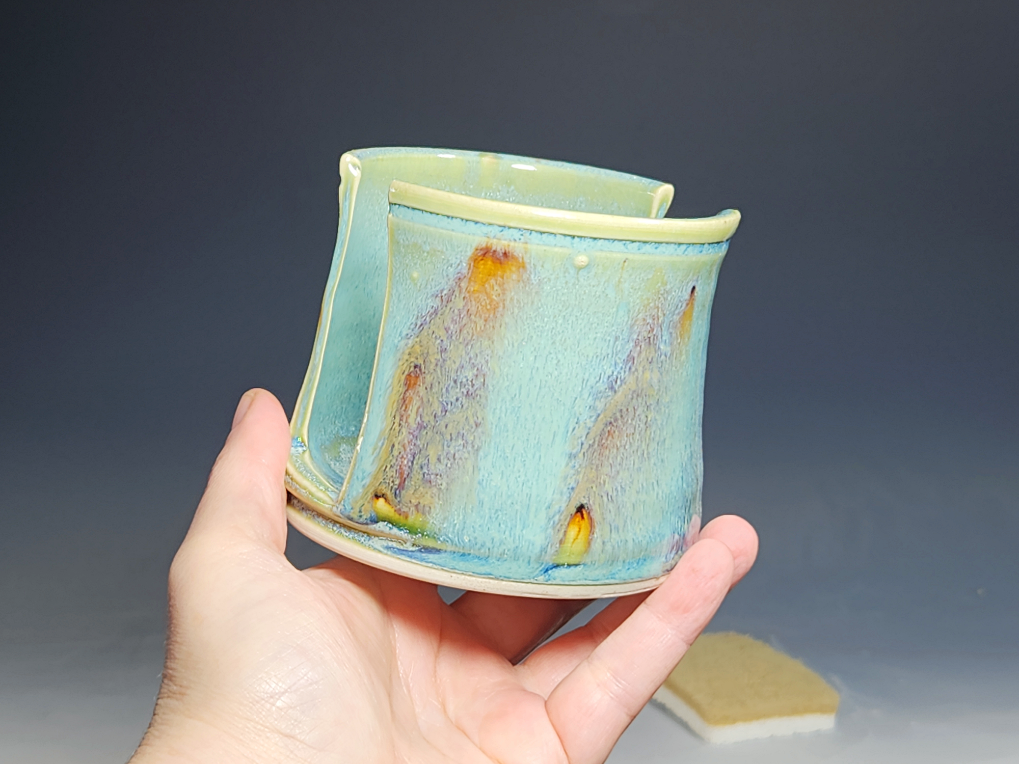 These pieces are what I call “beautiful seconds,” flawed, but still safe, functional, and beautiful. Beautiful, functional ceramic kitchen sponge holder with a rich, variegated glaze is designed to elevate your kitchen sponges and allow them as much air flow as possible to dry faster and discourage the growth of bacteria. Helps keep your sink area organized and beautiful.