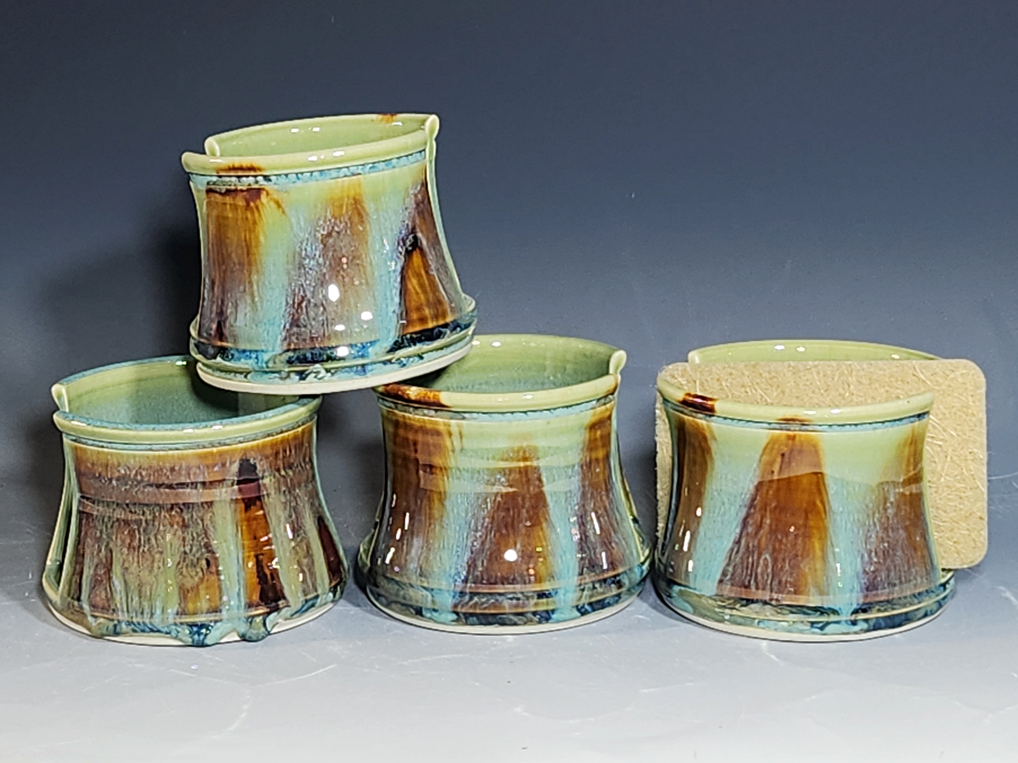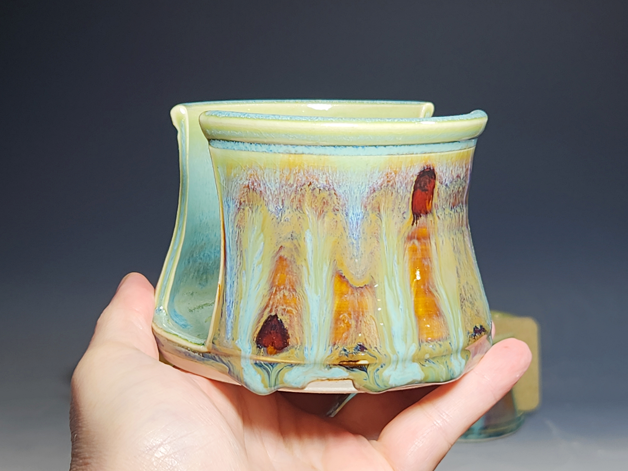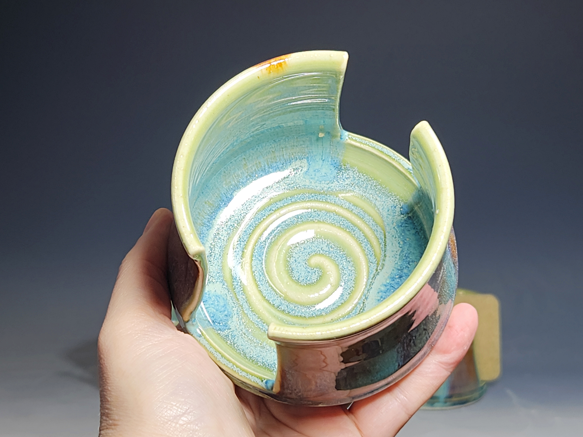 These pieces are what I call “beautiful seconds,” flawed, but still safe, functional, and beautiful. All dressed up in my most popular glaze combination, “Caribbean,” this hand-thrown pottery sponge holder is an eye catcher! Beautiful, functional ceramic kitchen sponge holder with a rich, variegated glaze is designed to elevate your kitchen sponges and allow them as much air flow as possible to dry faster and discourage the growth of bacteria. Helps keep your sink area organized and beautiful.
