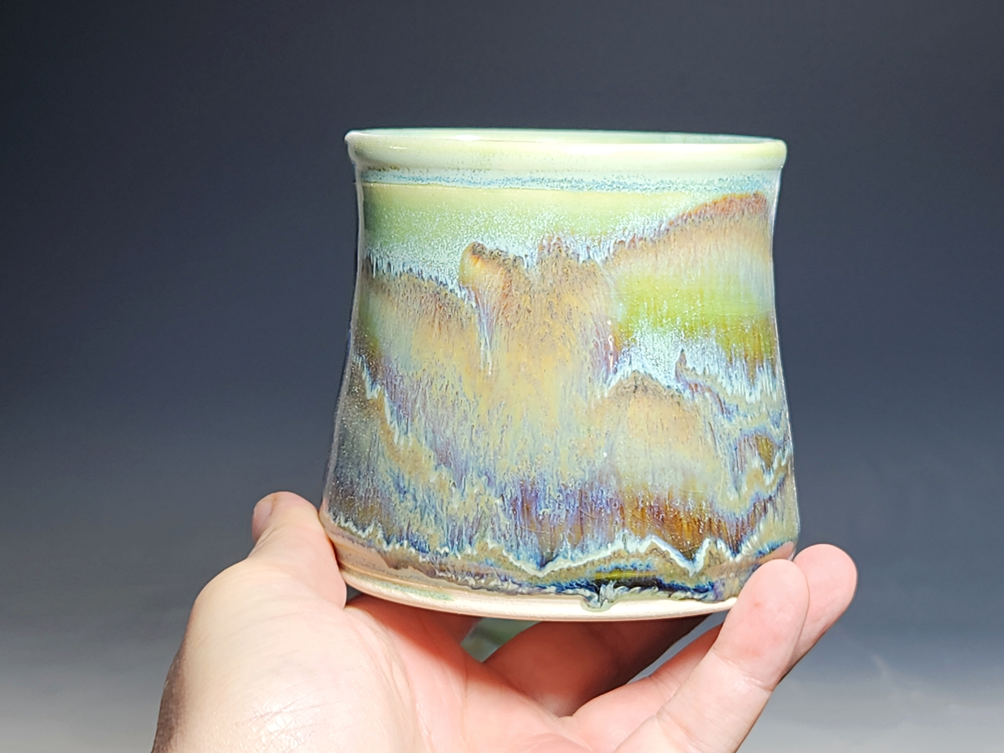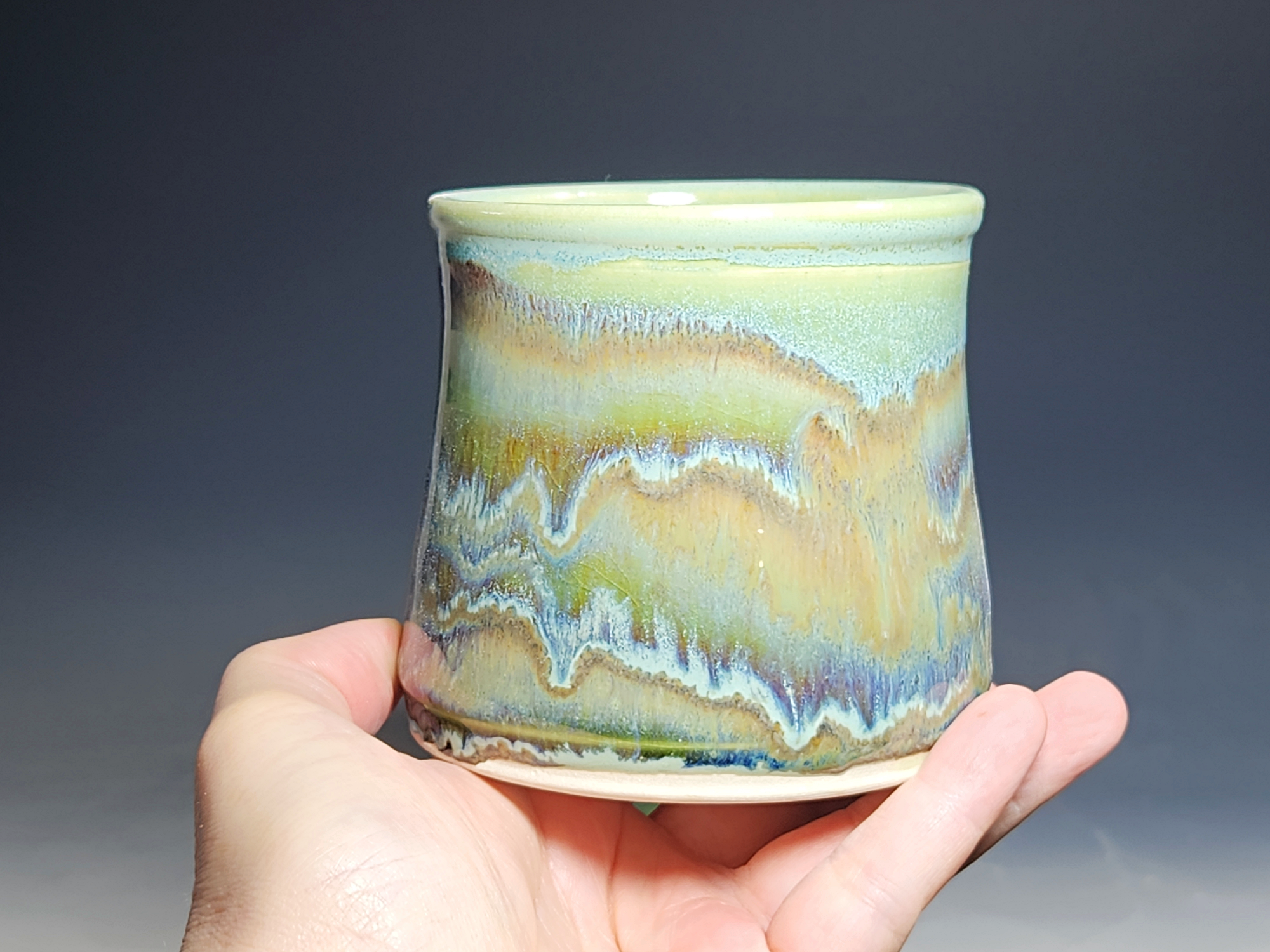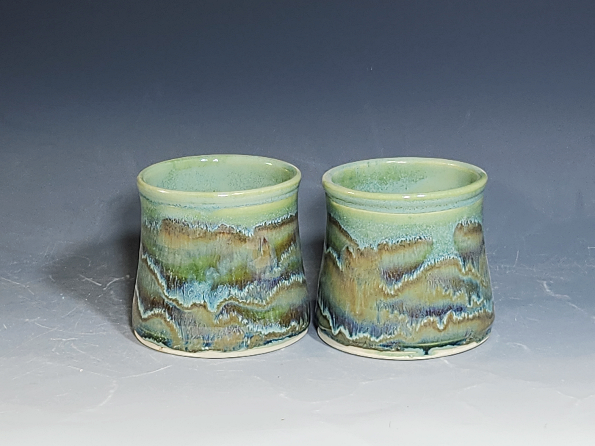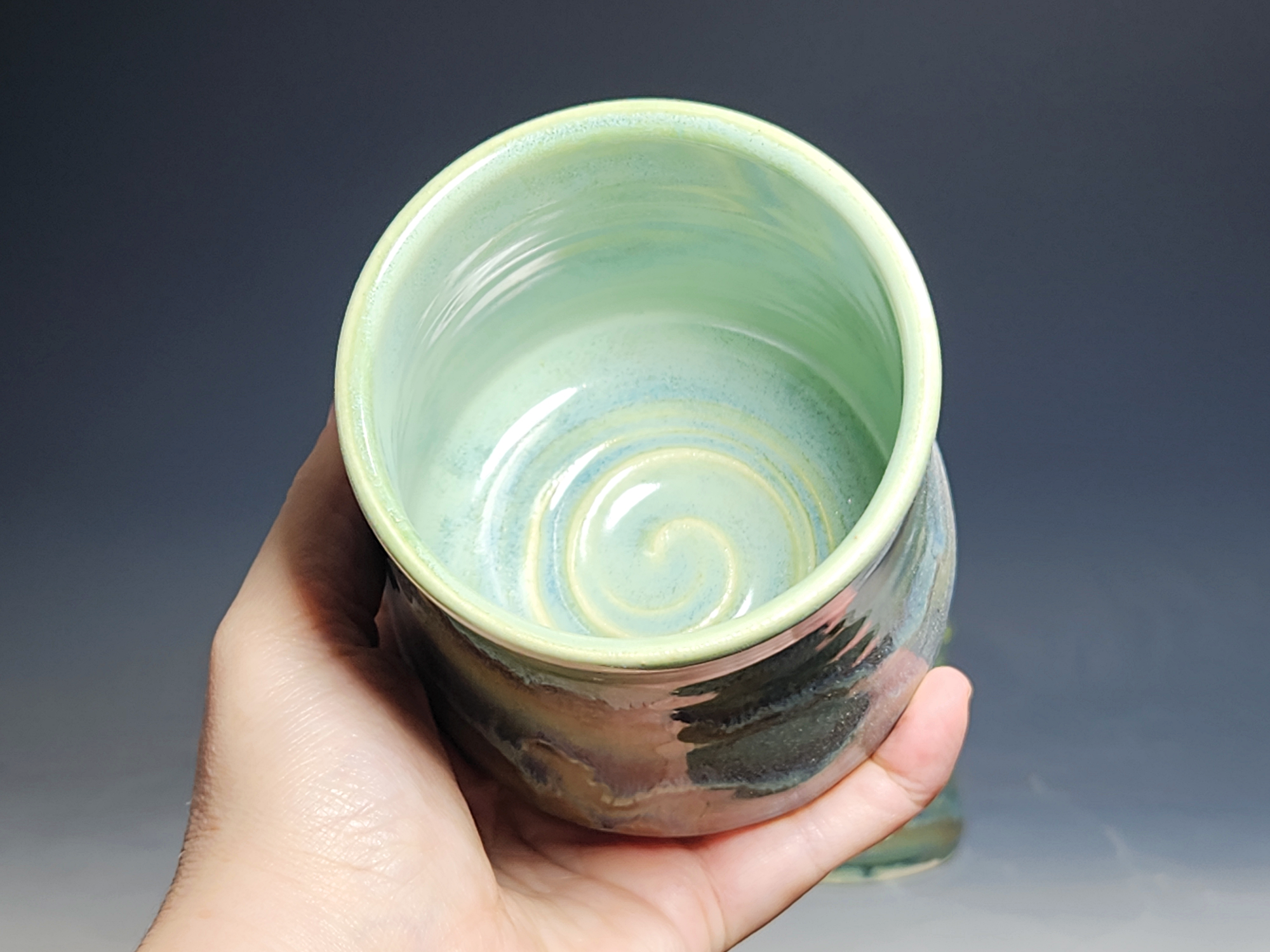 These pieces are what I call “beautiful seconds,” flawed, but still safe, functional, and beautiful. These little tumblers are all dressed up in my glaze combination, “Sea Foam.” These stemless wine cups are gorgeous! Sit perfectly in the hand. Rich, glossy glazing that practically glows from within. Beautiful conversation pieces or for a relaxing happy hour of solitude.